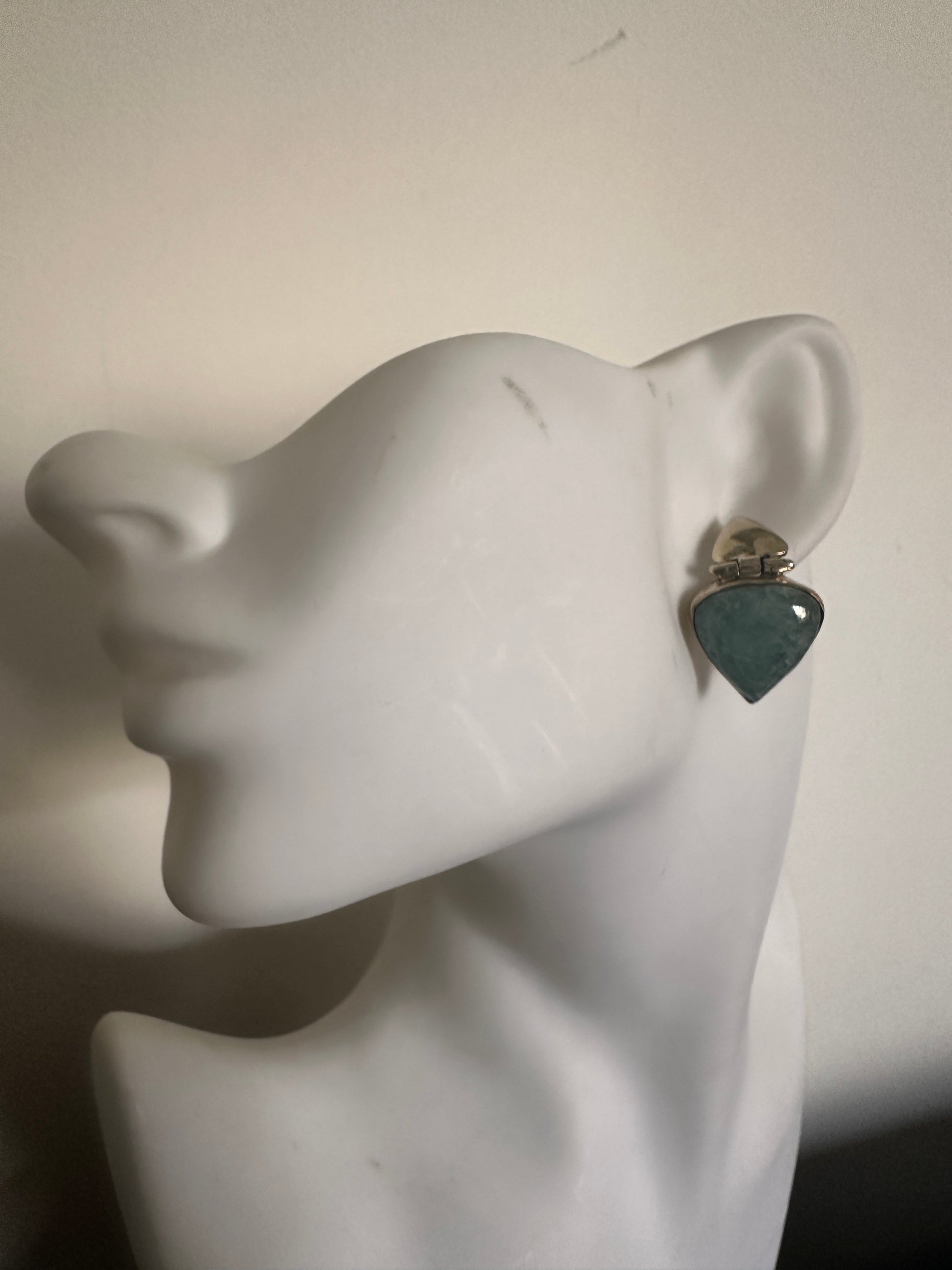 These unique earrings feature beautiful triangular amazonite stones, each carefully encased in sterling silver drops that hang elegantly from sterling silver love heart studs. The natural amazonite’s calming blue-green hues offer a subtle yet sophisticated touch, while the silver setting enhances durability and shine. Perfect for those seeking a one-of-a-kind accessory that blends natural beauty with expert craftsmanship.
