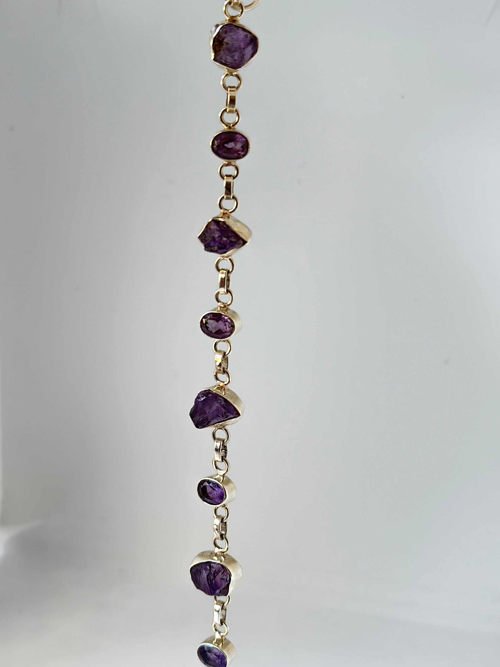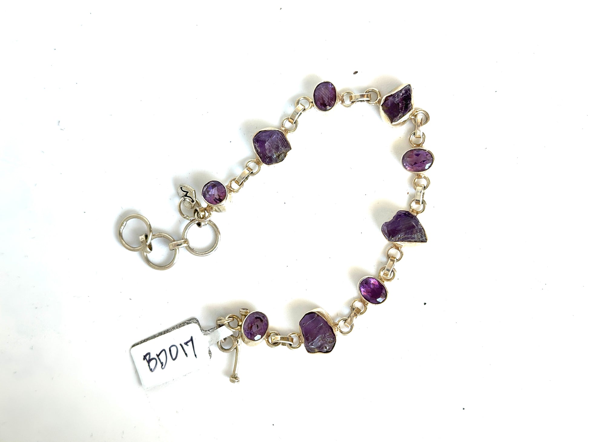 This 925 sterling silver bracelet features a combination of polished and raw amethyst, known for its calming and balancing properties. Amethyst is also believed to promote clarity, relaxation, and emotional wellbeing. Made with high quality materials, this bracelet is a stunning addition to any jewelry collection.