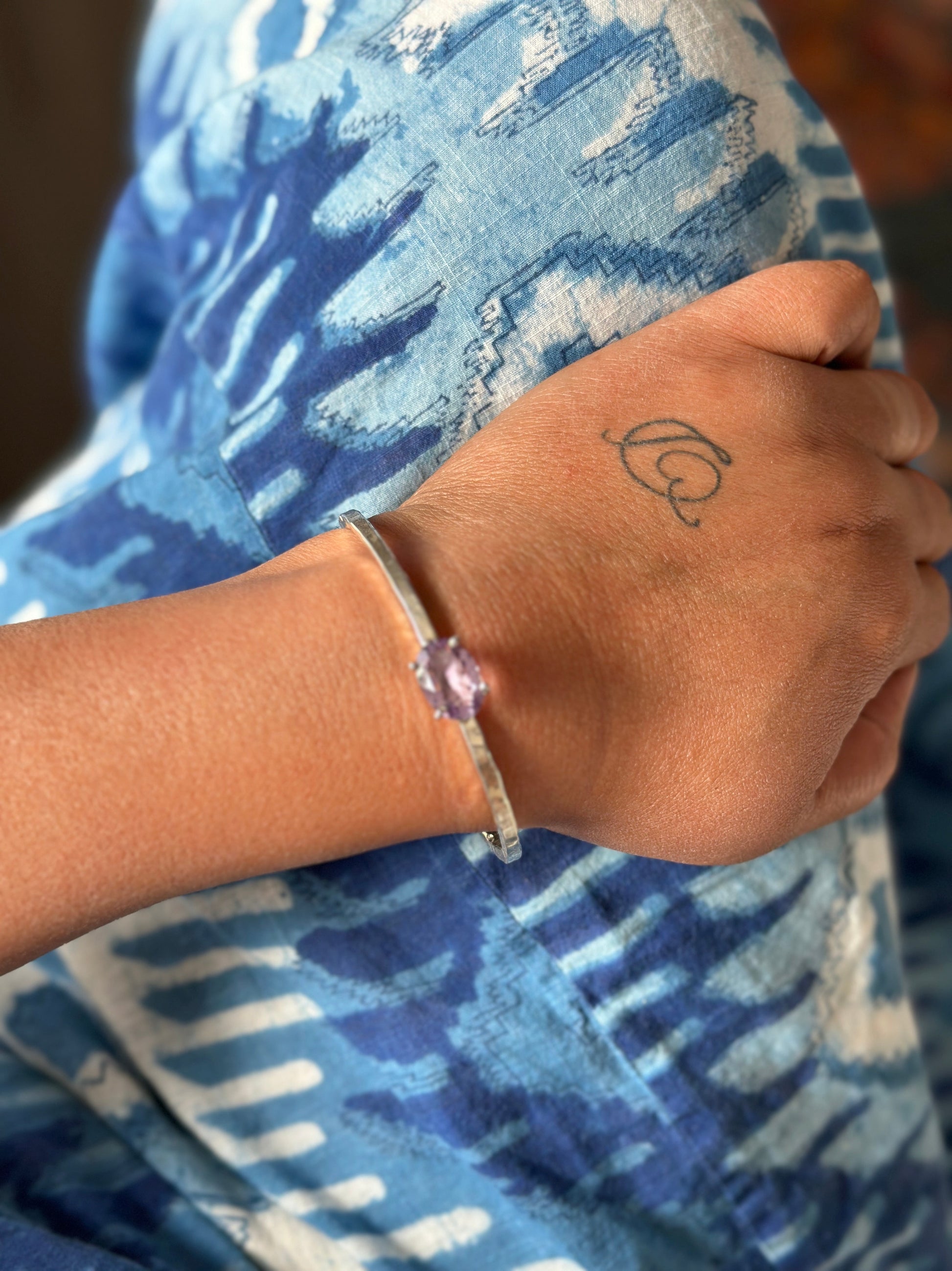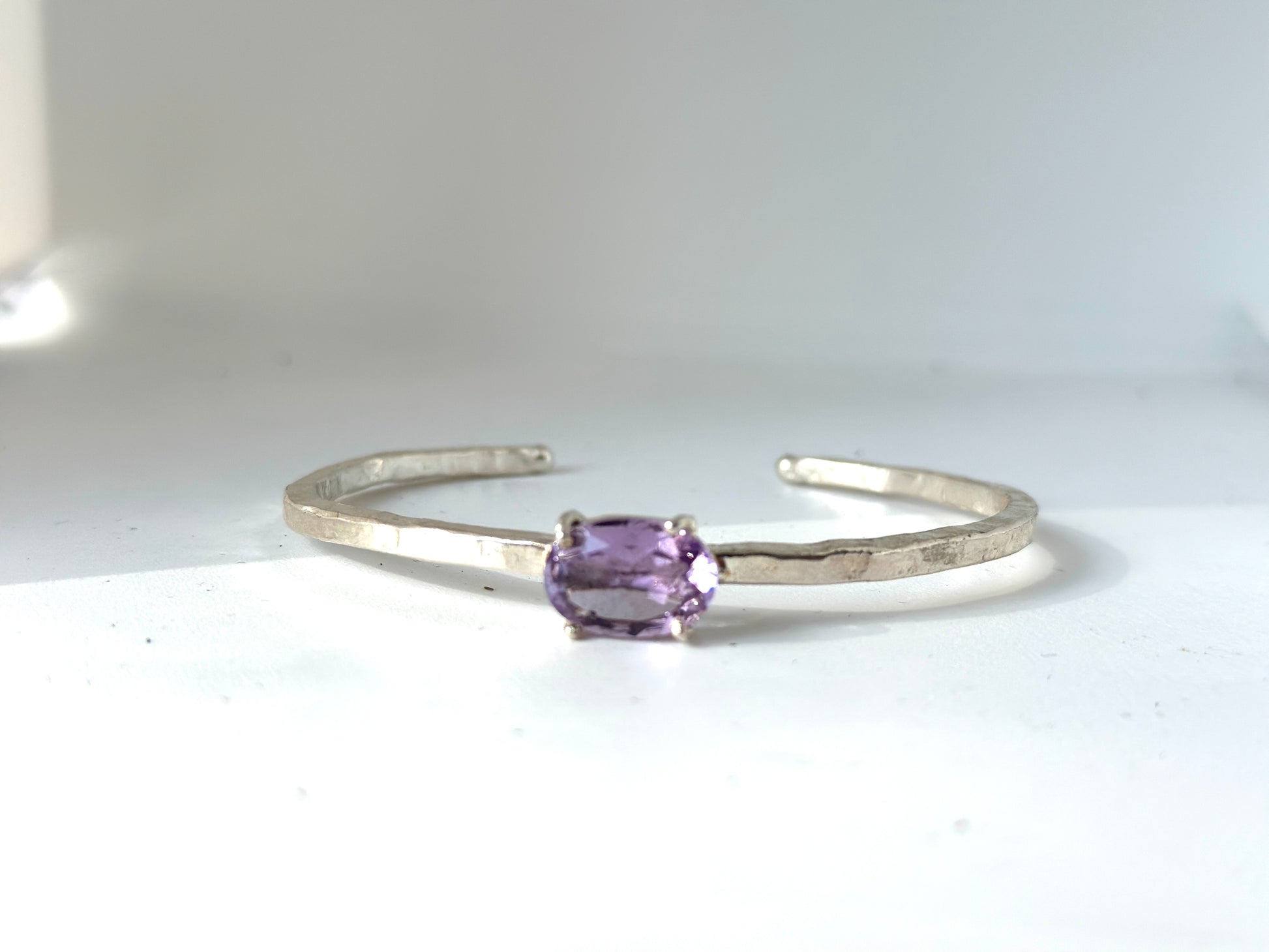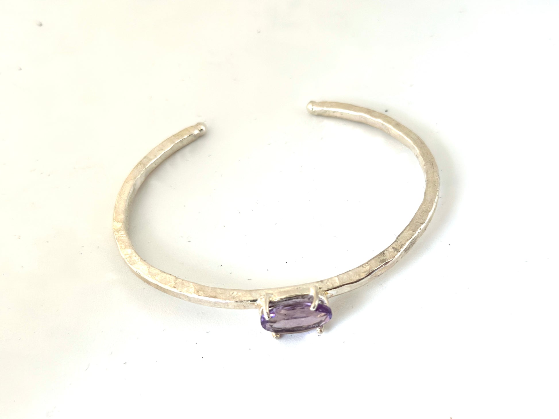 This 925 silver adjustable cuff is the perfect accessory for a minimalistic look. Featuring a single polished faceted amethyst, this piece adds a touch of elegance to any outfit. The adjustable design ensures a comfortable fit for all. Upgrade your style with the timeless beauty of amethyst.