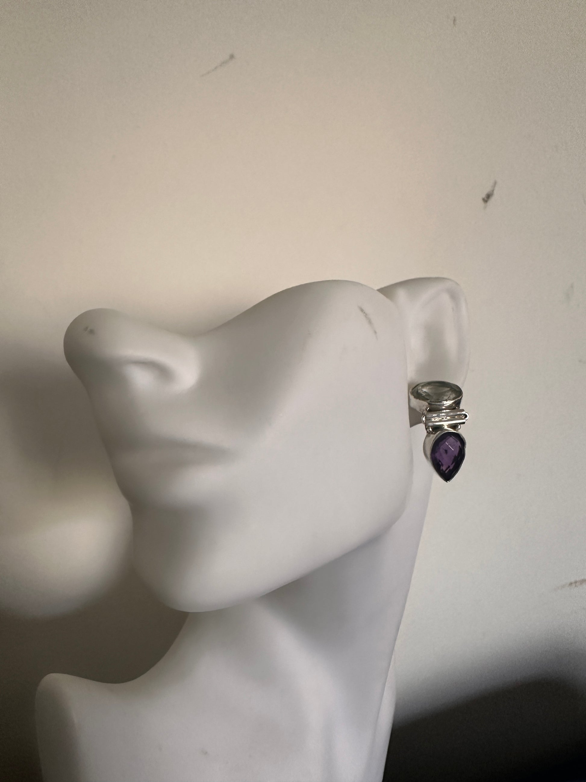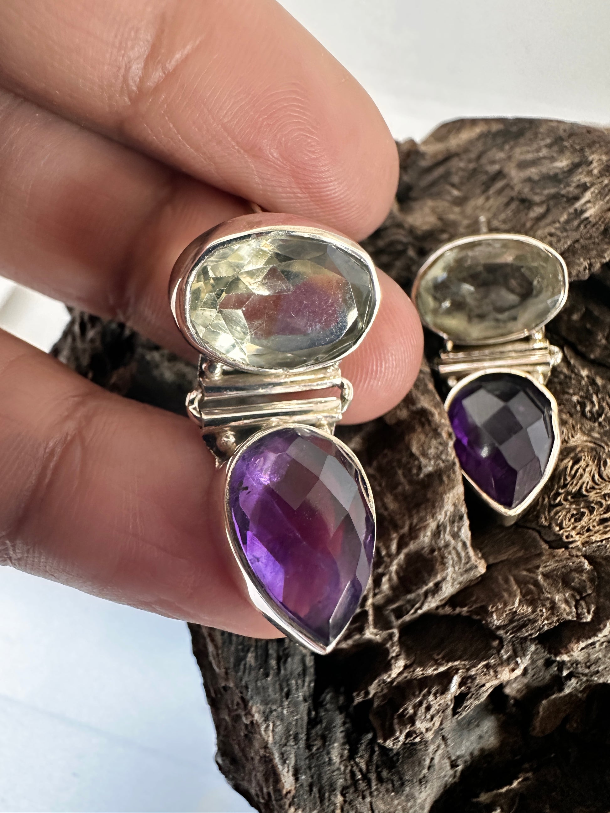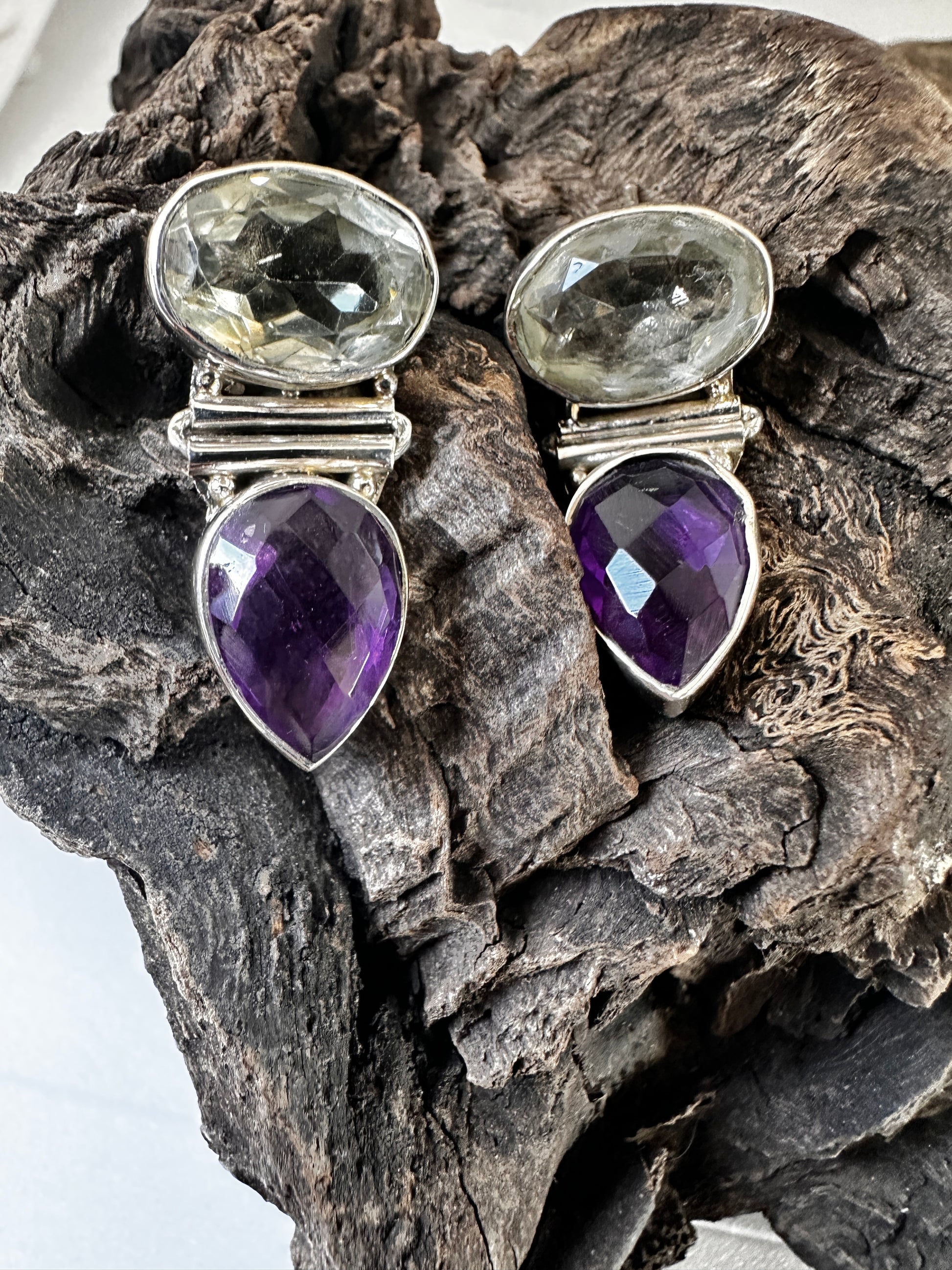 Elevate your elegance with these delicate sterling silver earrings featuring two distinct gemstone pairs: the serene green amethyst paired with rich purple amethyst, and the vibrant blue topaz set for a refined contrast. Expertly crafted, these statement earrings combine subtle sophistication with a touch of color, perfect for enhancing any ensemble with understated luxury.