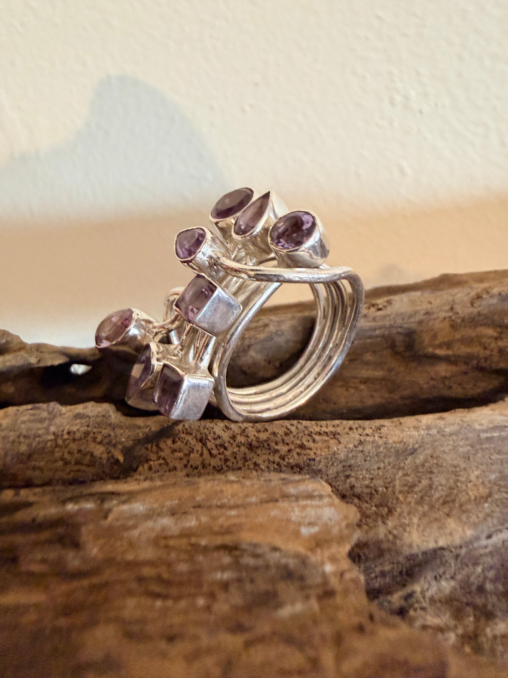 This handcrafted Amethyst Ring features multiple natural amethyst stones ,each uniquely cut and individually set in 925 sterling silver. The organic ,flowing silver design allows every stone to stand on its own, while coming together in a sculptural cluster that feels both earthy and refined.