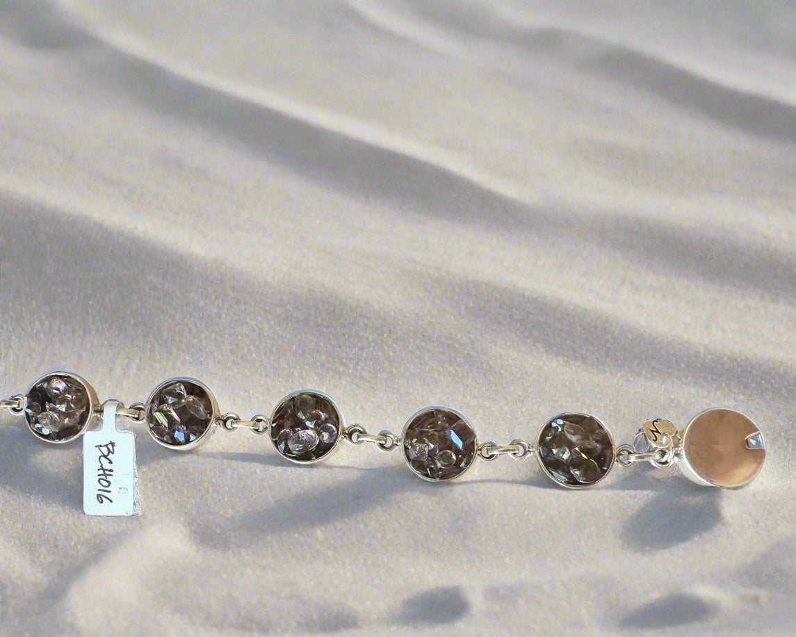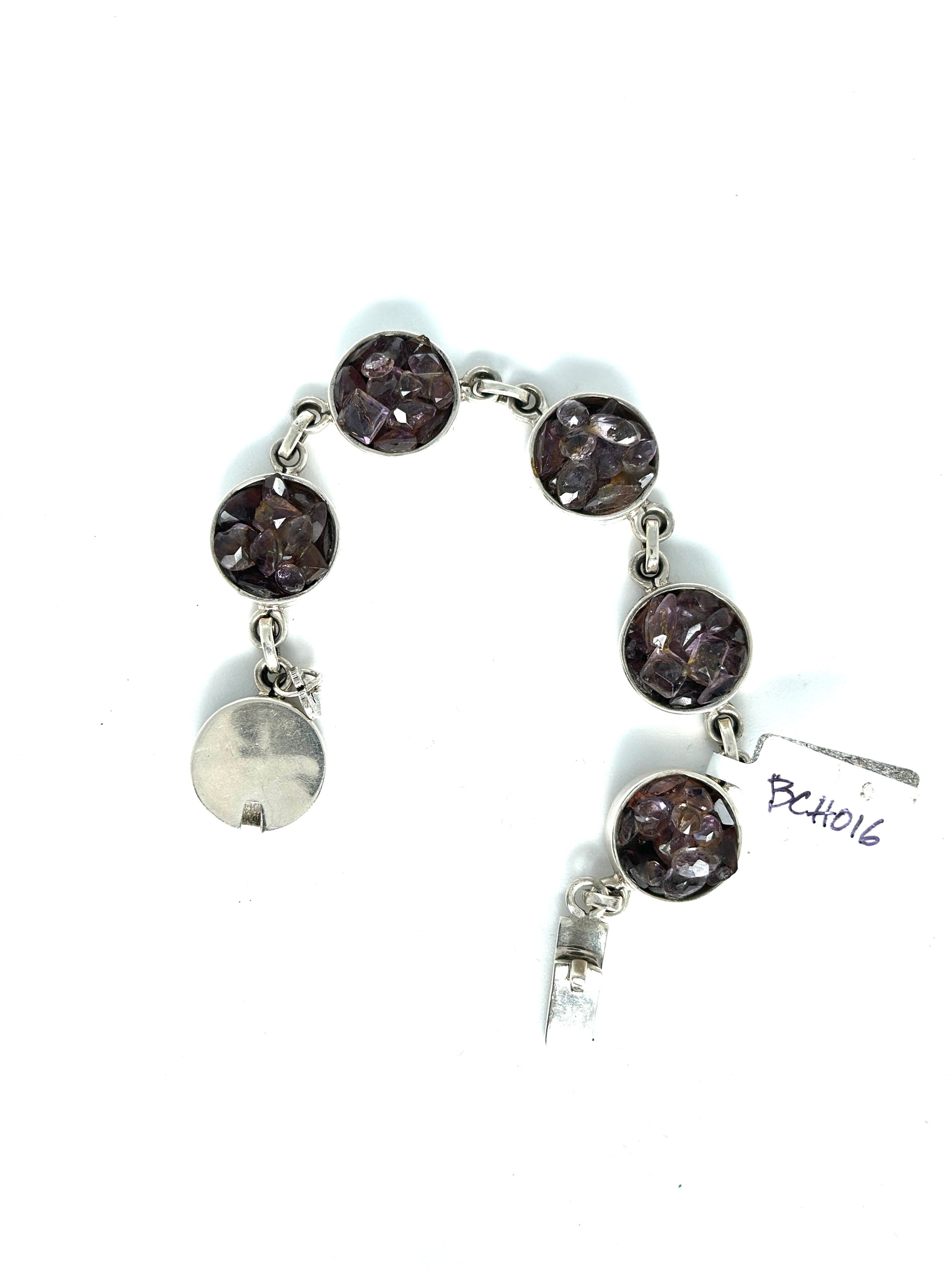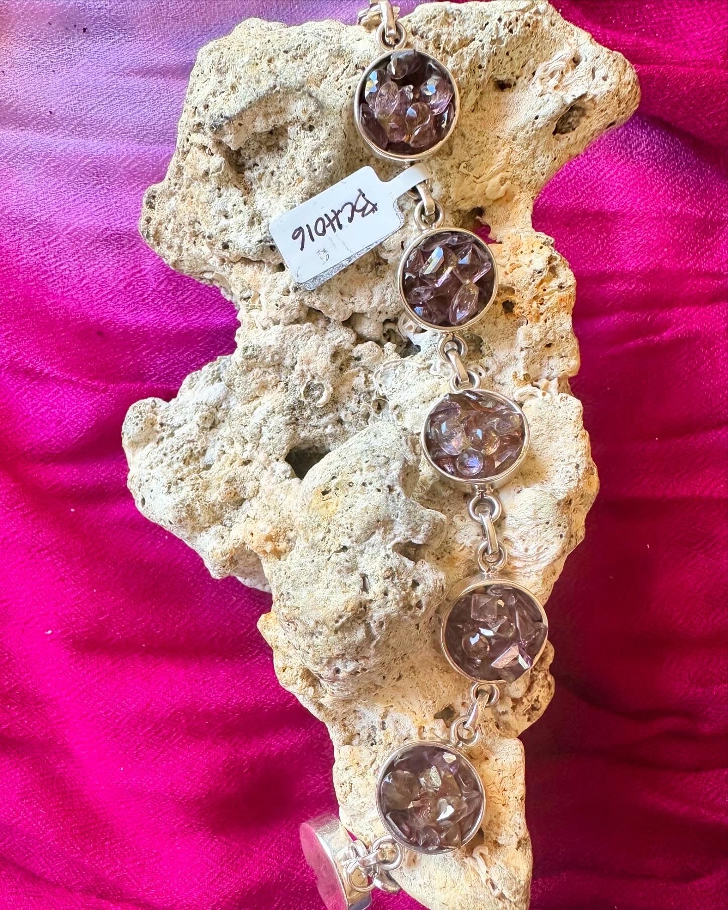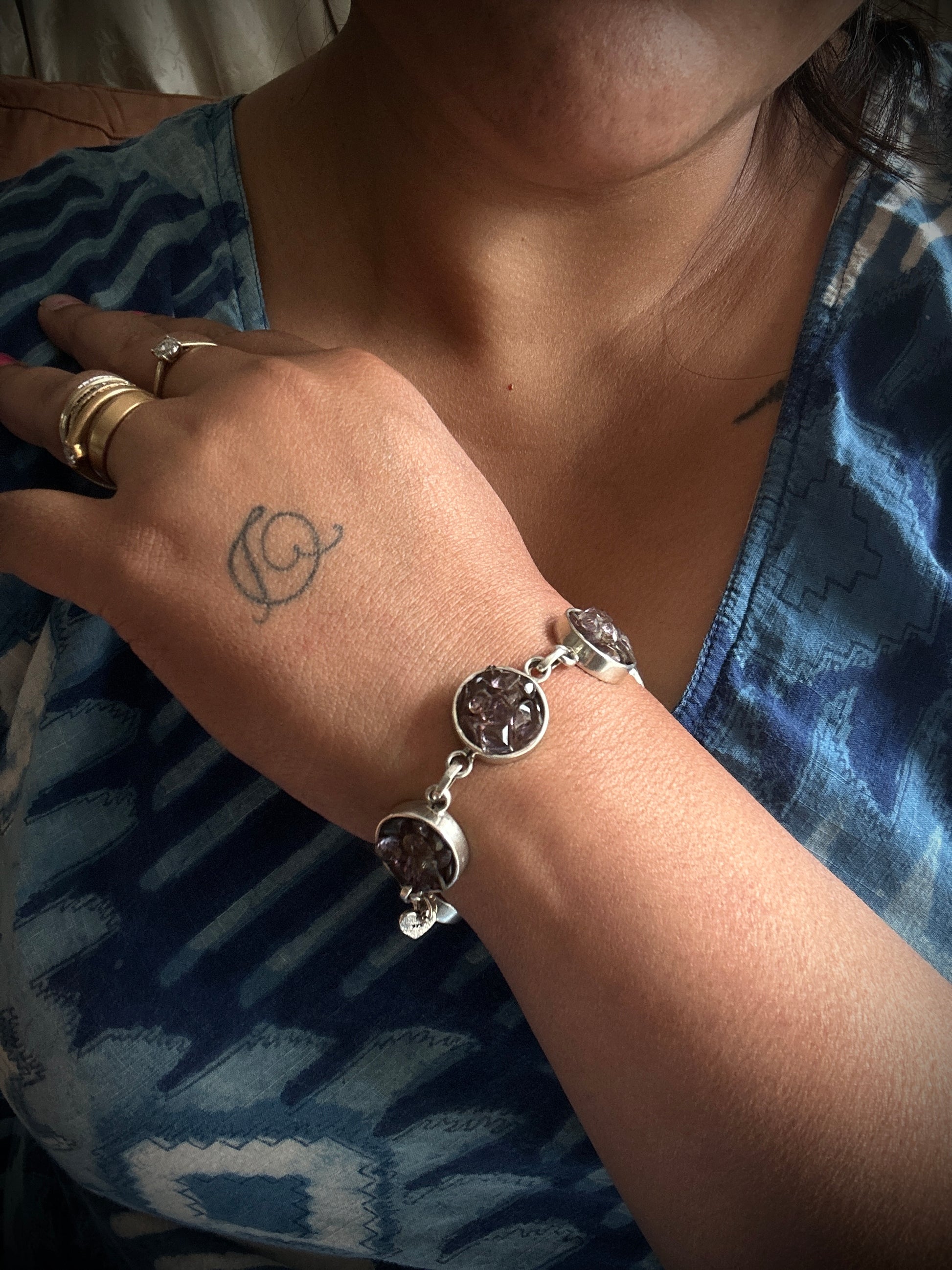 Introducing our Amethyst Crystal circle bracelet- a stunning and unique bracelet featuring raw amethyst crystals encased in 925 silver circles. With the healing properties of amethyst and the elegance of silver, this bracelet is perfect for adding a touch of beauty and positivity to any outfit. Made with high-quality materials for long-lasting wear.