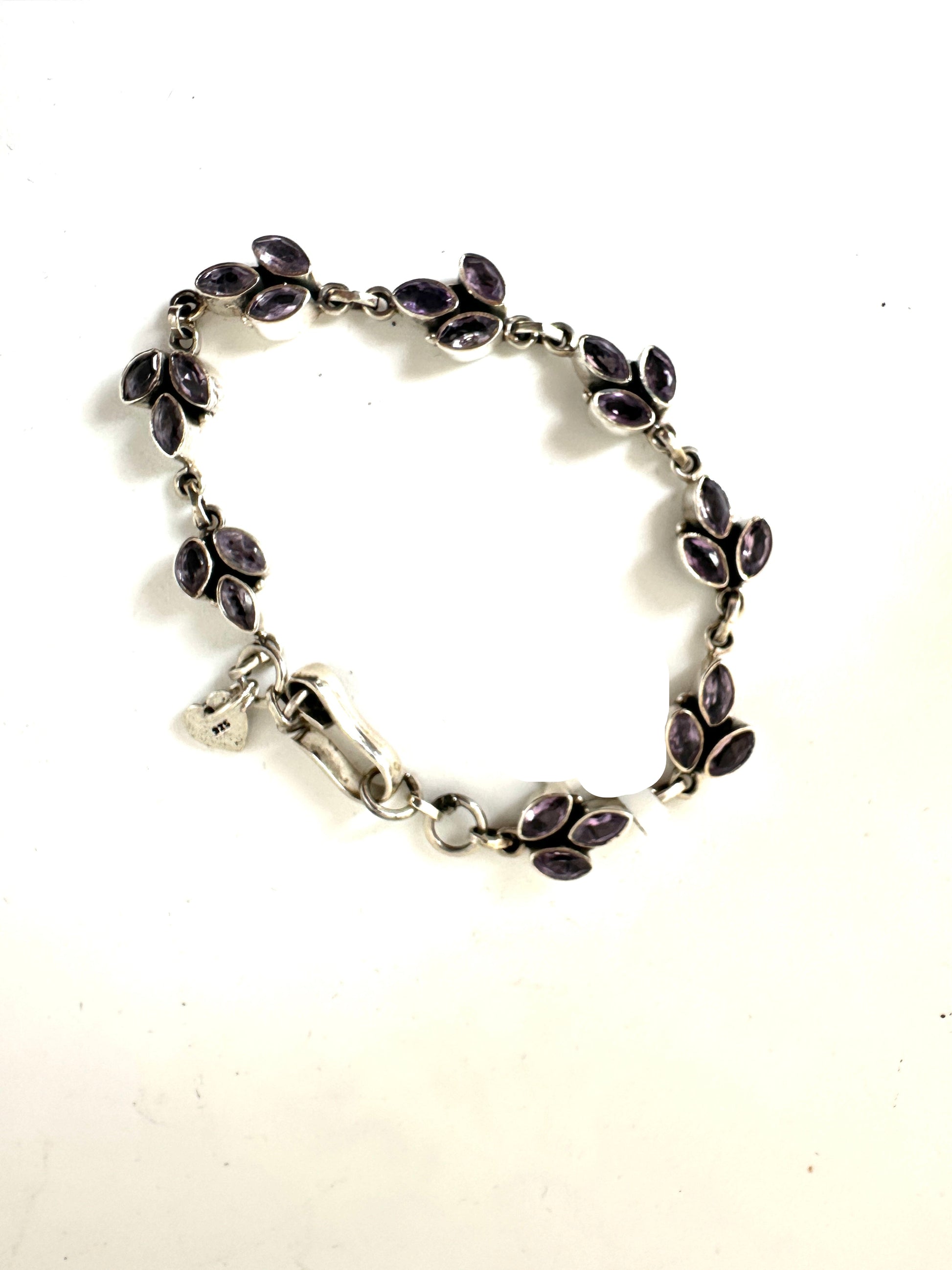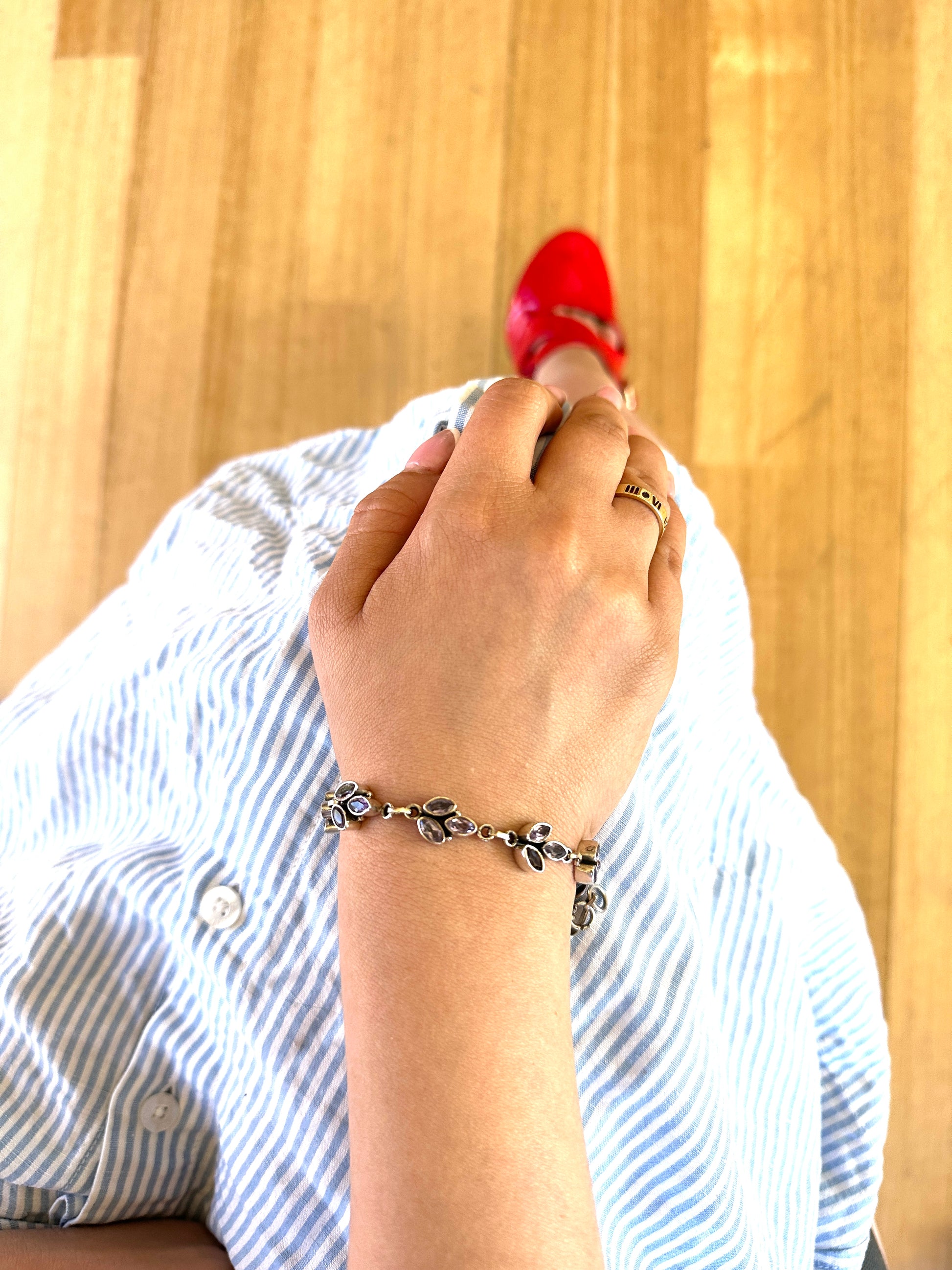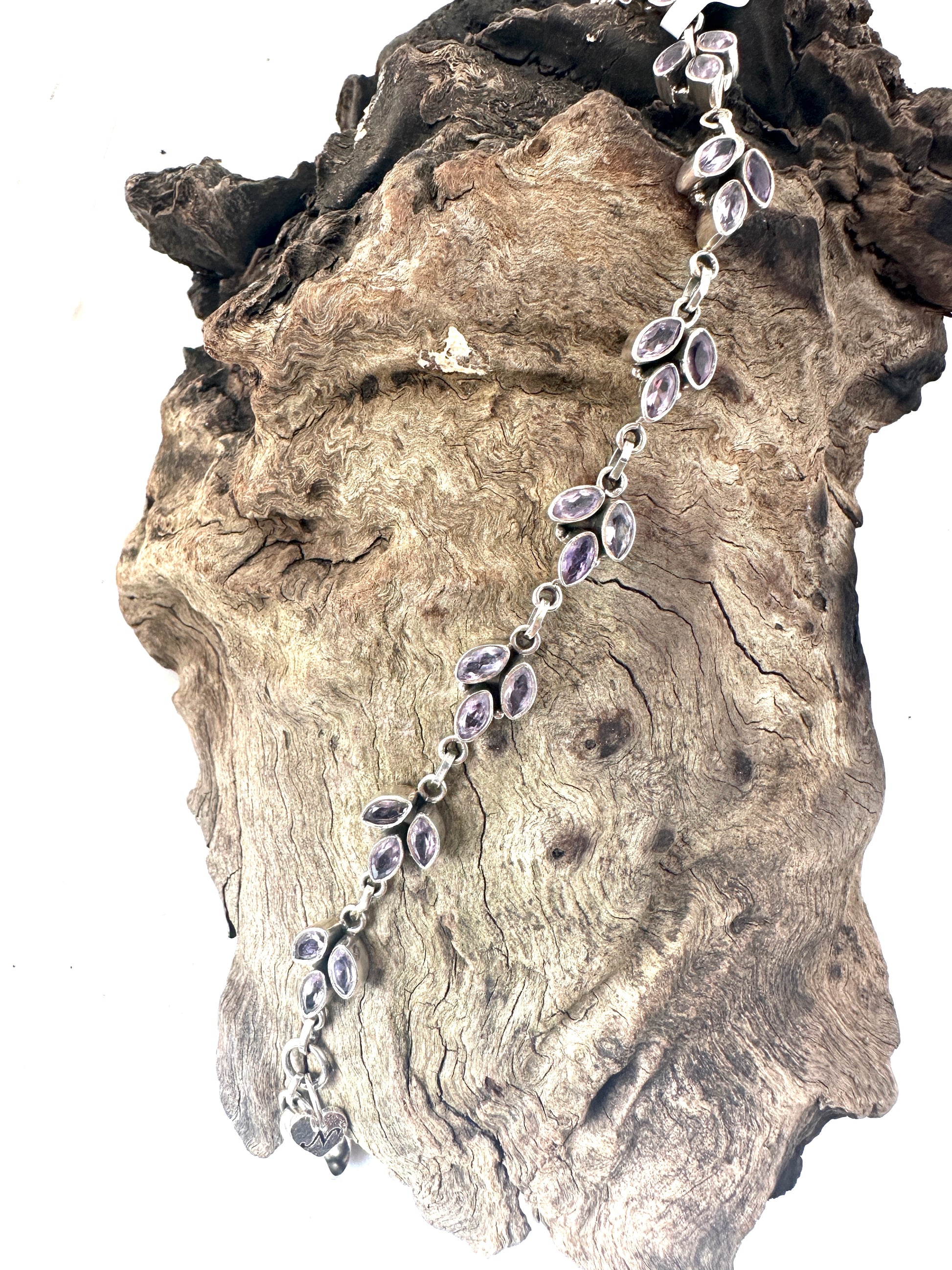 Crafted with care and precision, our Amethyst Leaves bracelet showcases delicate faceted amethyst stones in the form of elegant leaves set in 925 silver. Adorn your wrist with this stunning piece, known for its calming properties and believed to bring balance and protection. Elevate your style with natural beauty.