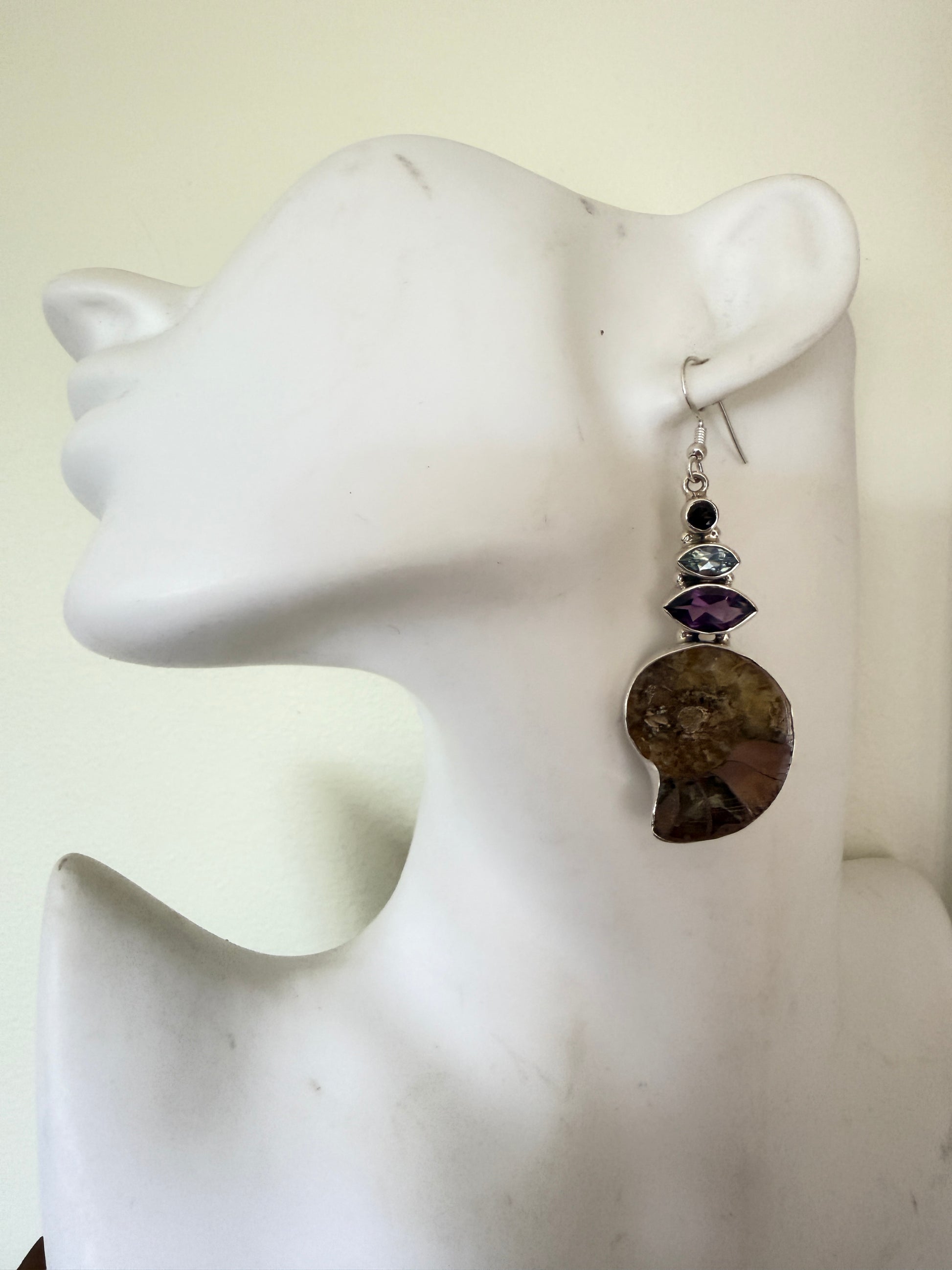 These striking statement earrings showcase a genuine ammonite shell fossil as the focal point, complemented by faceted gemstones in rich jewel tones. The amethyst, blue topaz, and smoky quartz create a sophisticated colour contrast that catches the light beautifully. Perfect for adding geological elegance to any ensemble, these earrings blend natural history with contemporary design. Each pair celebrates the timeless beauty of fossilised treasures, making them ideal for collectors and nature enthusiasts alike.