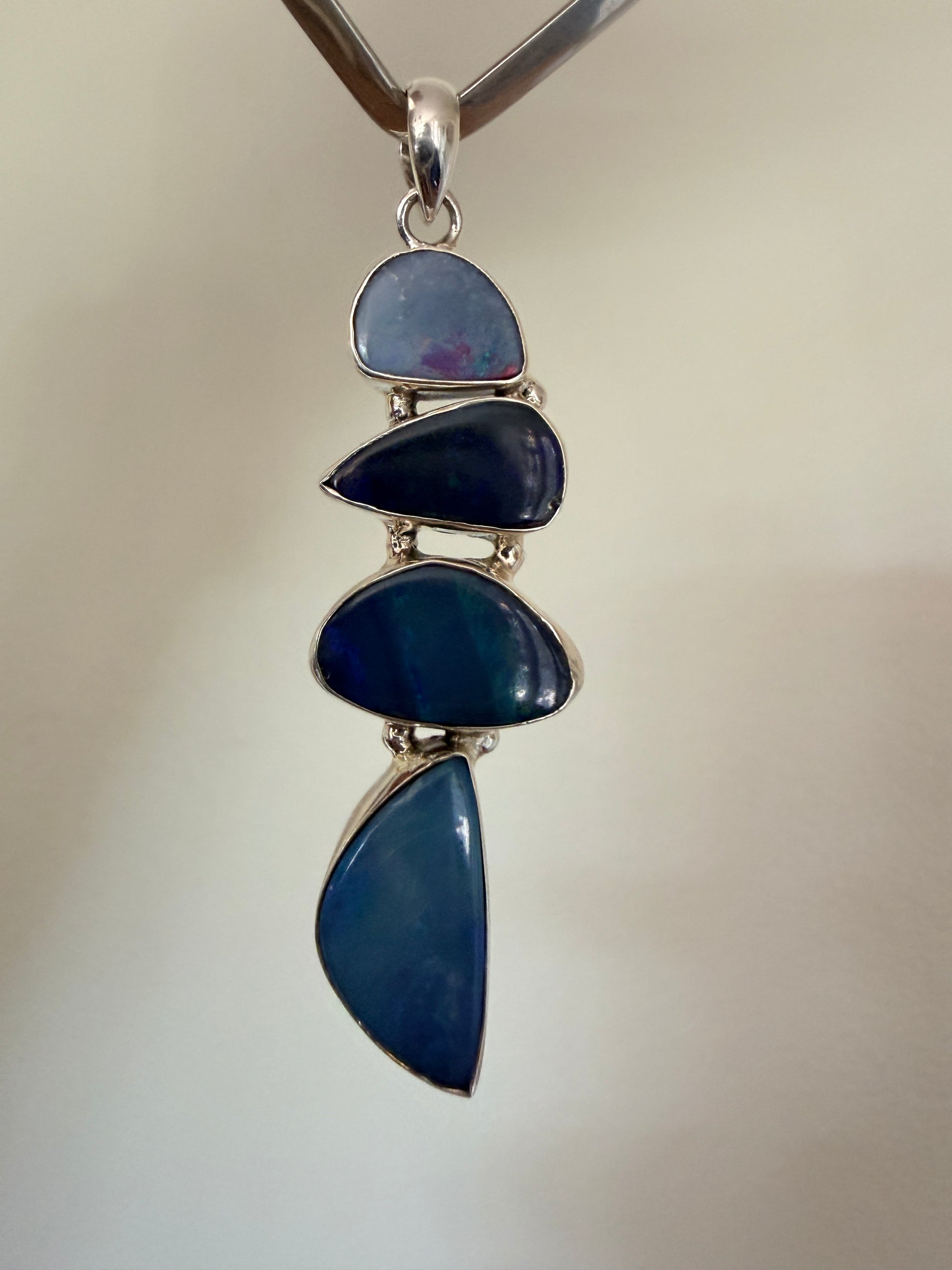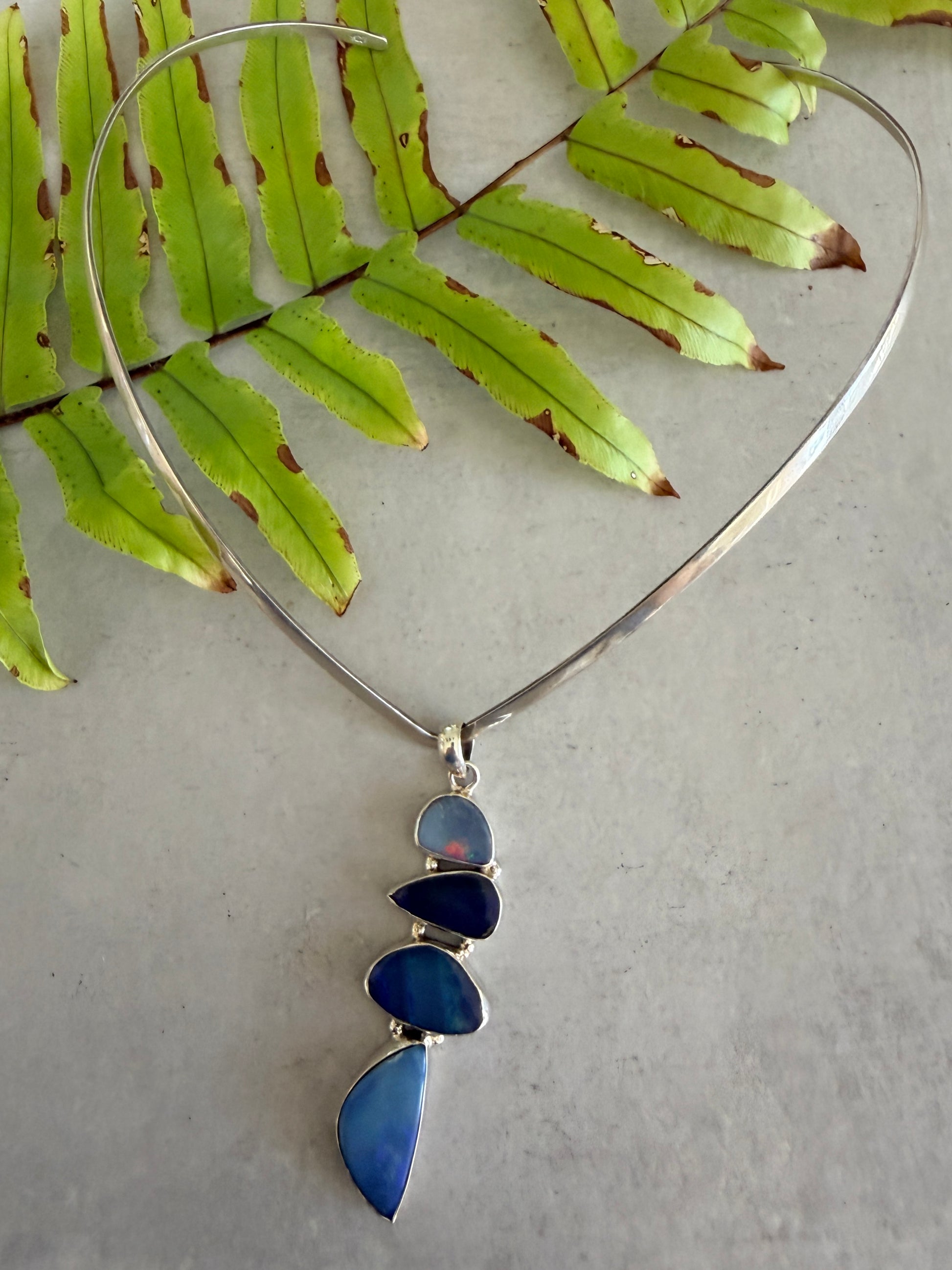 Inspired by Australia's coastal waters, this striking pendant showcases four boulder opal doublets in captivating blue tones that mirror the ocean's dynamic palette. Each doublet captures the natural beauty of Australian gemstones, displaying the depth and movement found in our seas. Crafted from 925 sterling silver, the design celebrates the interplay of light and colour that defines these precious stones. A sophisticated piece that brings the essence of the Australian ocean to your jewellery collection.