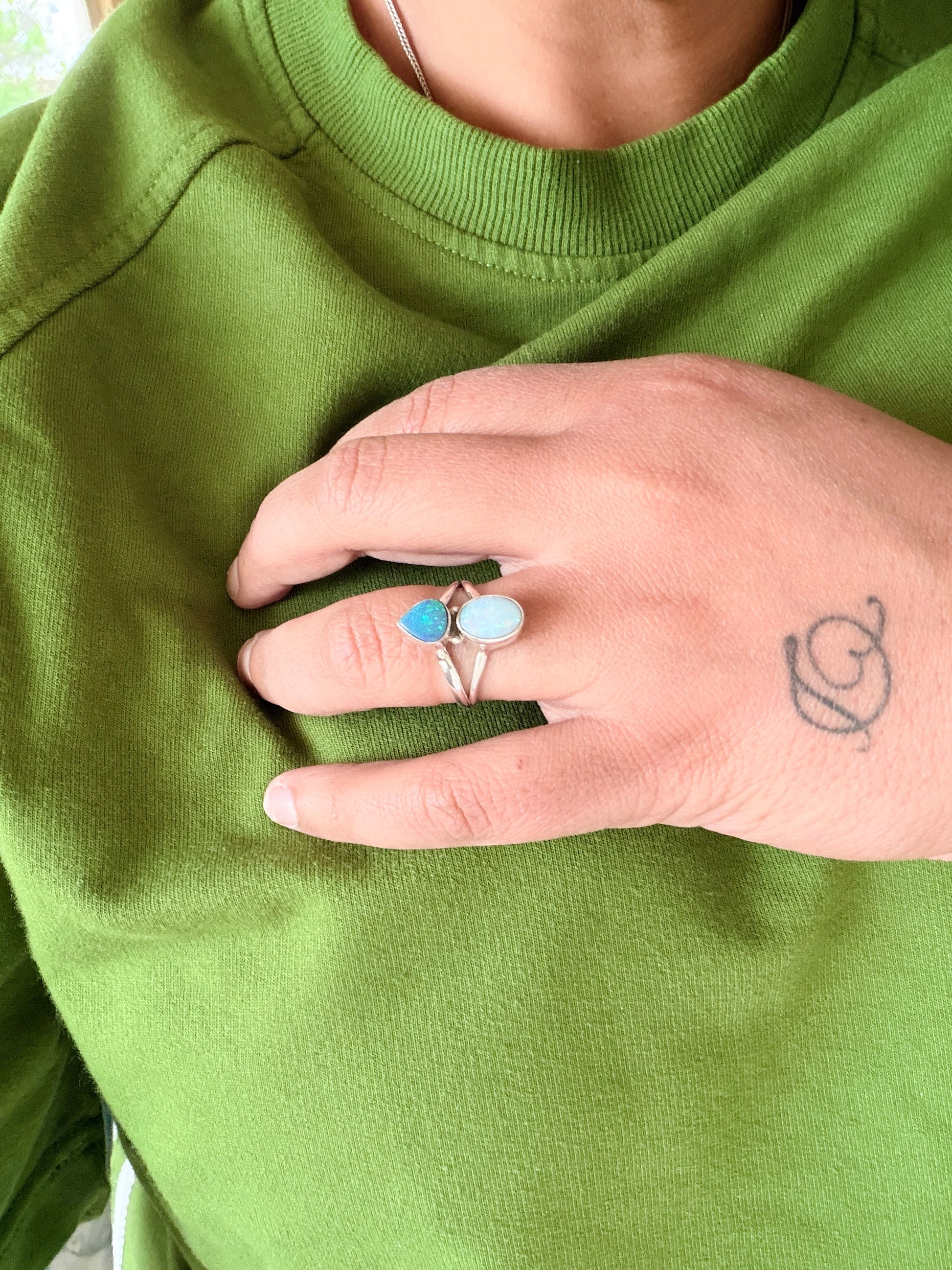 A dance of light captured in Silver .This striking double Australian opal ring features two luminous opals stacked in quiet harmony-one oval, one teardrop-each alive with deep ocean blues and flashes of electric green .