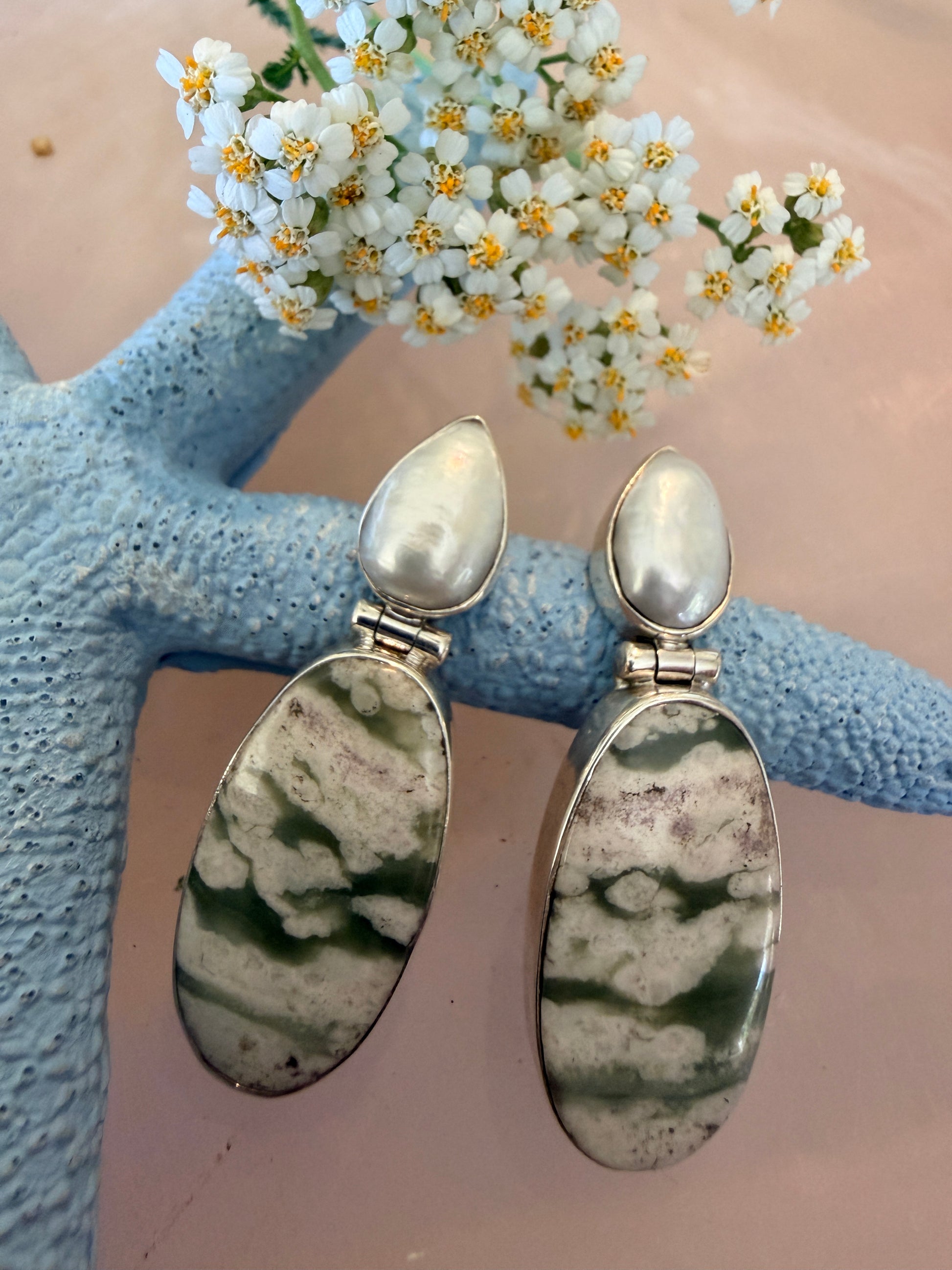 Baroque Pearl with Peace Jade Earrings These distinctive earrings combine the organic allure of baroque pearls with a substantial peace jade oval drop, suspended from sterling silver posts. The irregular lustre of the baroque pearls contrasts beautifully with the smooth, translucent green and purple specks of the jade, creating a piece that bridges contemporary design with timeless elegance. Crafted in sterling silver for durability and hypoallergenic wear, these earrings suit both everyday refinement and special occasions. The substantial drop length provides graceful movement while maintaining balanced proportions. An investment in handcrafted jewellery that celebrates natural gemstone character.