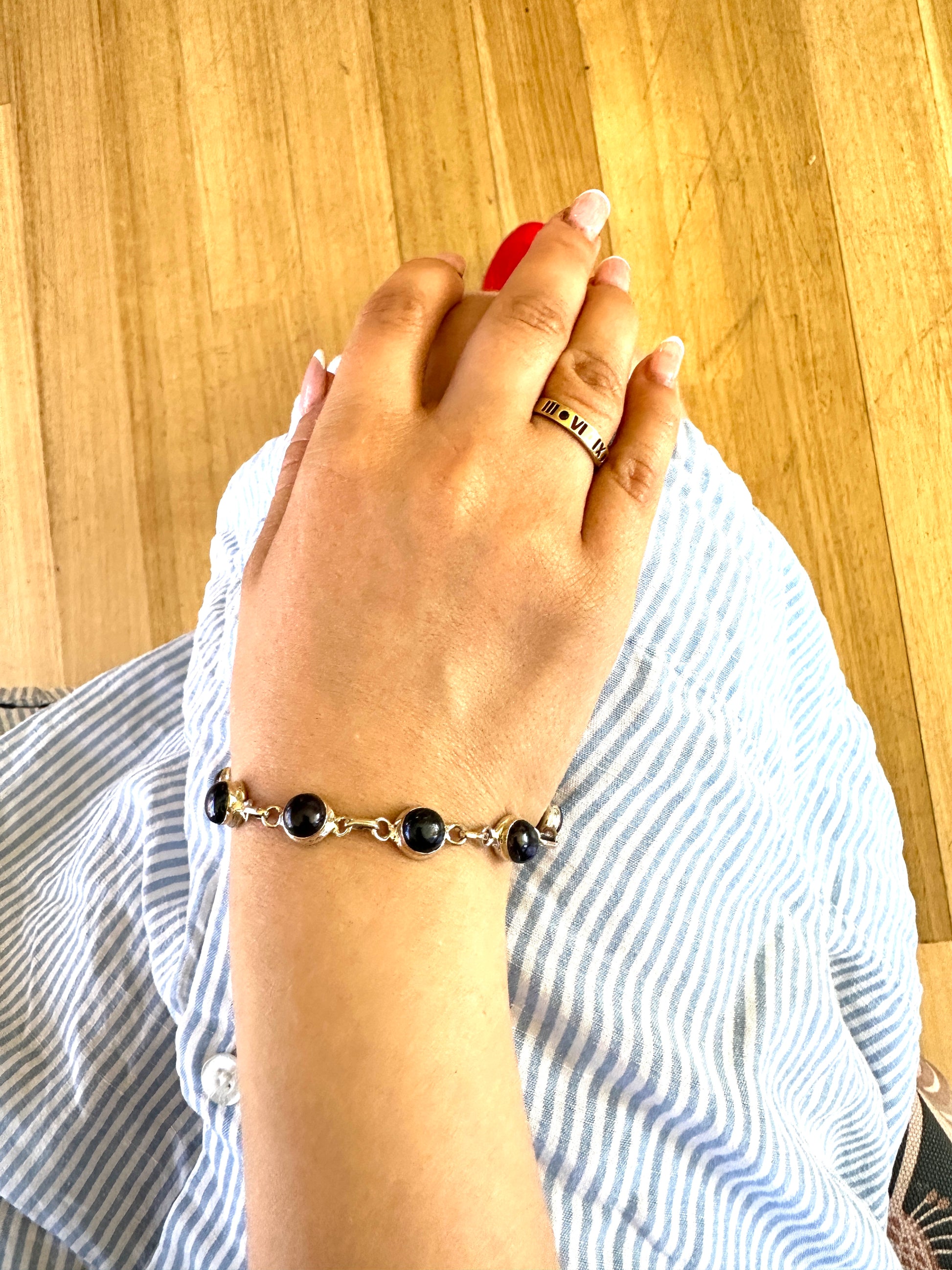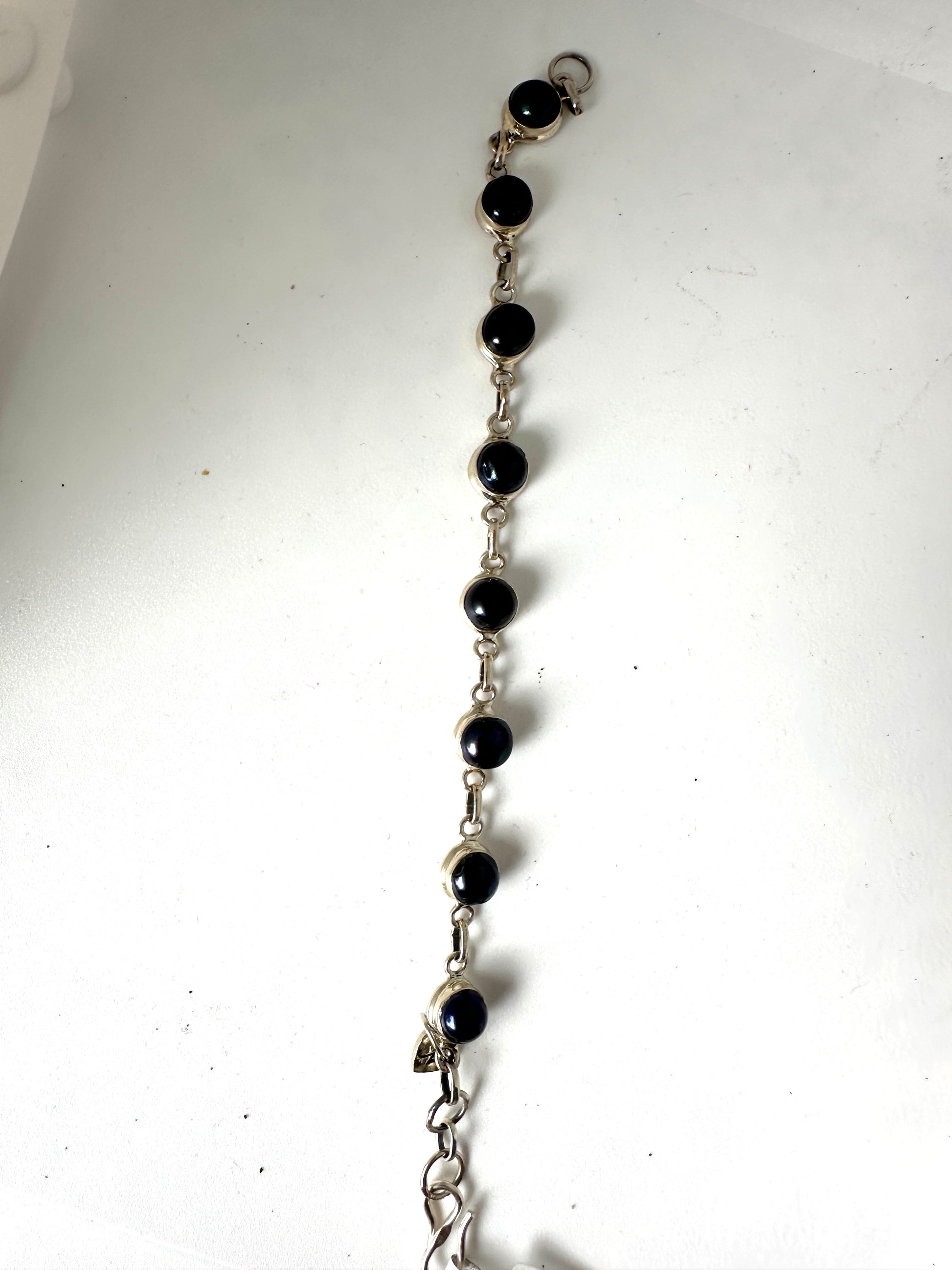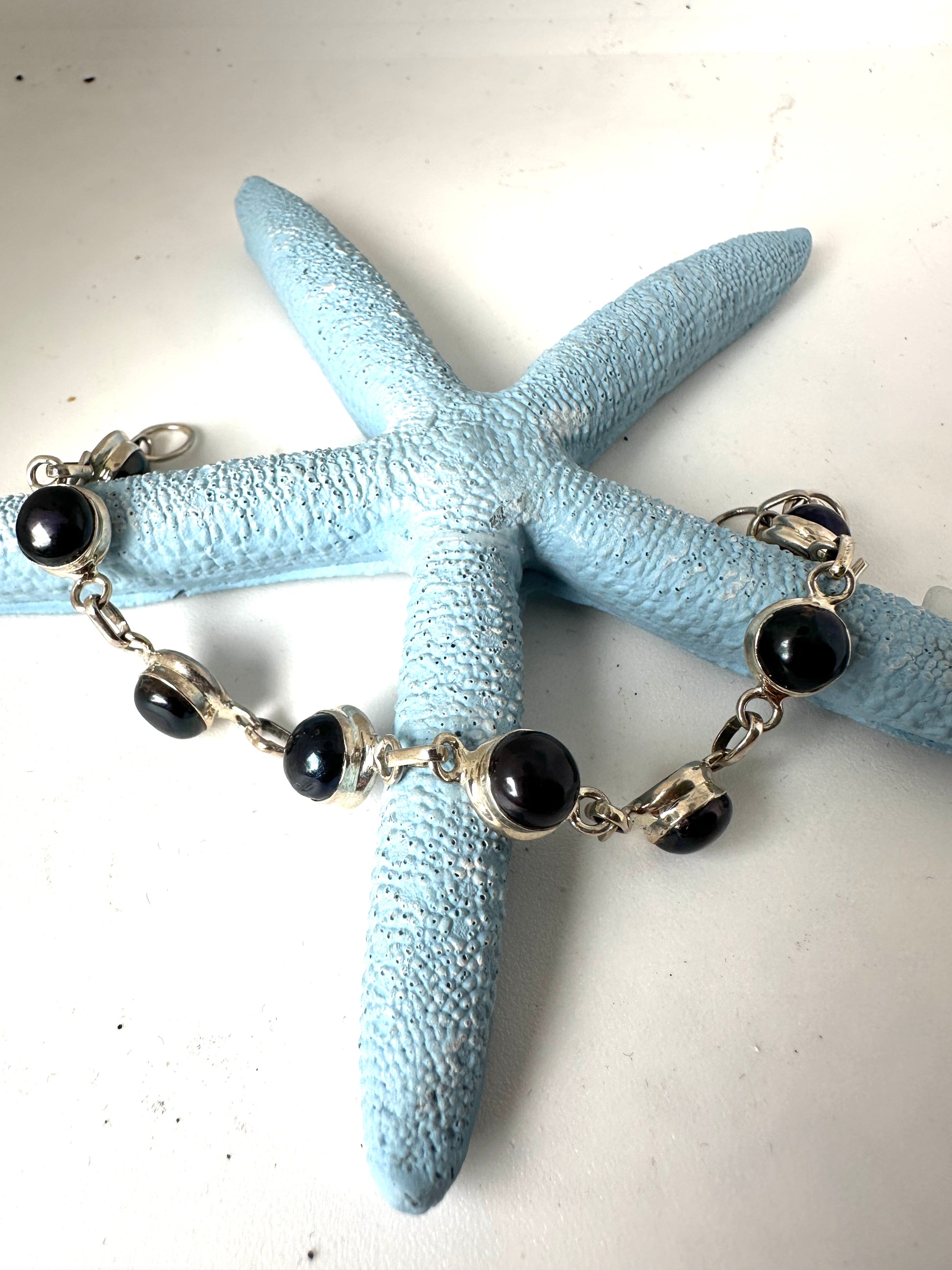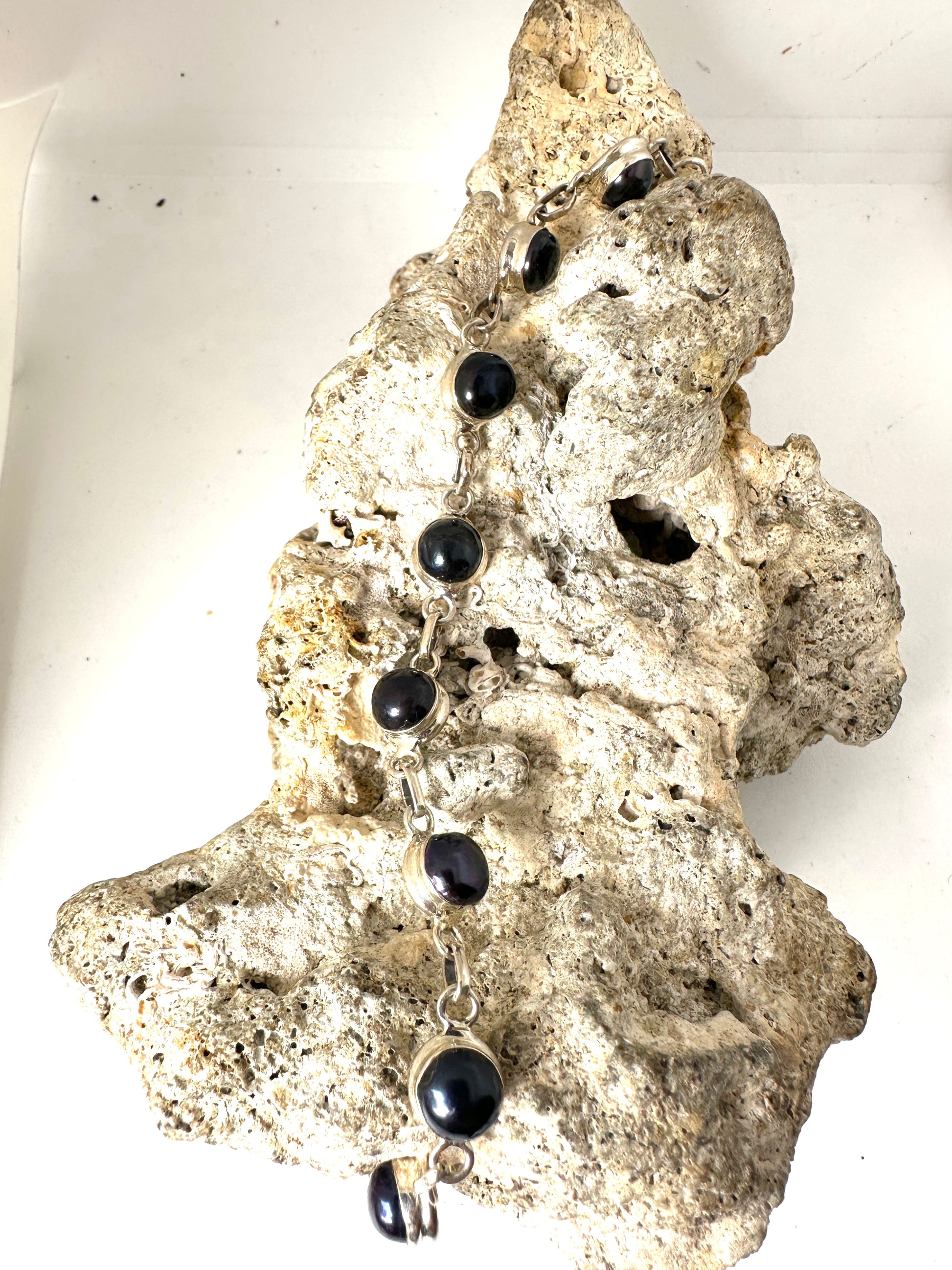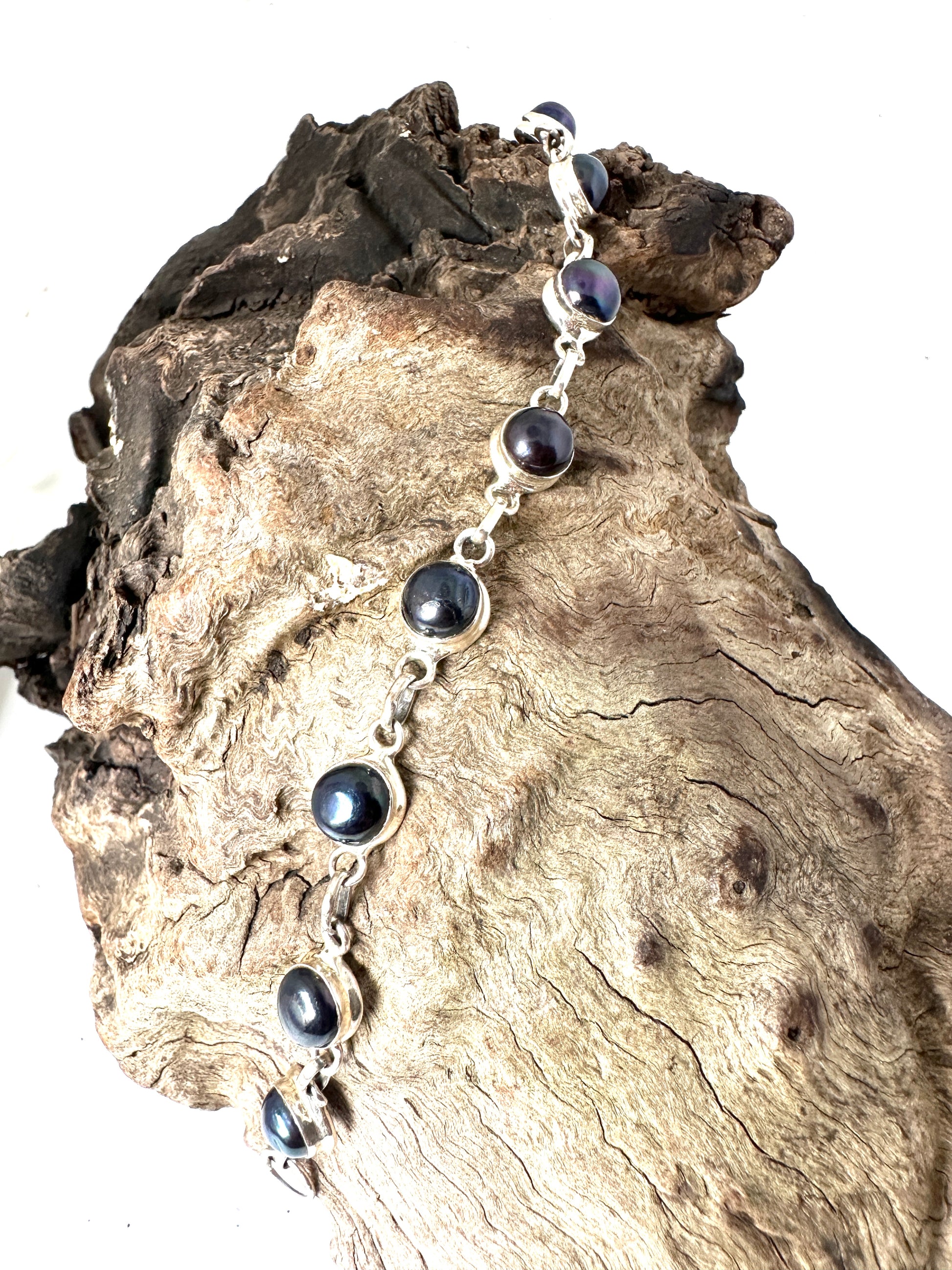 Crafted with black fresh water pearls, the Black Pearl bracelet is a beautiful addition to any collection. Encased in 925 sterling silver, this elegant bracelet is perfect for both formal events and everyday wear. Elevate any outfit with the timeless sophistication of the Black Pearl.
