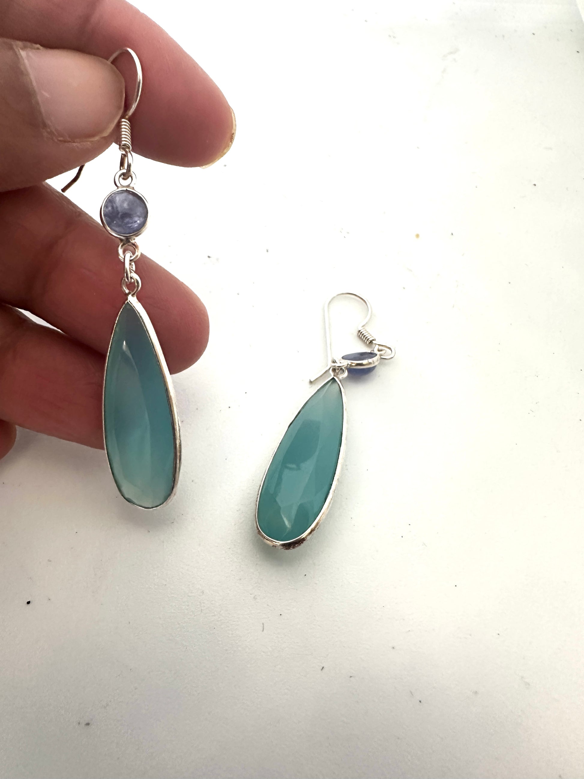 Enhance your look with these stunning Blue Chancedony drop earrings. These earrings are made with 925 silver and feature beautiful Tanzanite accents. Perfect for adding a touch of elegance to any outfit, these earrings are sure to make a statement. Don't miss out on this timeless and sophisticated piece.