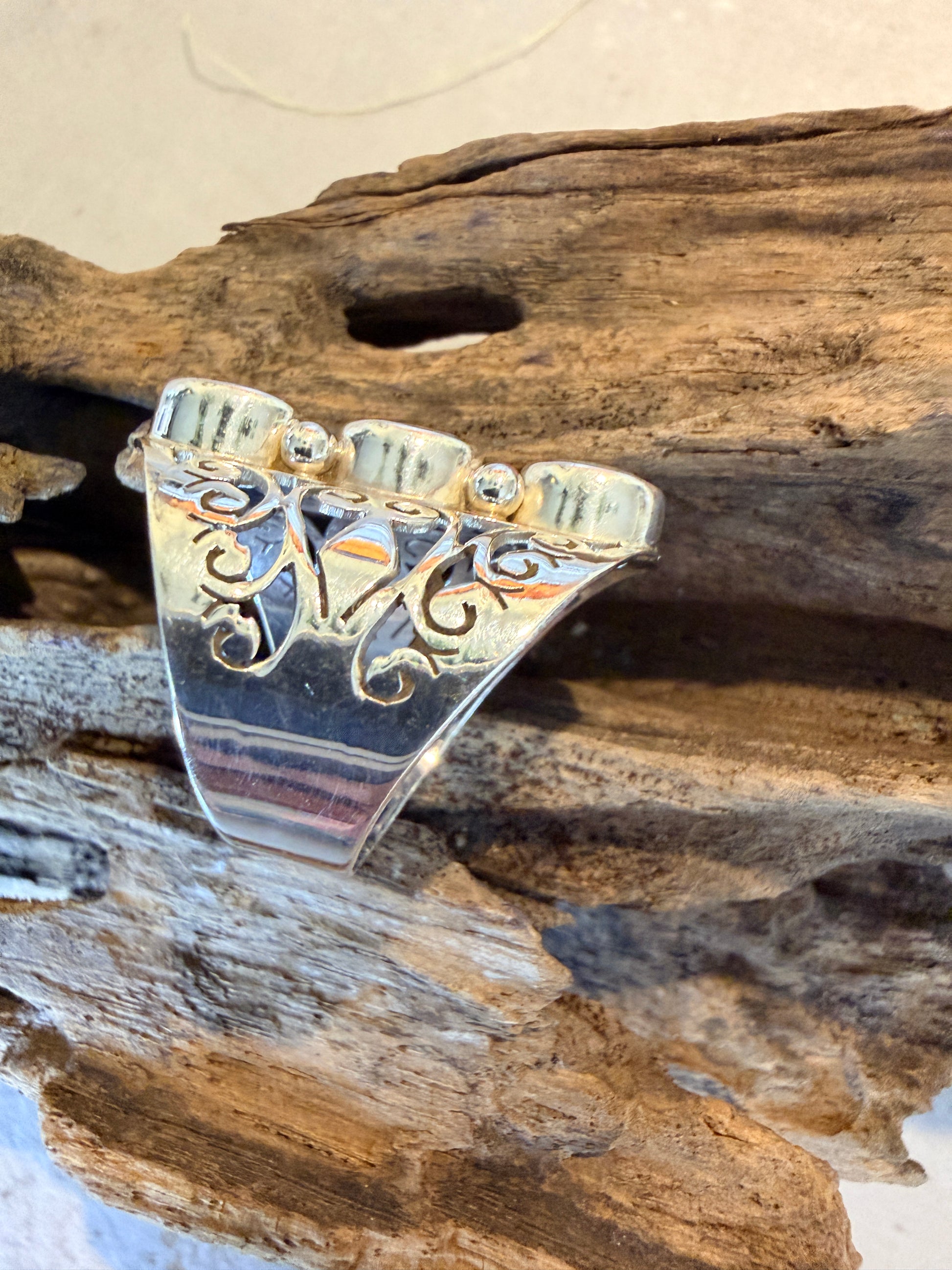 A timeless blend of elegance and craftsmanship, this statement ring features three luminous oval-cut Blue Topaz gemstones set in intricate hand-worked filigree silver. The soft sky-blue tones of the topaz catch the light beautifully, creating a gentle sparkle that feels both calming and sophisticated.