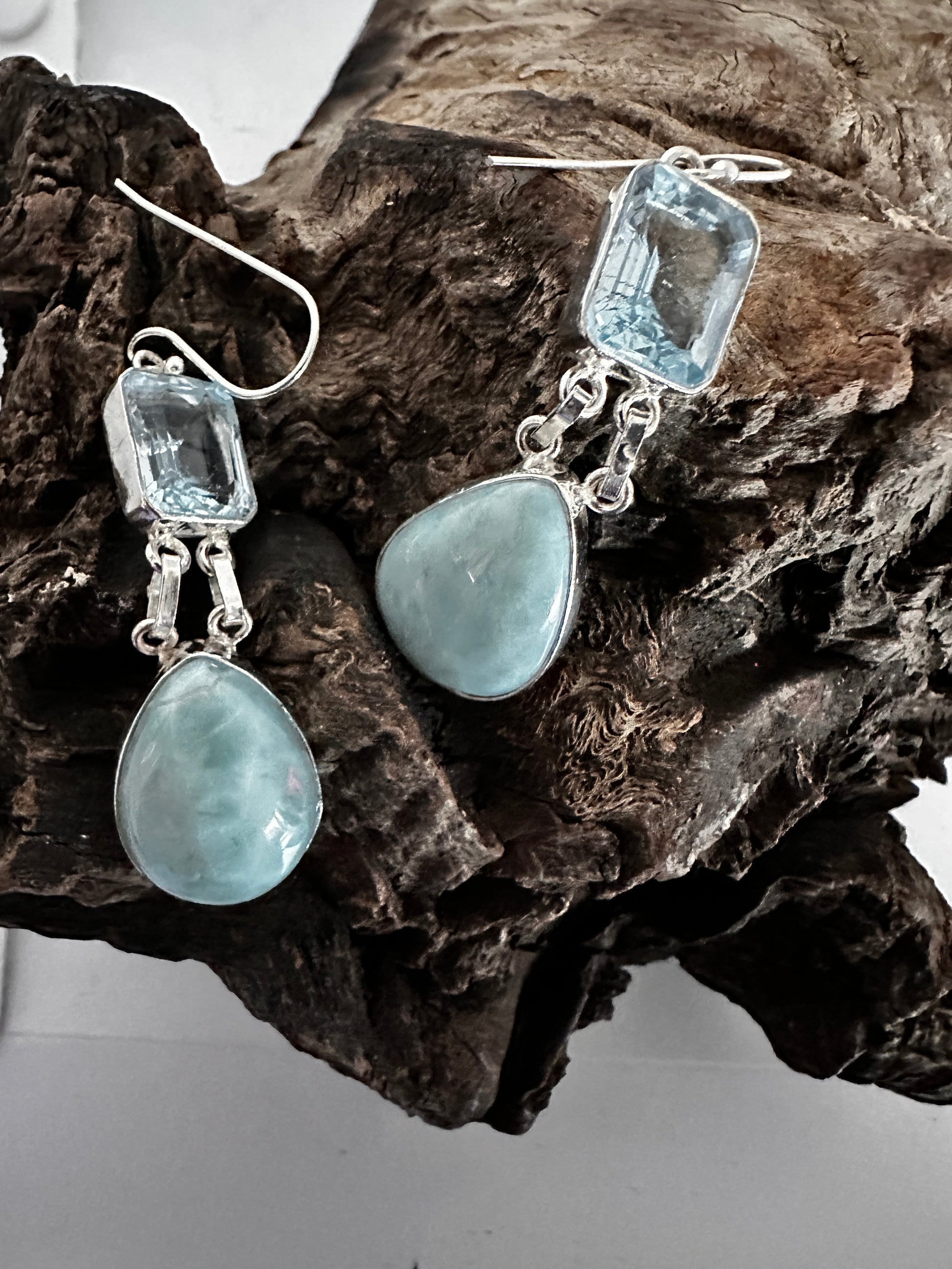 These sterling silver earrings feature a striking combination of a beautifully faceted rectangular blue topaz paired with a large teardrop-shaped larimar. The contrasting blue tones create a sophisticated and elegant statement piece, expertly crafted to enhance both casual and formal ensembles. Perfect for those seeking refined jewelry with a unique, natural charm.