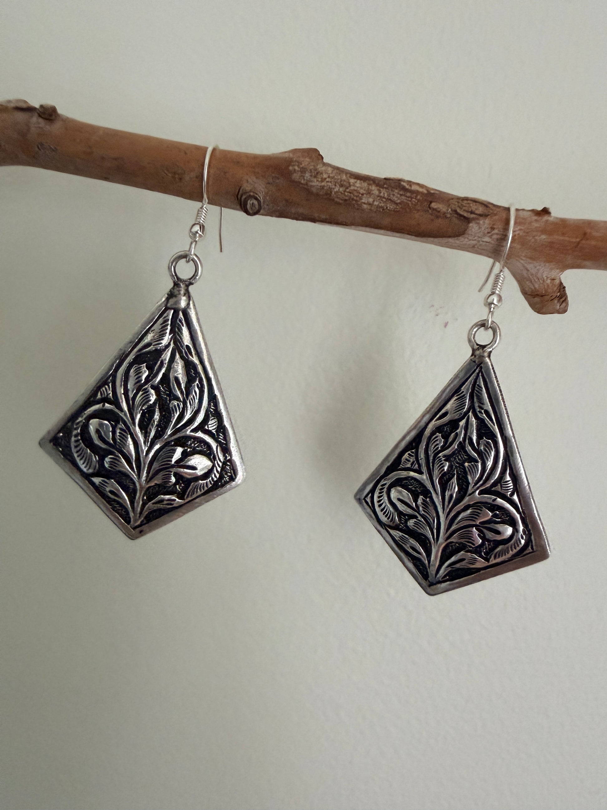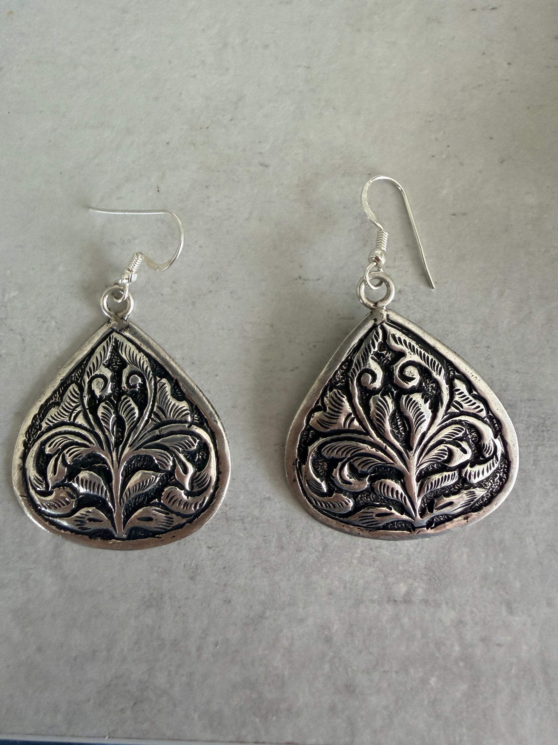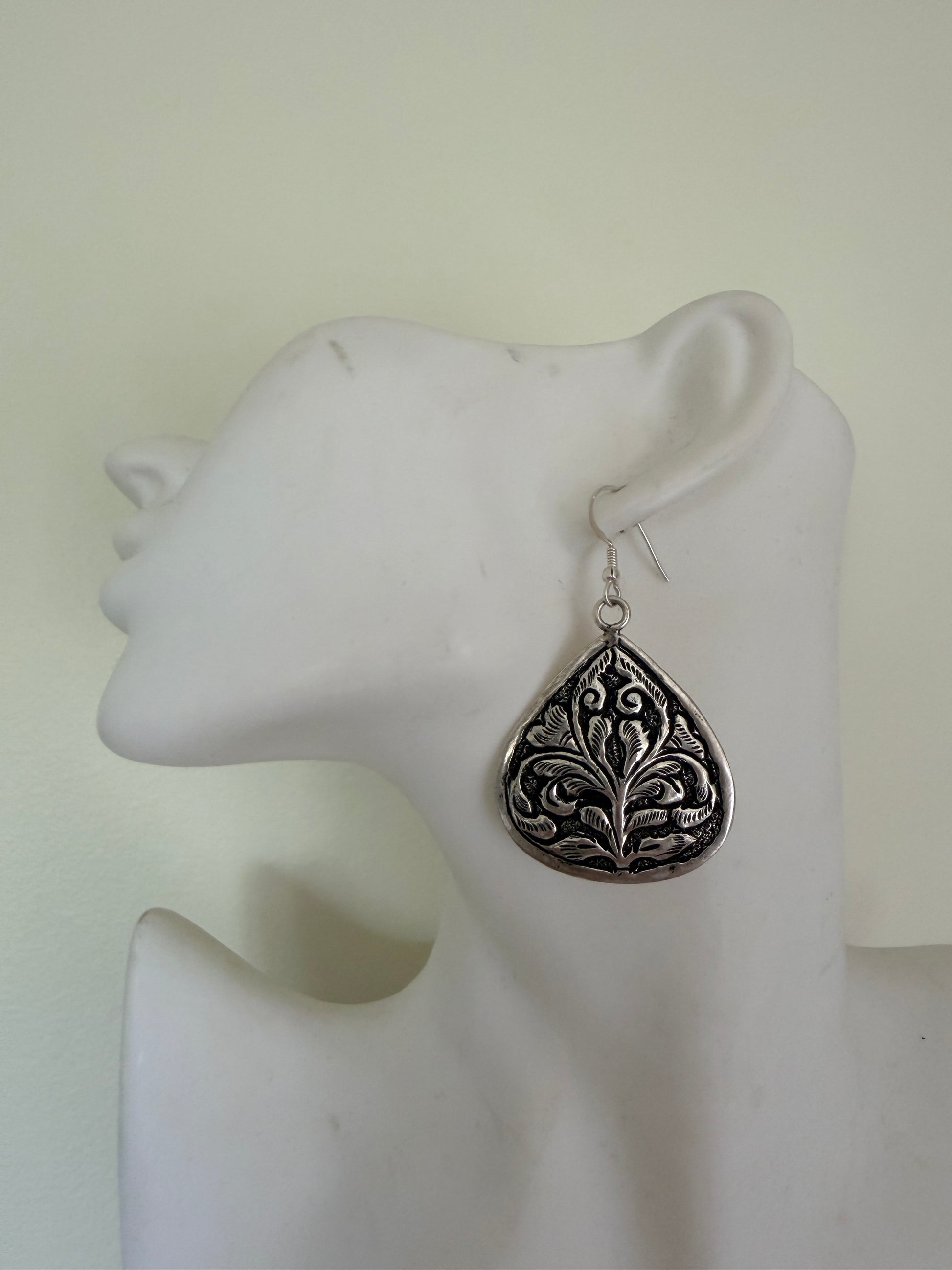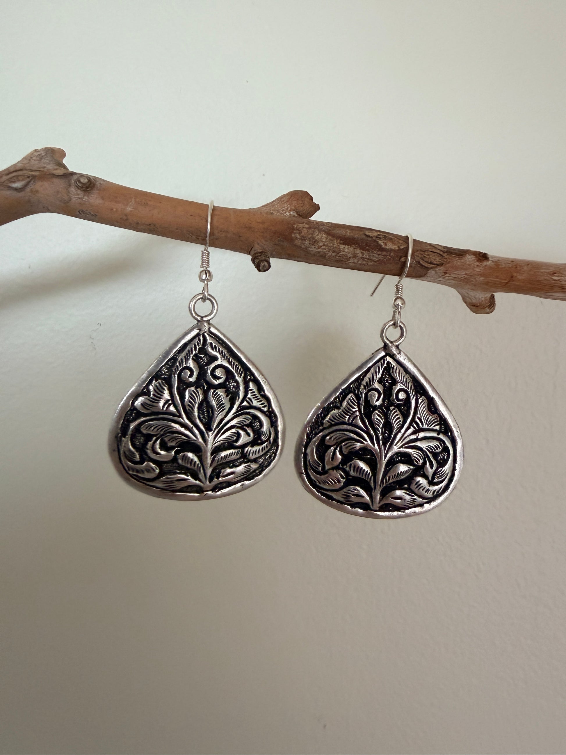 Boteh earrings showcase meticulously embossed sterling silver craftsmanship inspired by ancient Persian floral motifs. Each pair features a distinctive boteh design—a revered teardrop-shaped botanical element—hand-embossed onto premium sterling silver. The dimensional relief work captures the intricate heritage of classical Persian ornamentation, creating subtle light-play across the surface. A refined statement piece that honours traditional artistry while maintaining contemporary elegance. Perfect for those who appreciate historical design narratives and exceptional metalwork.
