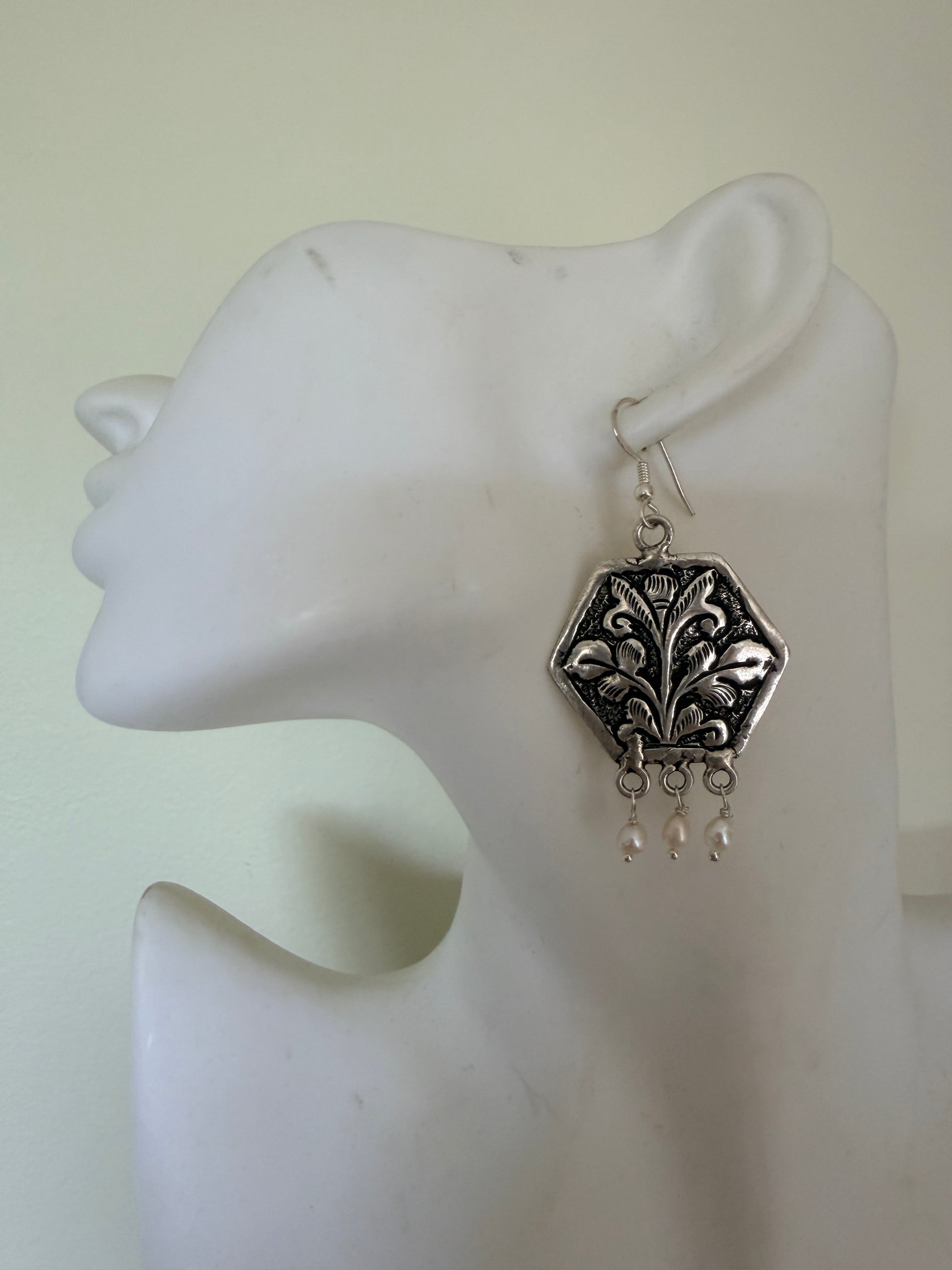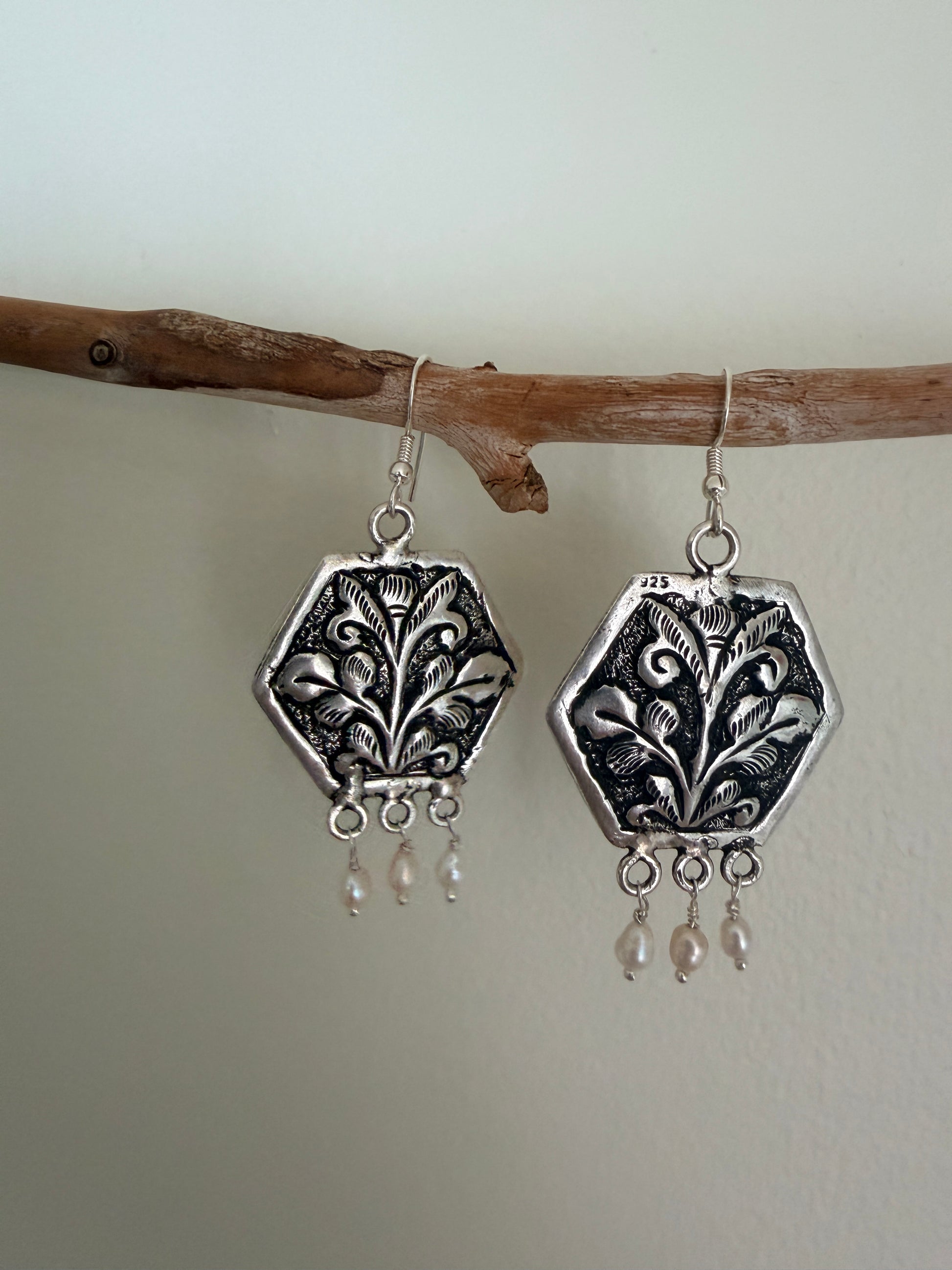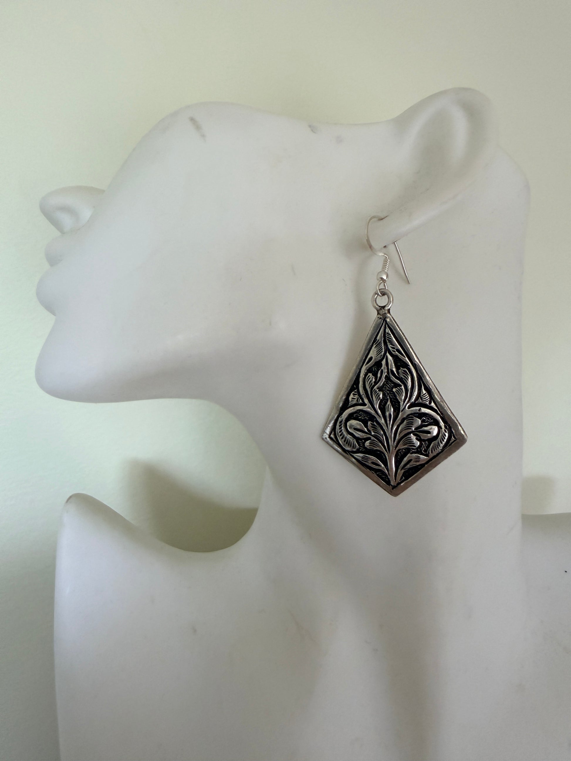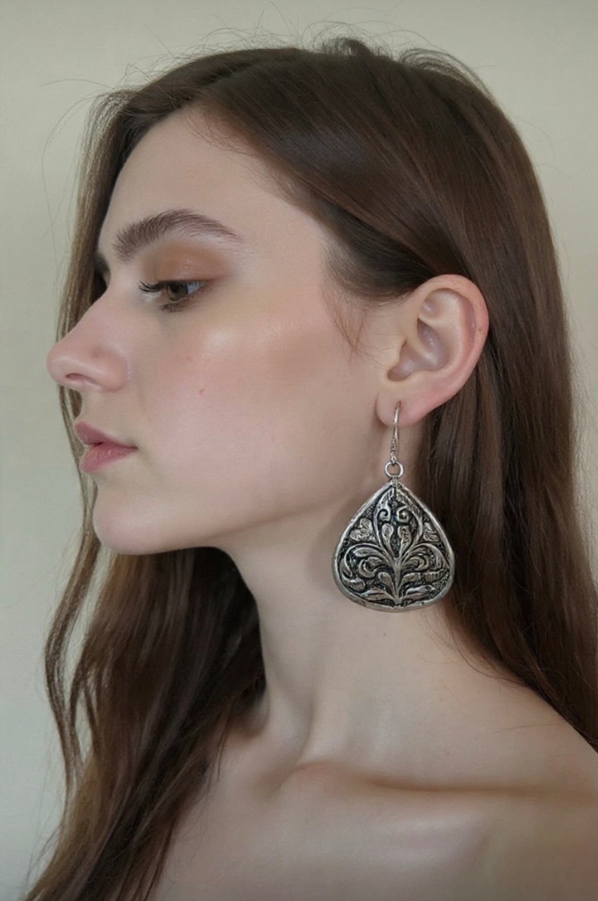 Boteh earrings showcase meticulously embossed sterling silver craftsmanship inspired by ancient Persian floral motifs. Each pair features a distinctive boteh design—a revered teardrop-shaped botanical element—hand-embossed onto premium sterling silver. The dimensional relief work captures the intricate heritage of classical Persian ornamentation, creating subtle light-play across the surface. A refined statement piece that honours traditional artistry while maintaining contemporary elegance. Perfect for those who appreciate historical design narratives and exceptional metalwork.