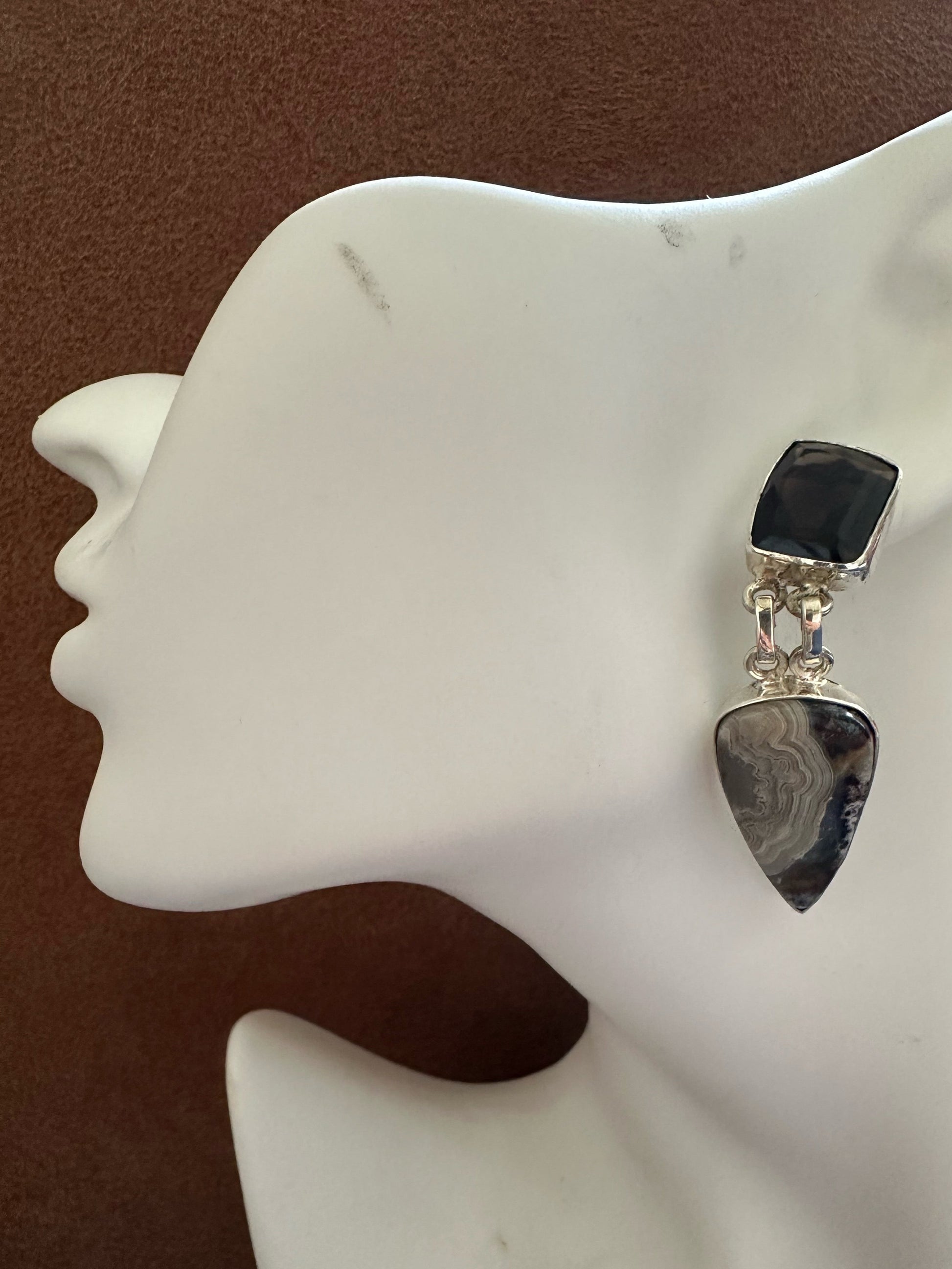 Discover the stunning pattern of Botswana Agate paired with contrasting Smoky Quartz in these one of a kind statement earrings. Made with 925 silver, these unique earrings are sure to make a bold and stylish addition to any outfit. Elevate your look with the natural beauty and elegance of Botswana Agate.