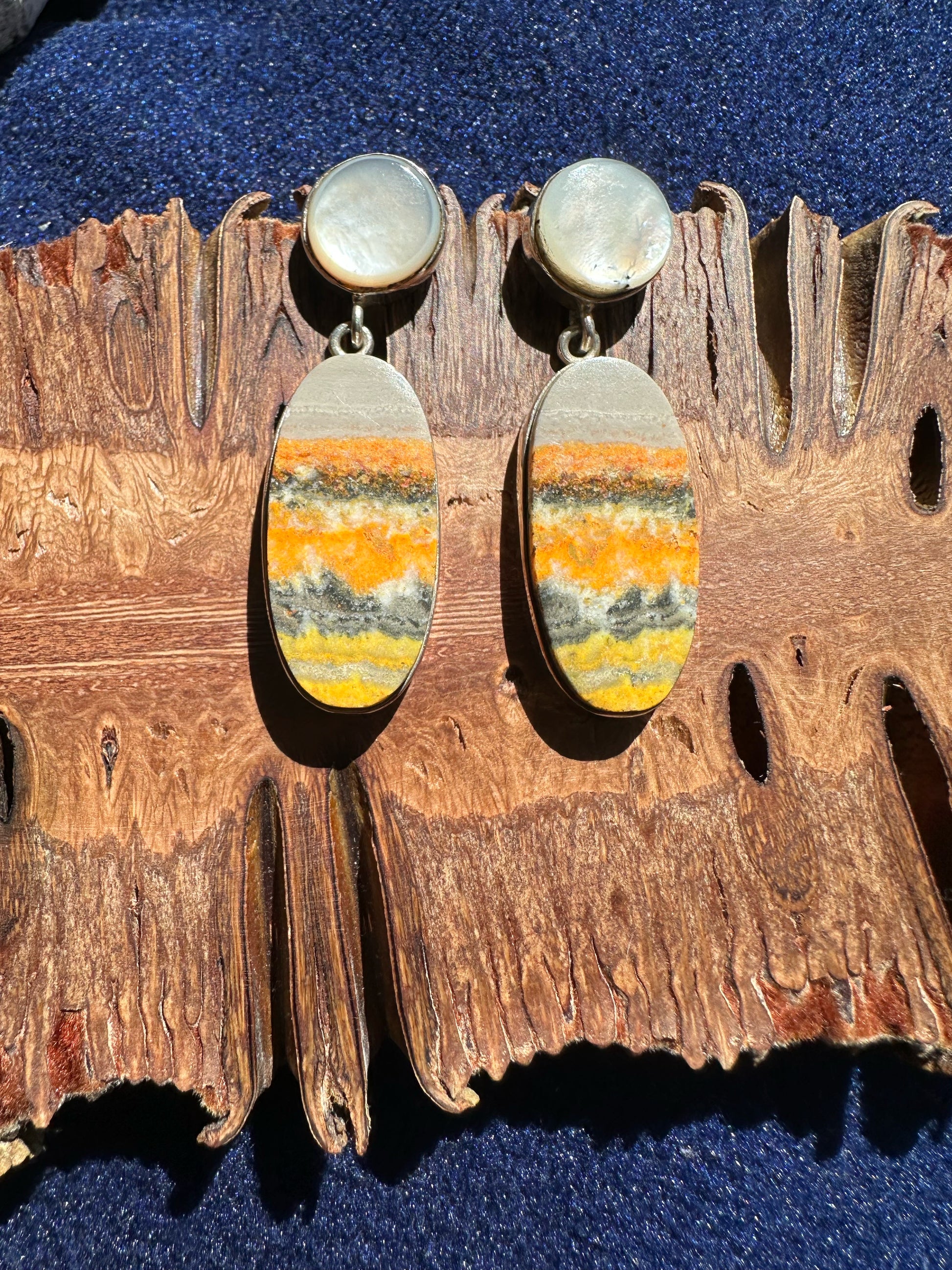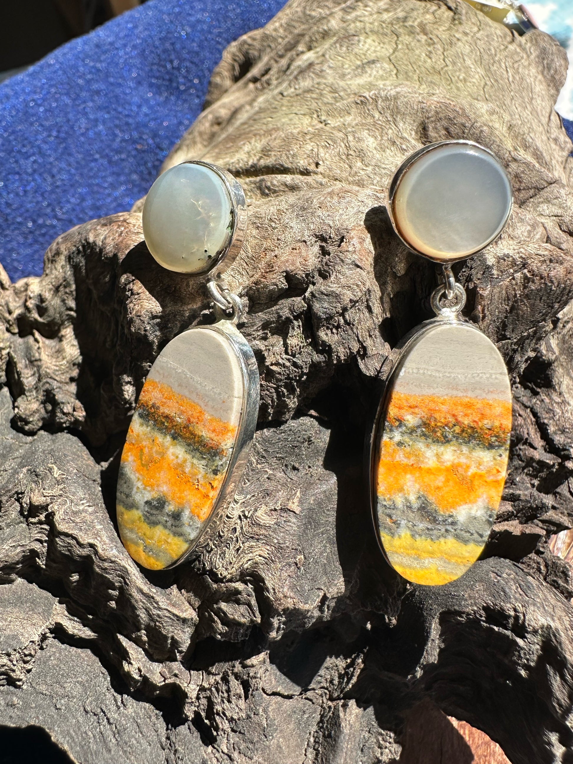 Discover the unique and eye-catching beauty of Bumble Bee Jasper! These handcrafted earrings feature stunning oval-shaped Bumble Bee Jasper stones, accented with elegant mother of pearl stud in a 925 silver setting. Enhance your style with this natural and luxurious piece.
