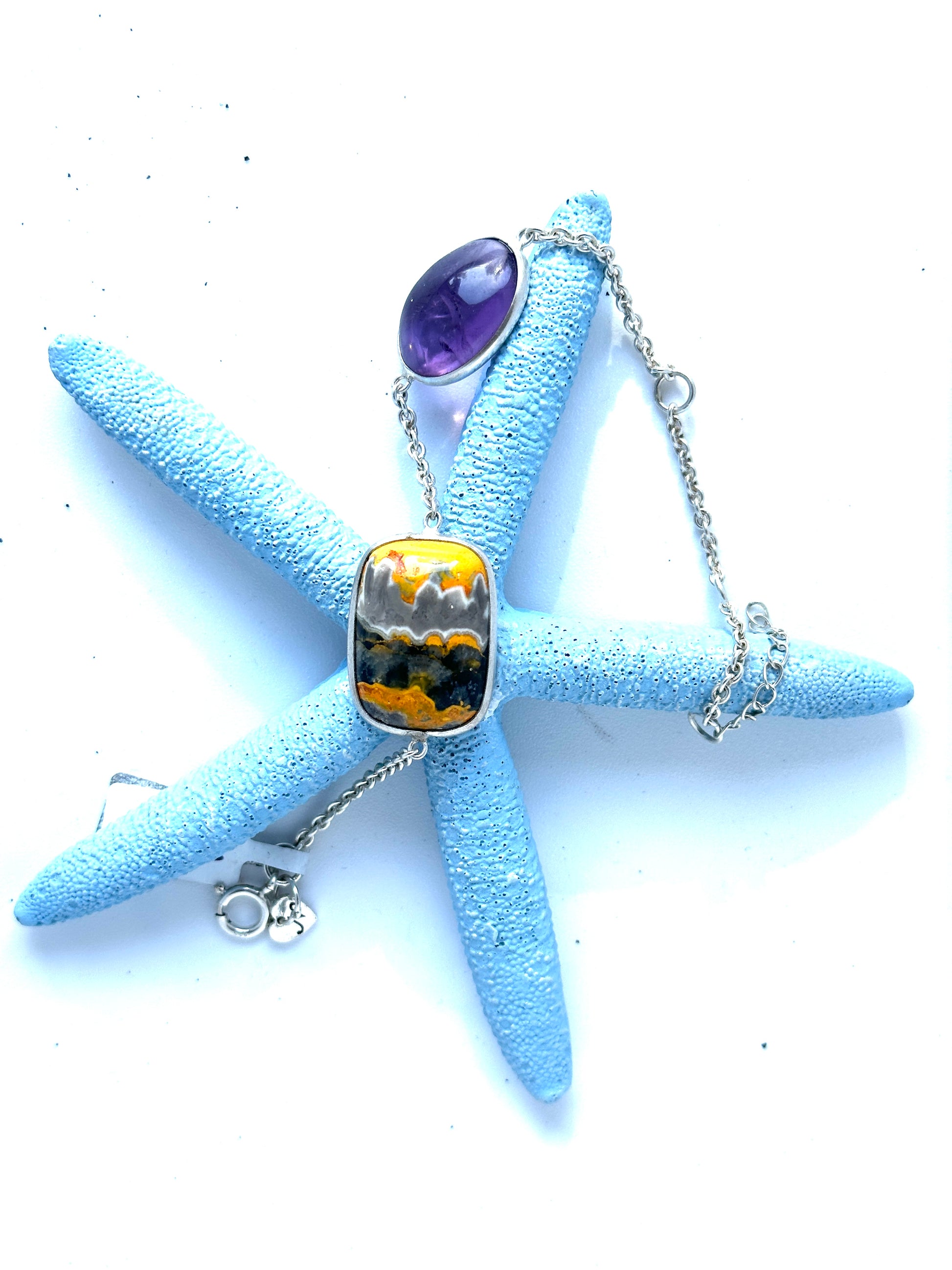 This 925 silver bracelet showcases a stunning bumblebee jasper and amethyst combination, complemented by a delicate chain. The bright colors and contrasting gems add an eye-catching touch to any outfit. Expertly crafted and perfect for any occasion.