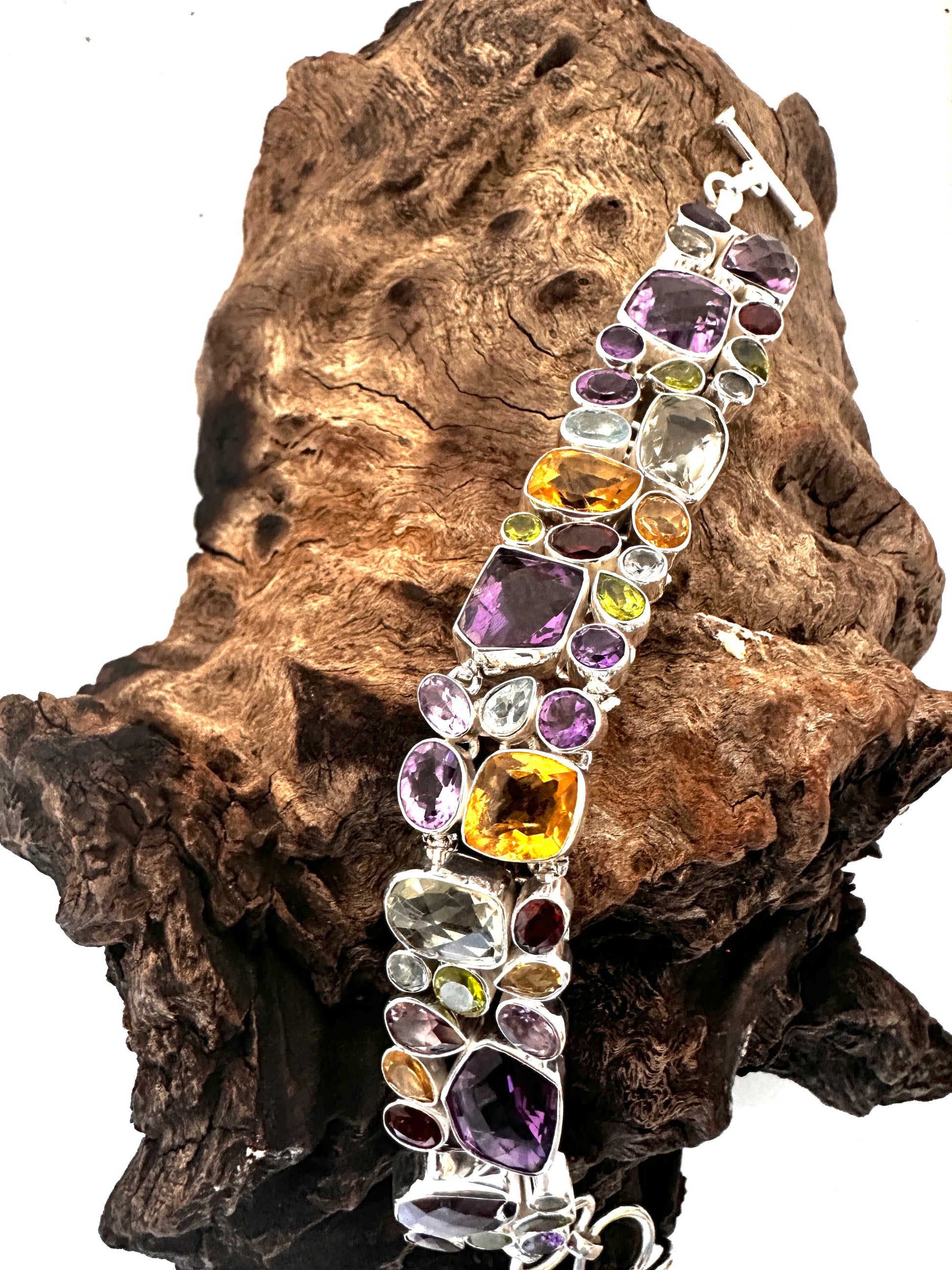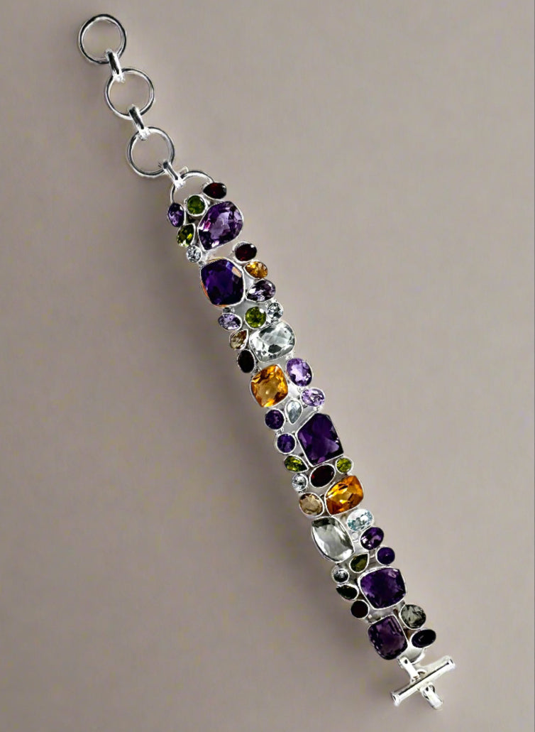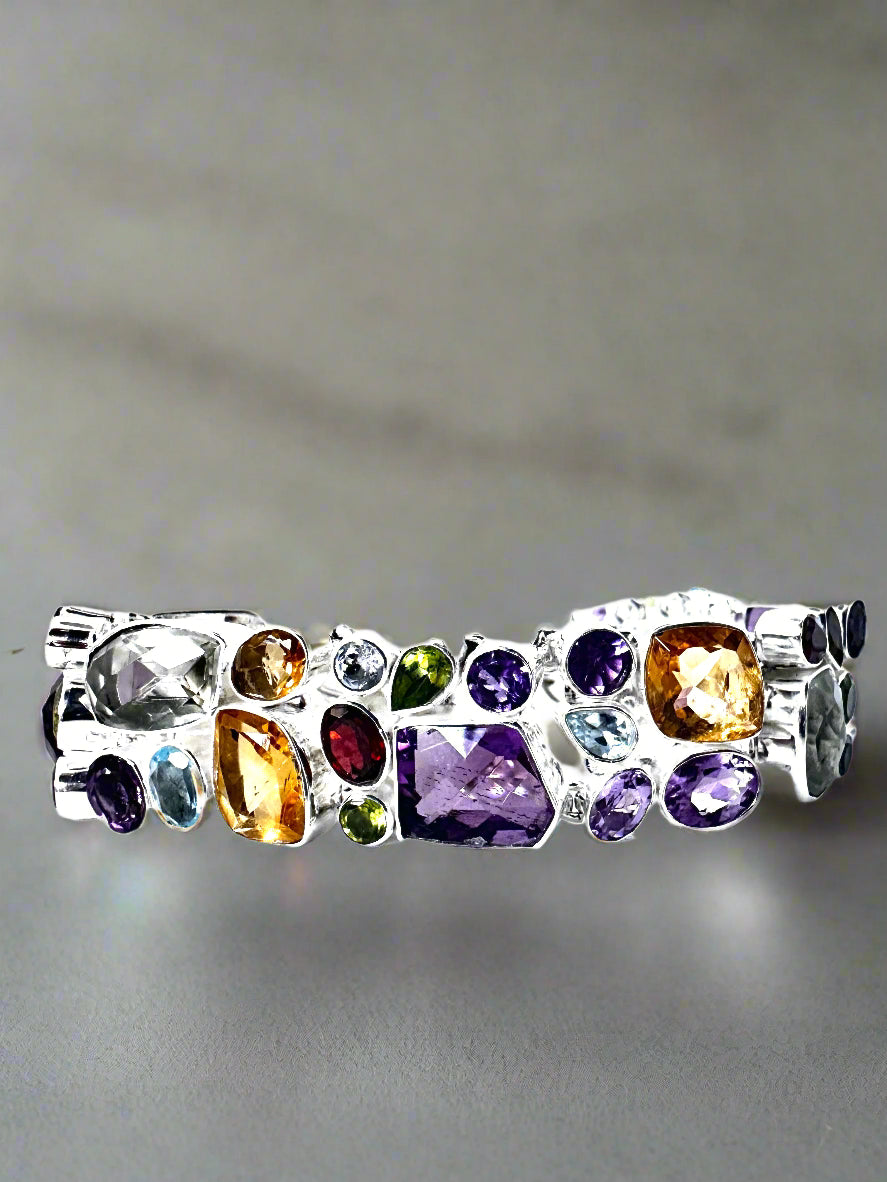 This multistone bracelet, Candy, showcases a sophisticated blend of amethyst, peridot, citrine, garnet, clear quartz, and blue topaz. Each stone brings its unique color and energy, creating a harmonious accessory that enhances your style with subtle vibrancy and elegance. Expertly crafted, it offers both aesthetic appeal and the subtle benefits associated with these natural gems. Perfect for those who appreciate refined, meaningful jewelry on the wrist.