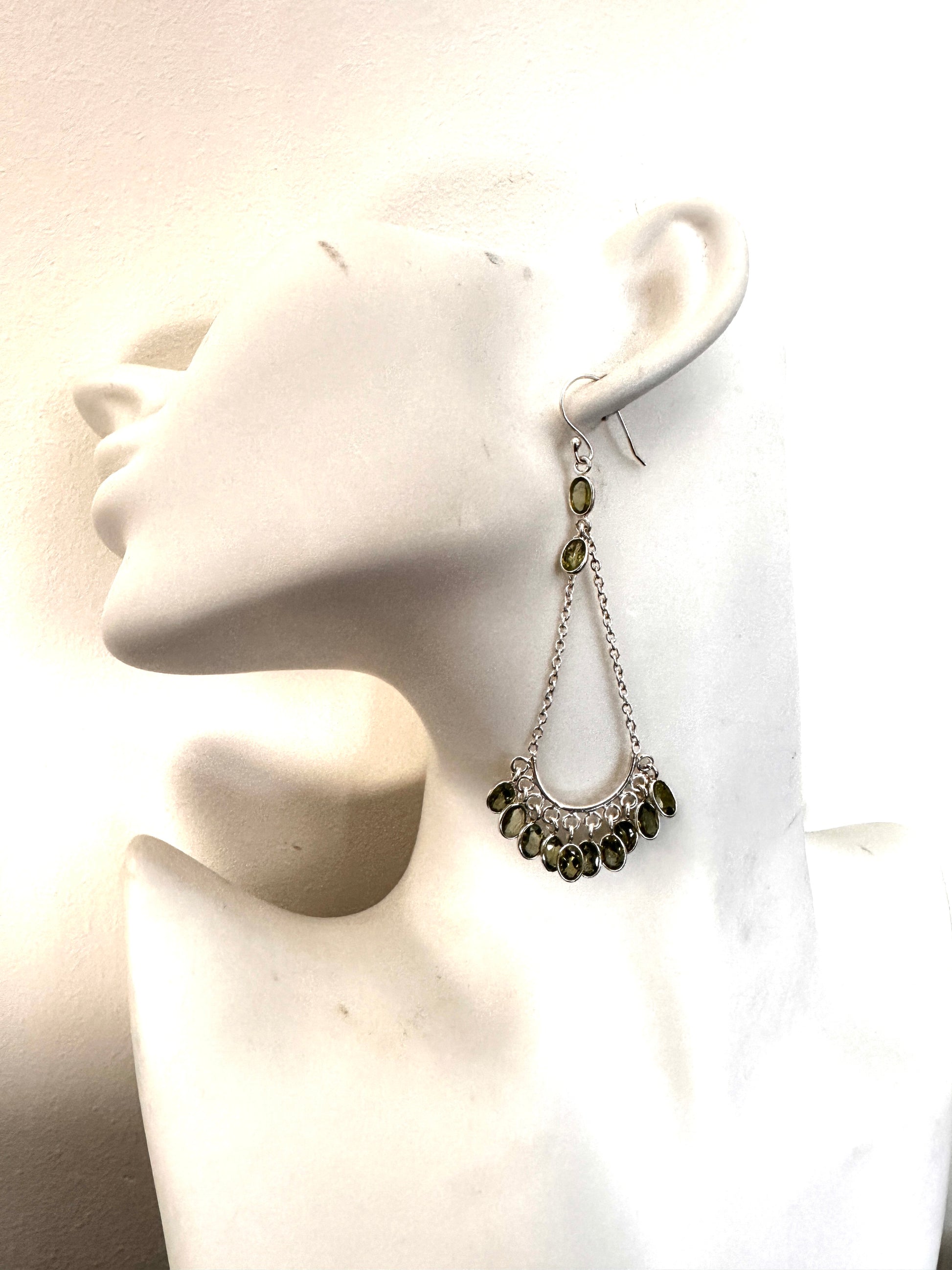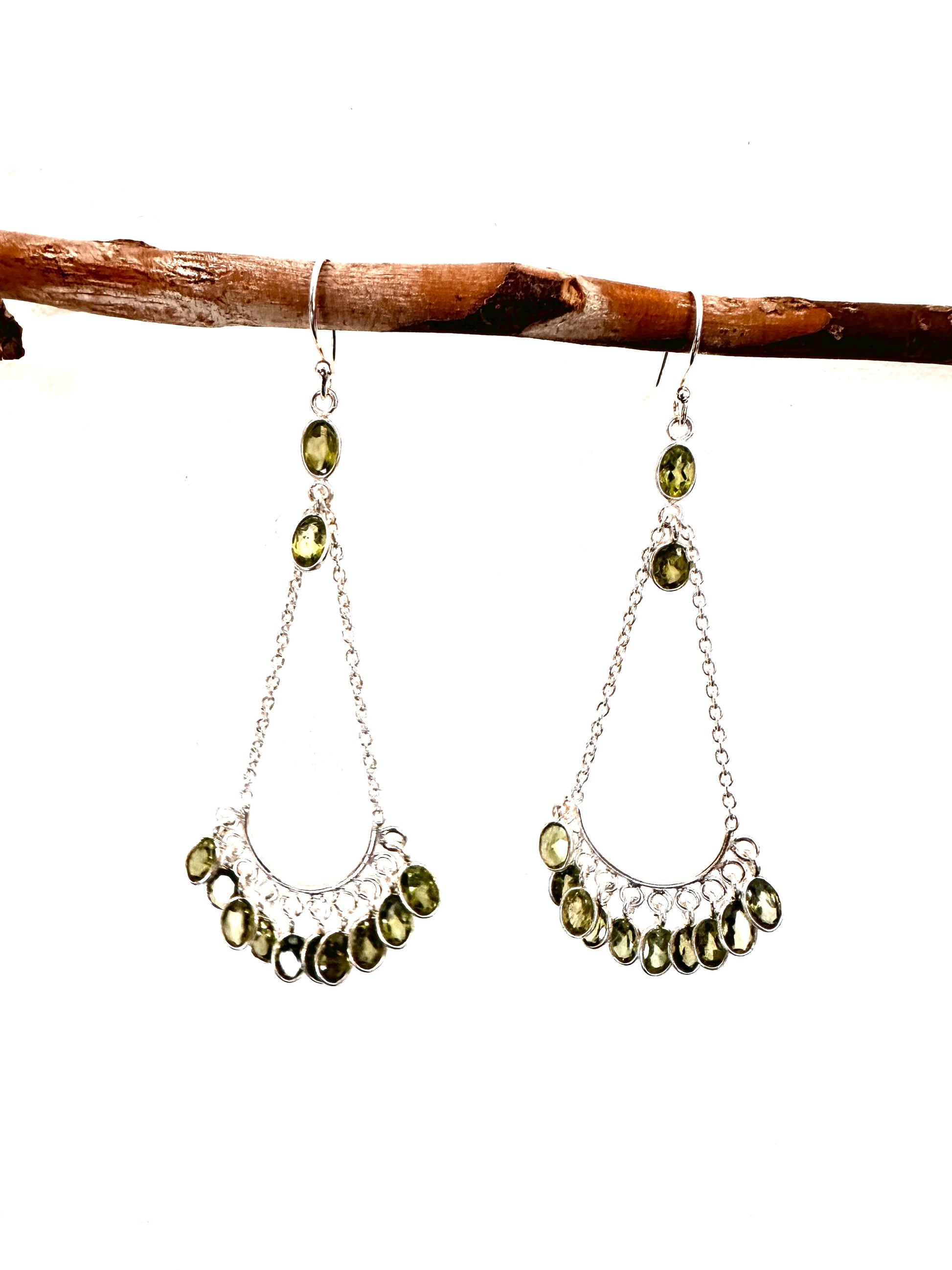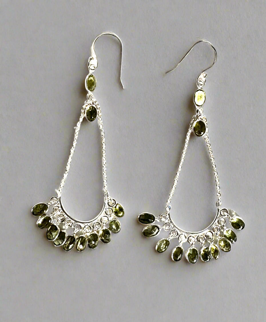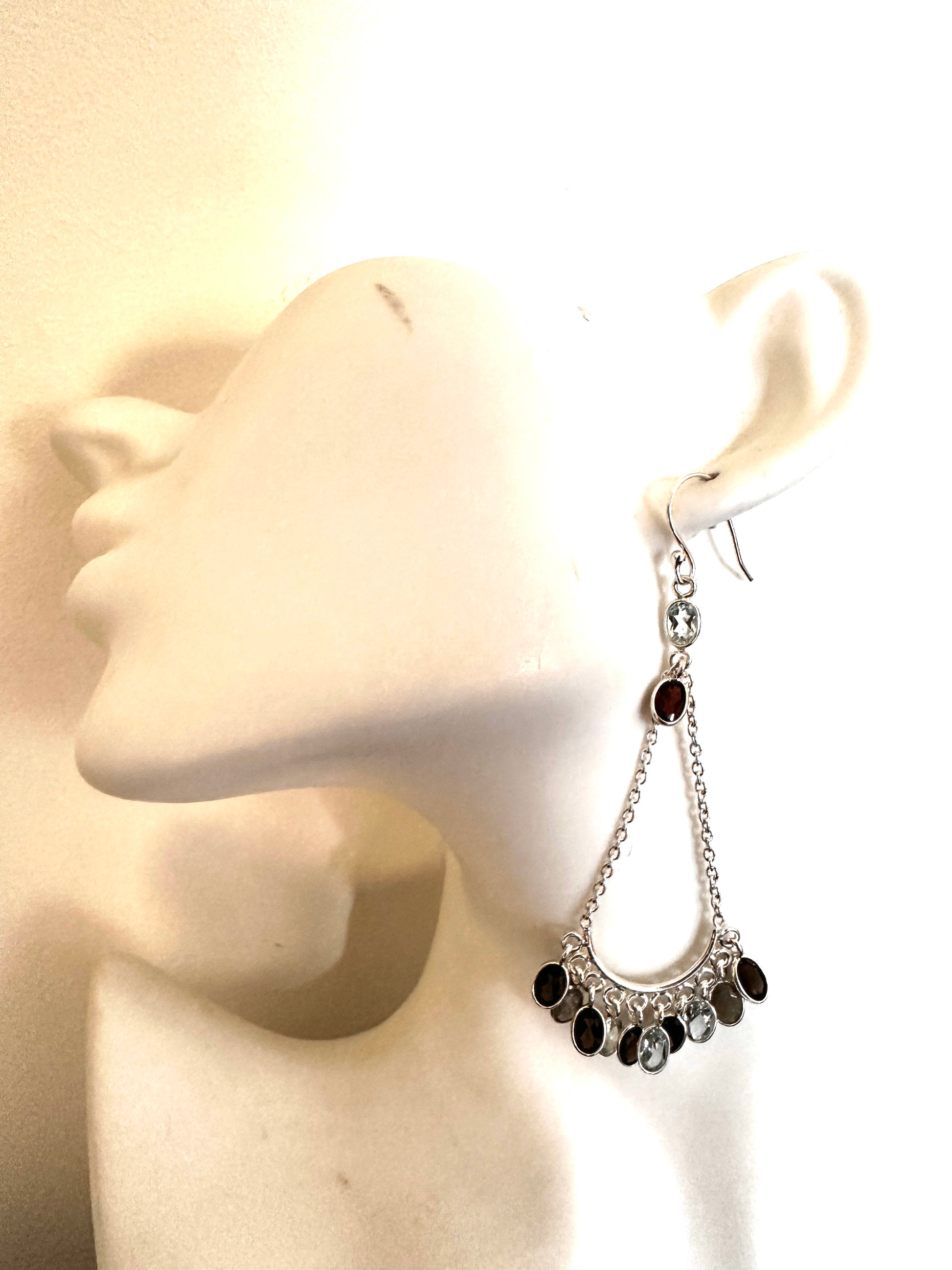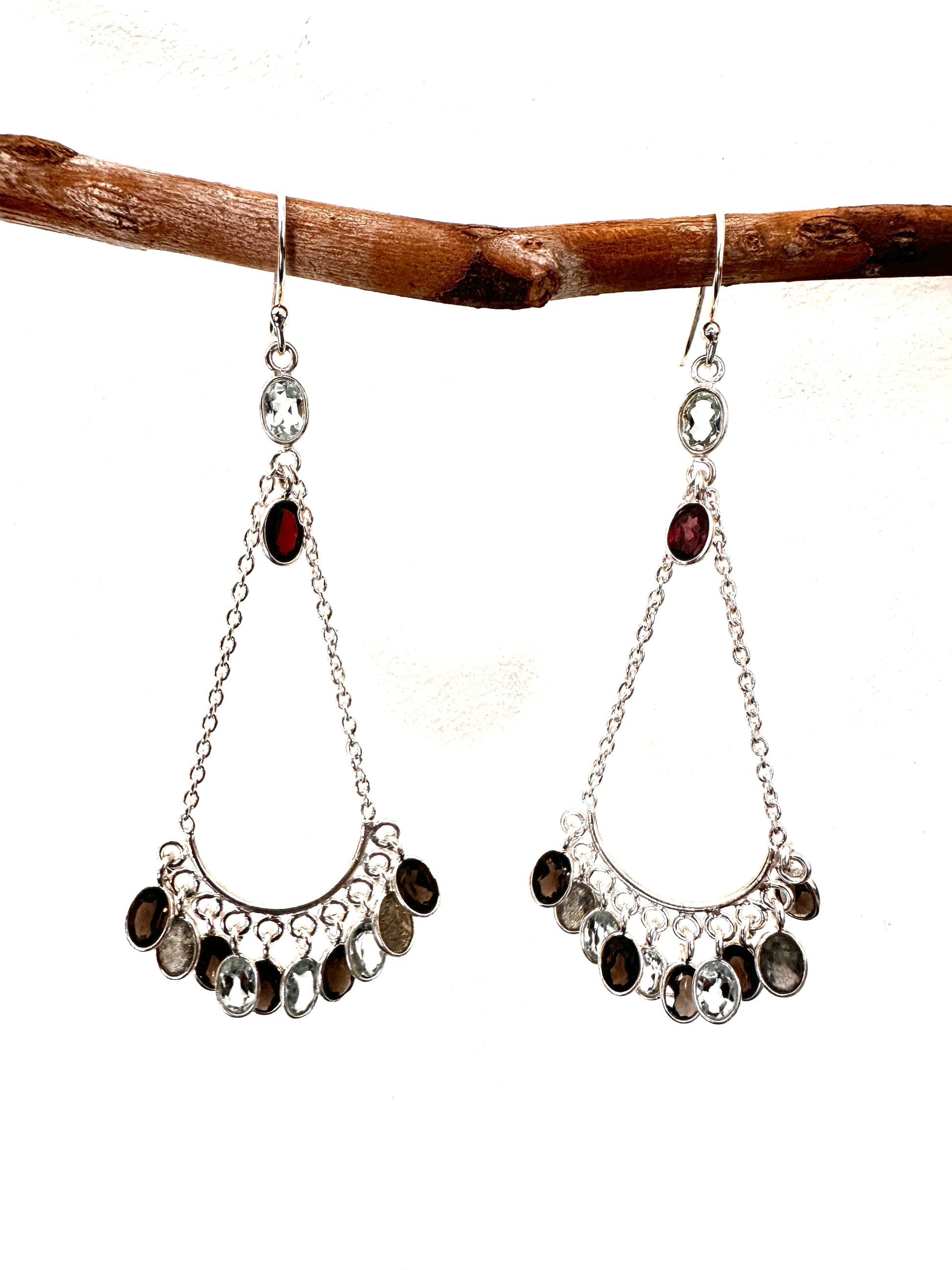 Elevate your style with this expertly crafted sterling silver chandelier earring, available in two striking variations. One pair showcases vibrant apple green peridots, while the other combines the rich hues of garnet, blue topaz, and smoky quartz. Each earring is designed to make a refined statement, blending artistry with premium gemstones for a sophisticated finish. Perfect for those who appreciate intricate design and quality craftsmanship.