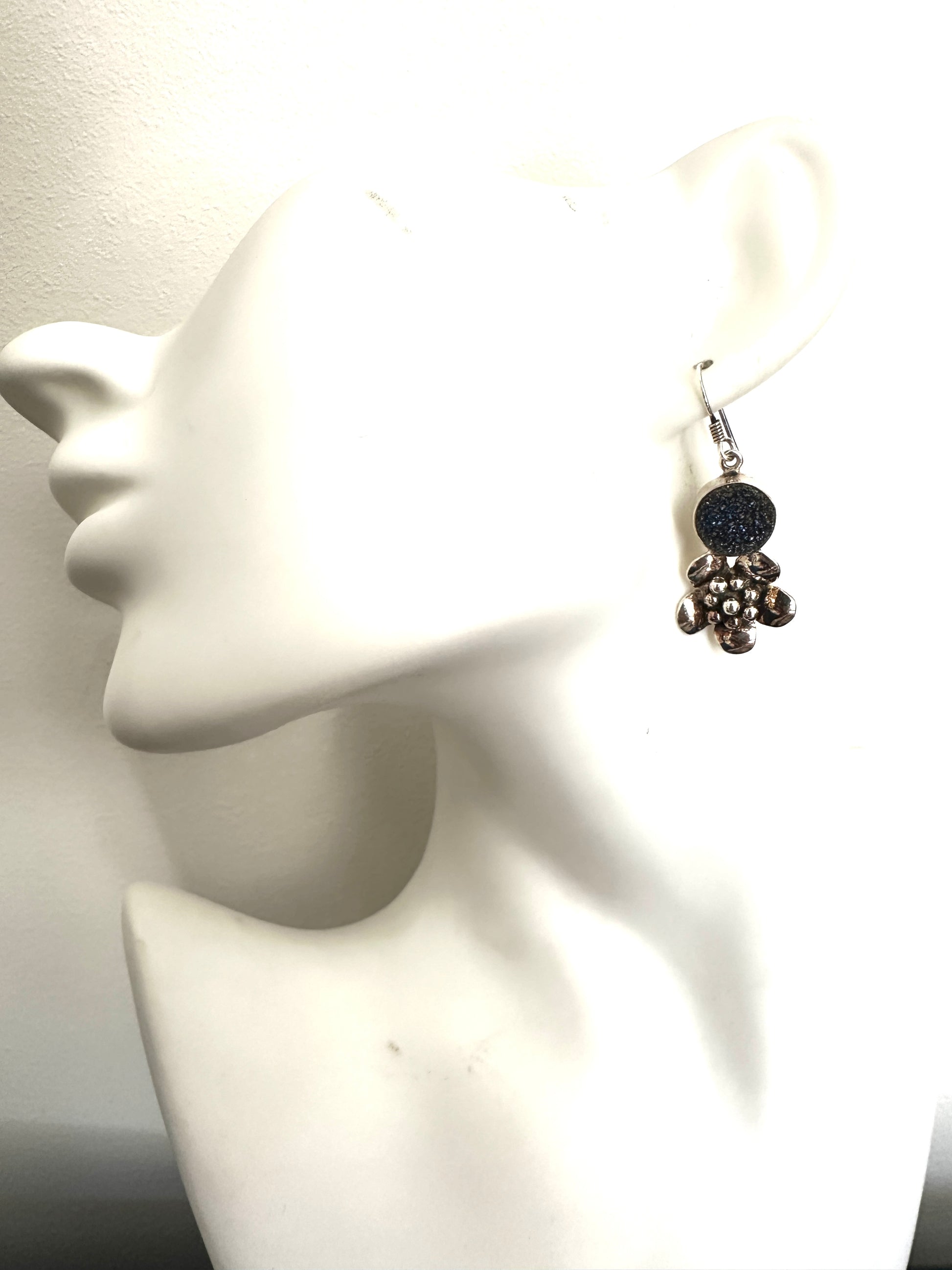 These captivating earrings feature handmade 925 silver cherry blossom flowers paired with blue titanium druzy stones, and suspended from 925 silver hooks. Enjoy the elegance and uniqueness of these one-of-a-kind accessories, perfect for any outfit or occasion. Craftsmanship and beauty come together in these meticulously designed earrings.