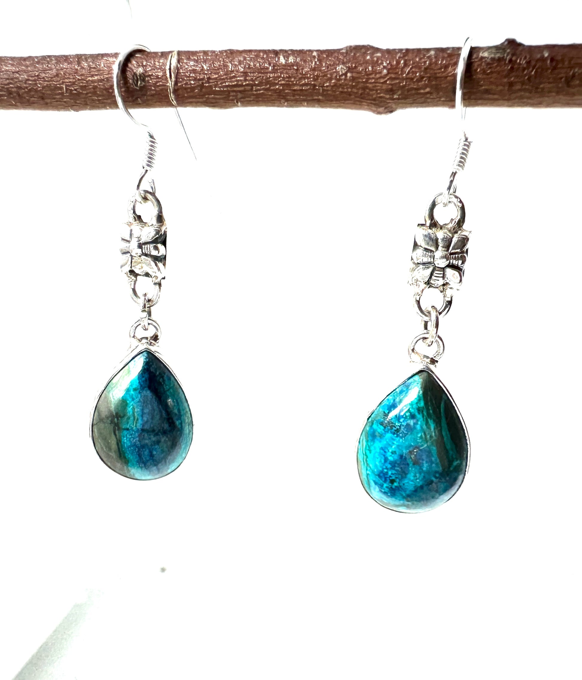 Enhance your wardrobe with the beauty and energy of Chrysocolla. These stunning drops, encased in 925 silver hooks, are complemented by a silver bead. Experience the calming and soothing benefits of this gemstone, perfect for everyday wear or special occasions.