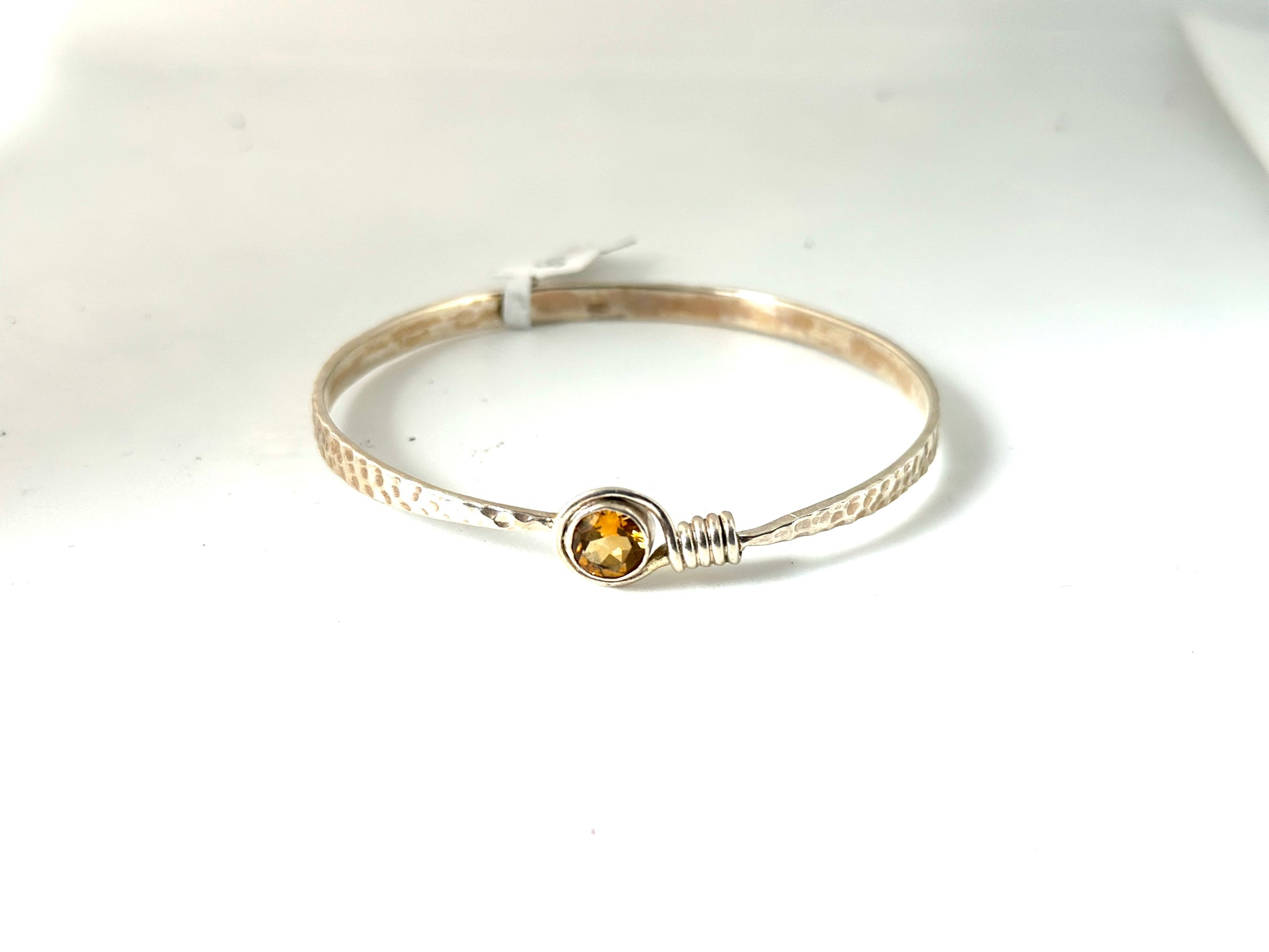 Handcrafted from high-quality 925 silver, this hammered bangle features a stunning citrine stone. With its bright yellow hue, the citrine stone brings positivity and clarity to its wearer. Express your unique style and add a touch of elegance to your outfit with this beautifully crafted bangle.