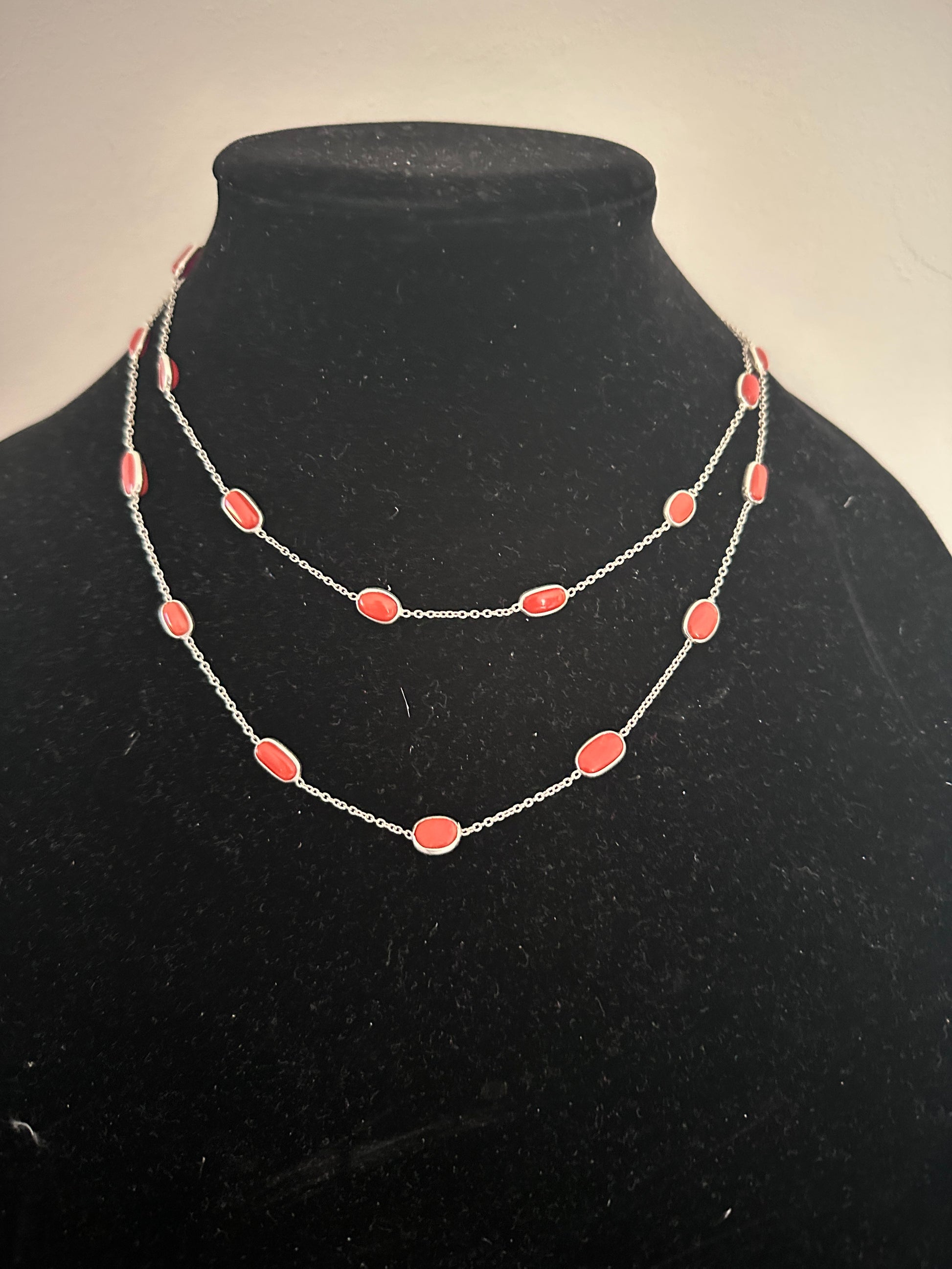 Add a pop of color to your outfit with gorgeous red coral on a 925 sterling silver long chain. The natural beauty of coral perfectly complements the elegance of sterling silver, creating a stunning and versatile accessory. This stunning chain can be worn as a single long chain or can be worn as a double wrap thanks to an openable clasp. Elevate your style and enhance your look with this unique piece.