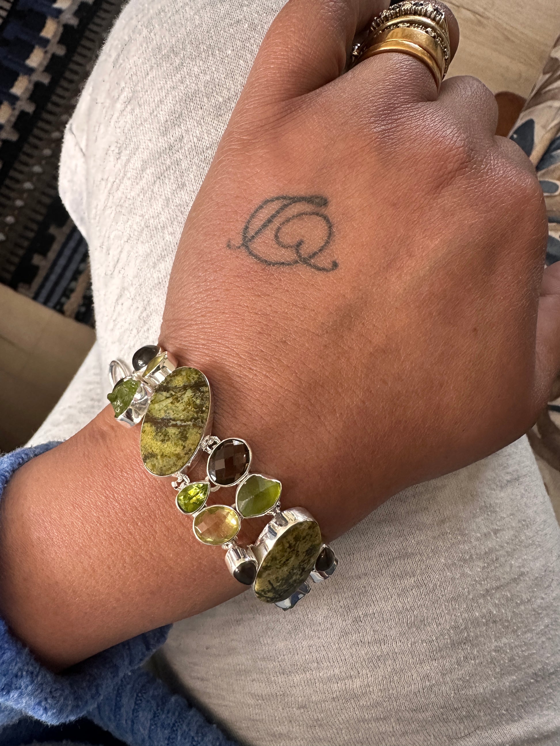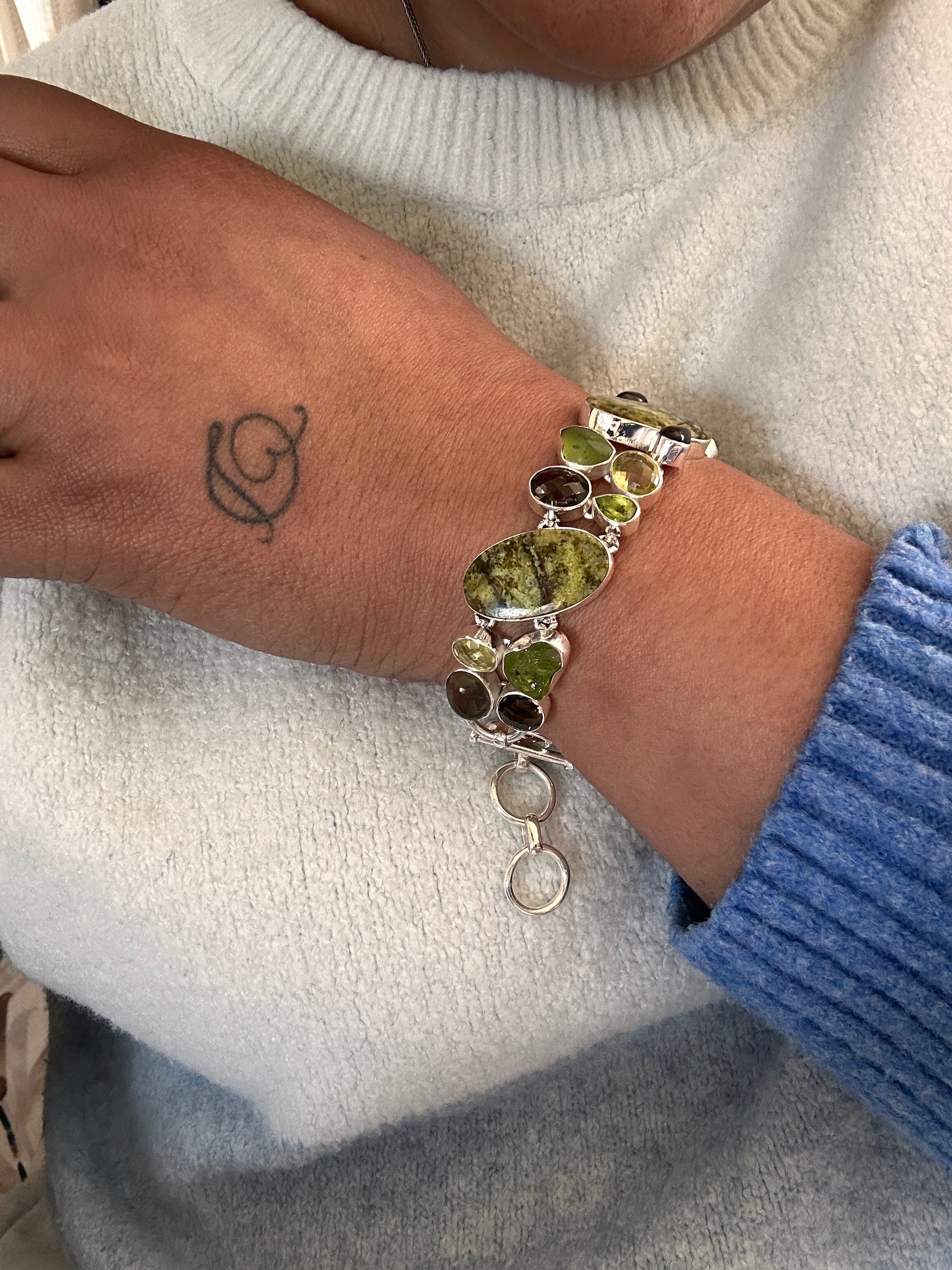 Grounded in nature, the Forest Jasper bracelet showcases rich green forest jasper paired with vibrant raw and polished peridots. Accented by smoky quartz, lemon quartz, and citrine, this piece combines earthy tones with bright, energizing hues. Expertly crafted, it offers both a connection to natural beauty and a balance of calming and uplifting energies.