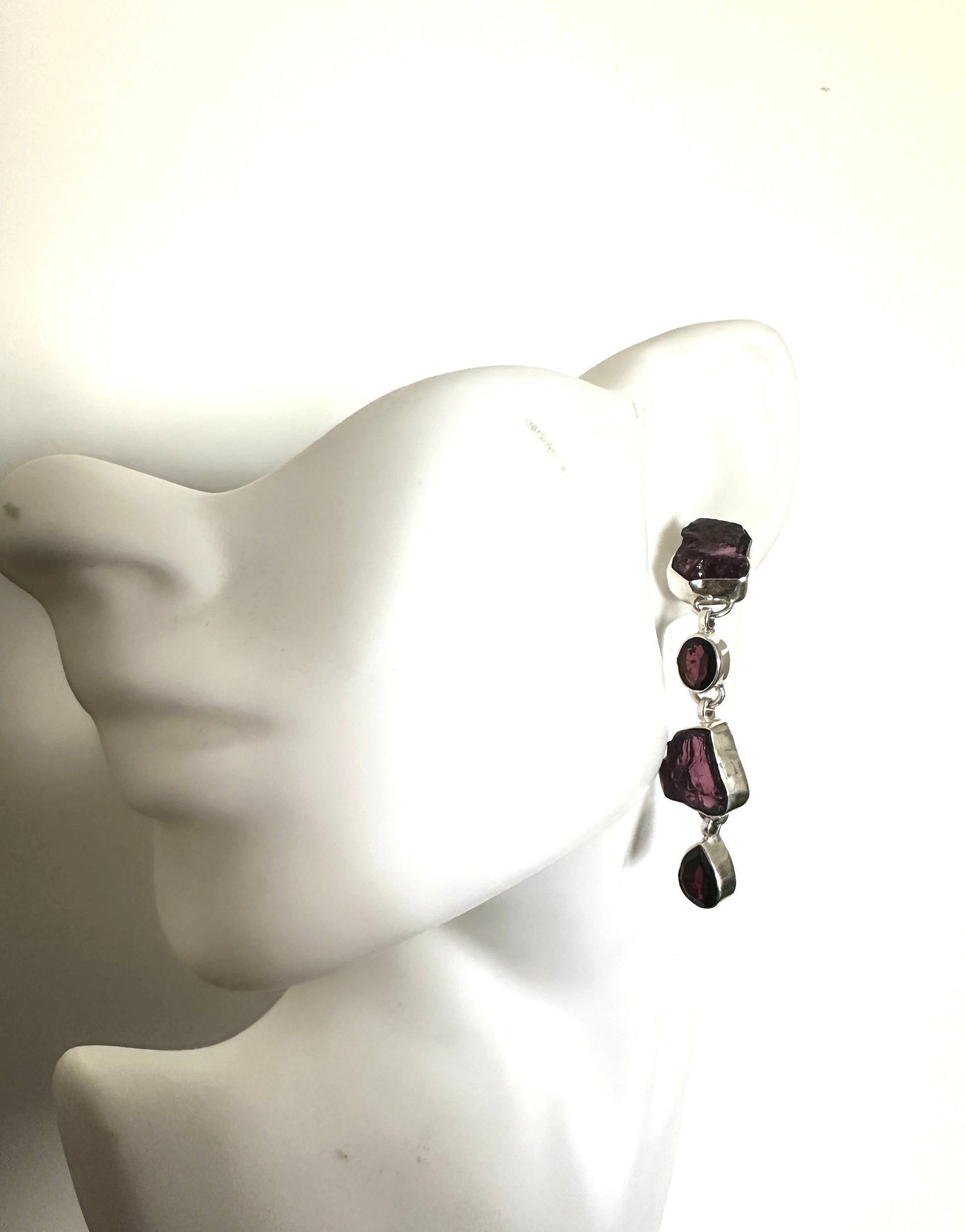 These raw and polished garnet earrings are a stunning addition to any jewelry collection. Interspaced with deep wine accents, these silver earrings exude a sense of elegance and sophistication. Expertly crafted and versatile, they are perfect for any occasion.