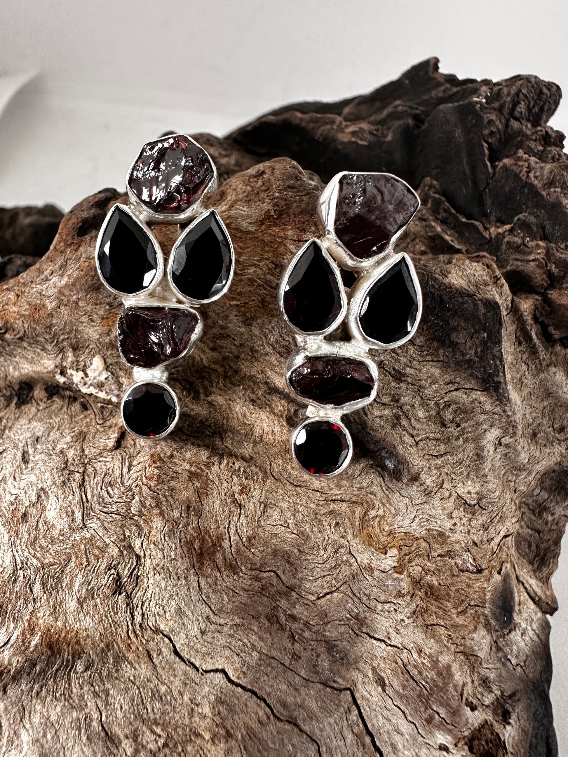 These elongated sterling silver studs showcase a sophisticated blend of raw natural garnets and polished garnets, highlighting the stone’s rich, deep hues. The contrast between the raw and polished textures creates a dynamic visual appeal, offering a refined yet organic aesthetic. Expertly crafted, these earrings elevate any ensemble with their unique design and timeless elegance.