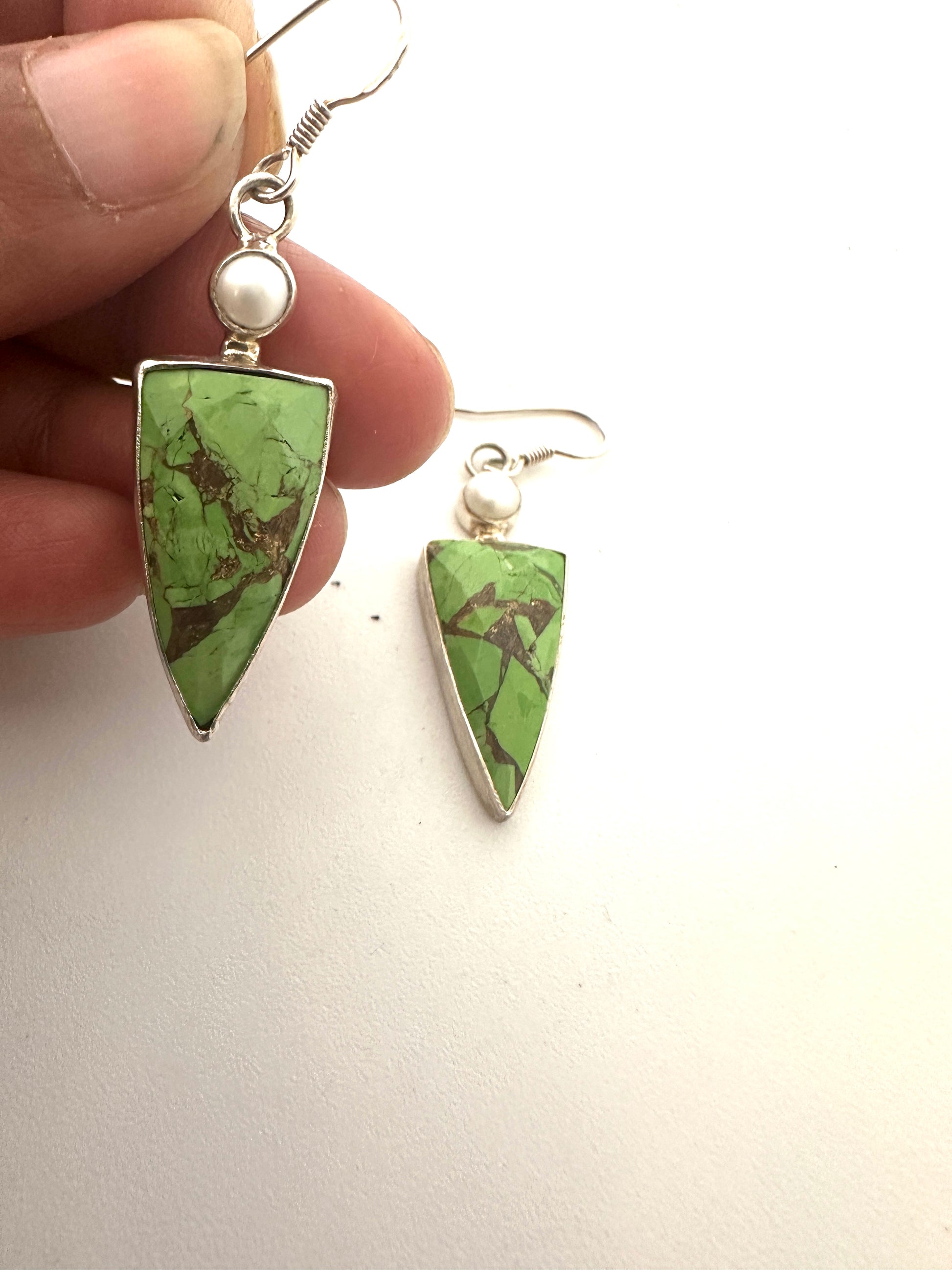 Expertly crafted, these Green Copper Turquoise earrings feature faceted stones and a freshwater pearl encased in high-quality 925 silver. The unique combination of materials creates a stunning and versatile accessory for any occasion. Elevate your style with the natural beauty and elegance of these earrings.