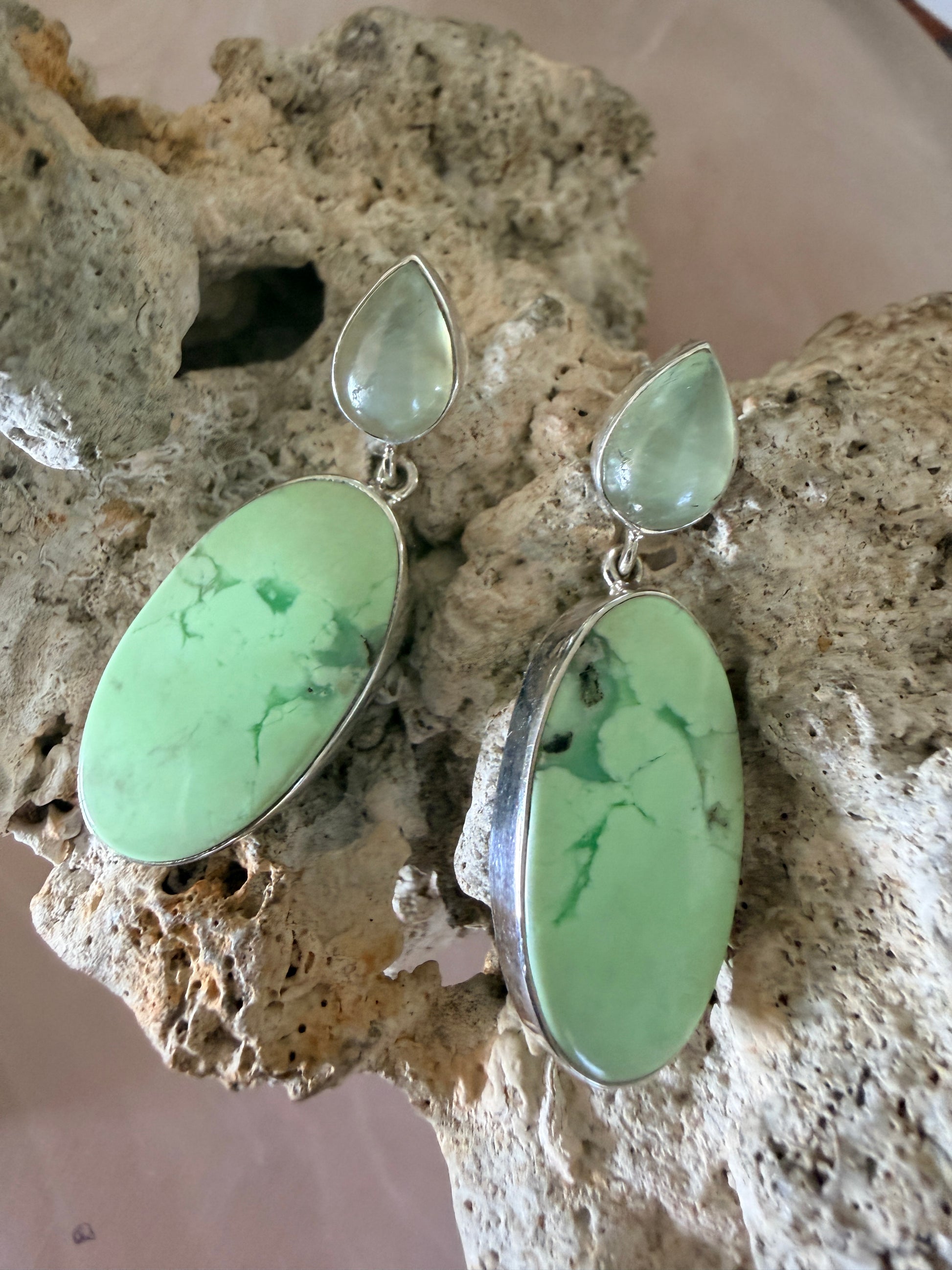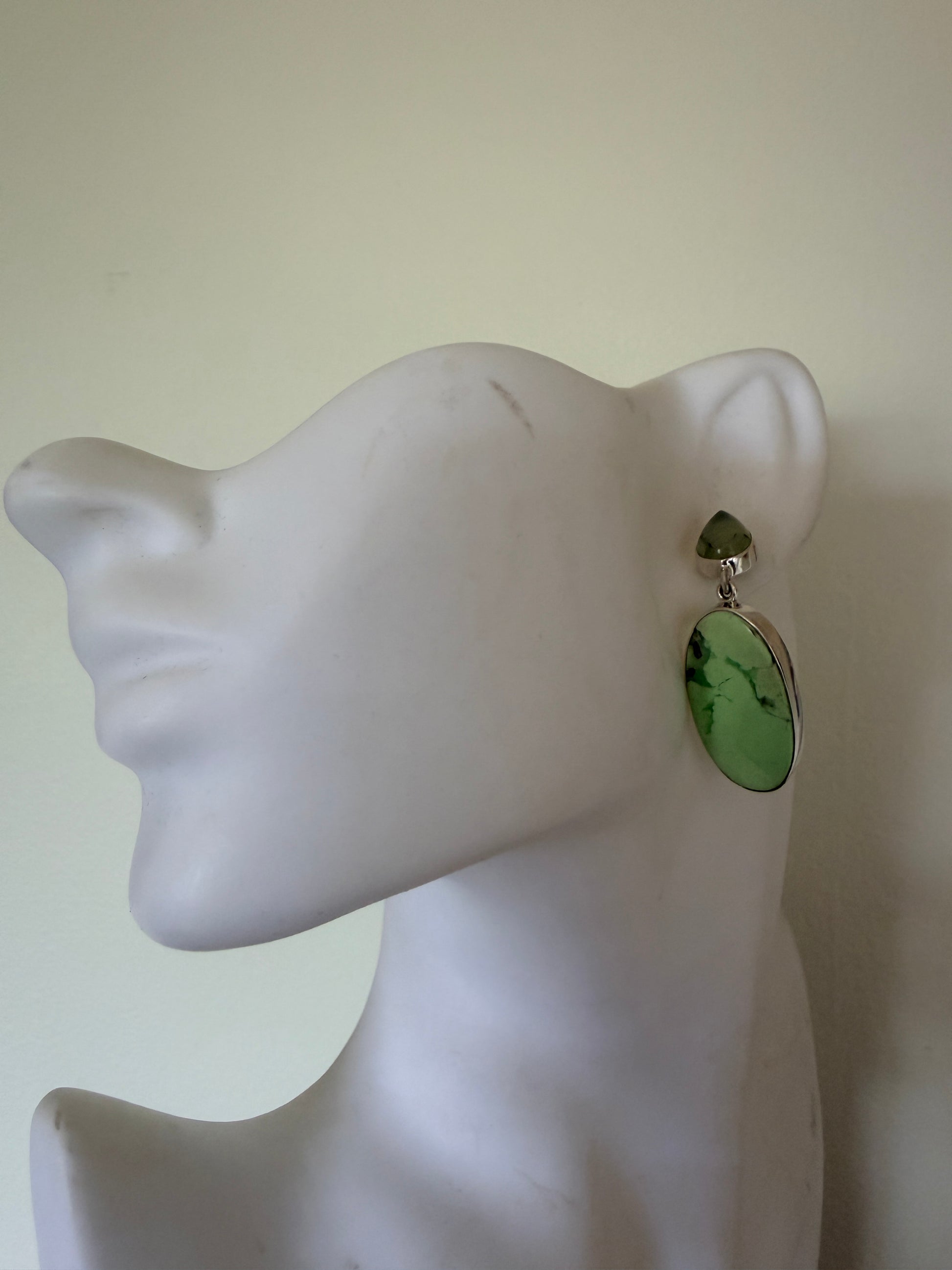 Green Kyanite with Lemon Chrysoprase Earrings These striking sterling silver earrings showcase the serene beauty of natural gemstones. Each piece features a luminous green kyanite teardrop stud paired with a bright lemon chrysoprase oval drop, creating an elegant contrast of cool and warm tones. The combination of these semi-precious stones offers visual depth and sophistication, making them a distinctive addition to any jewellery collection. Crafted in sterling silver for durability and timeless appeal, these earrings balance contemporary design with natural mineral elegance.