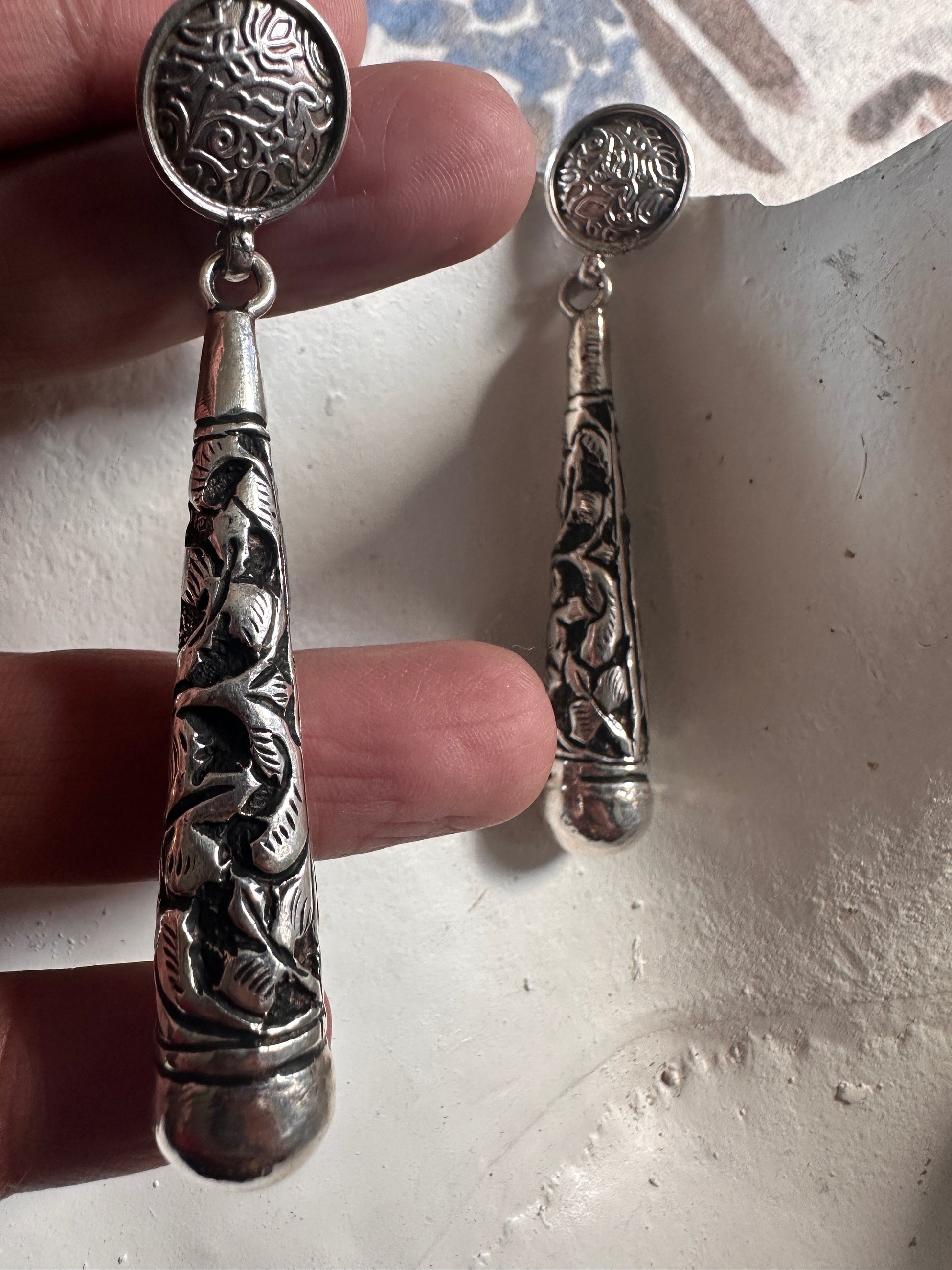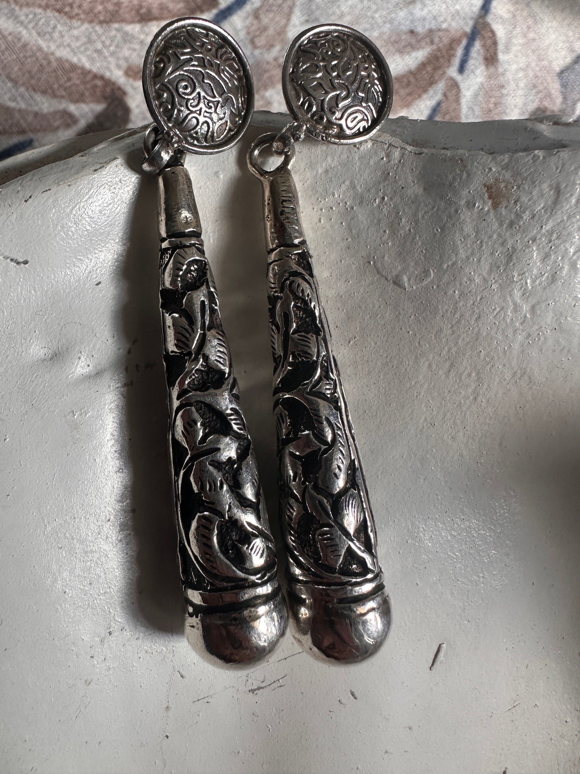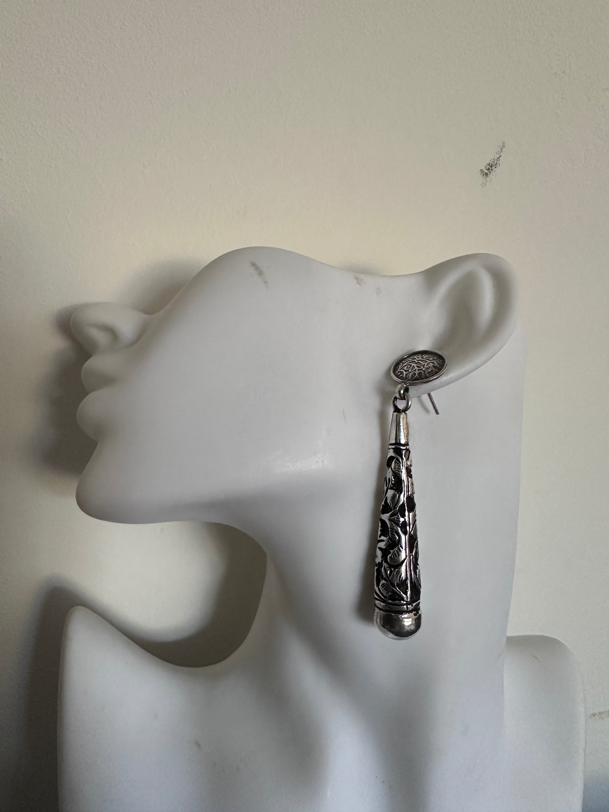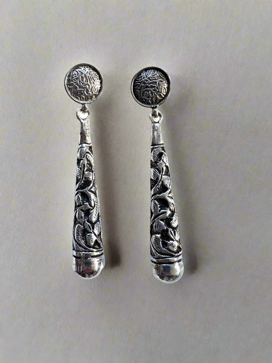 These Gulzar earrings showcase expert craftsmanship with their Persian-inspired design, meticulously engraved on solid sterling silver. Their intricate detailing reflects timeless elegance, making them a refined choice for those who appreciate cultural artistry and quality materials. Perfect for adding a sophisticated touch to any ensemble.