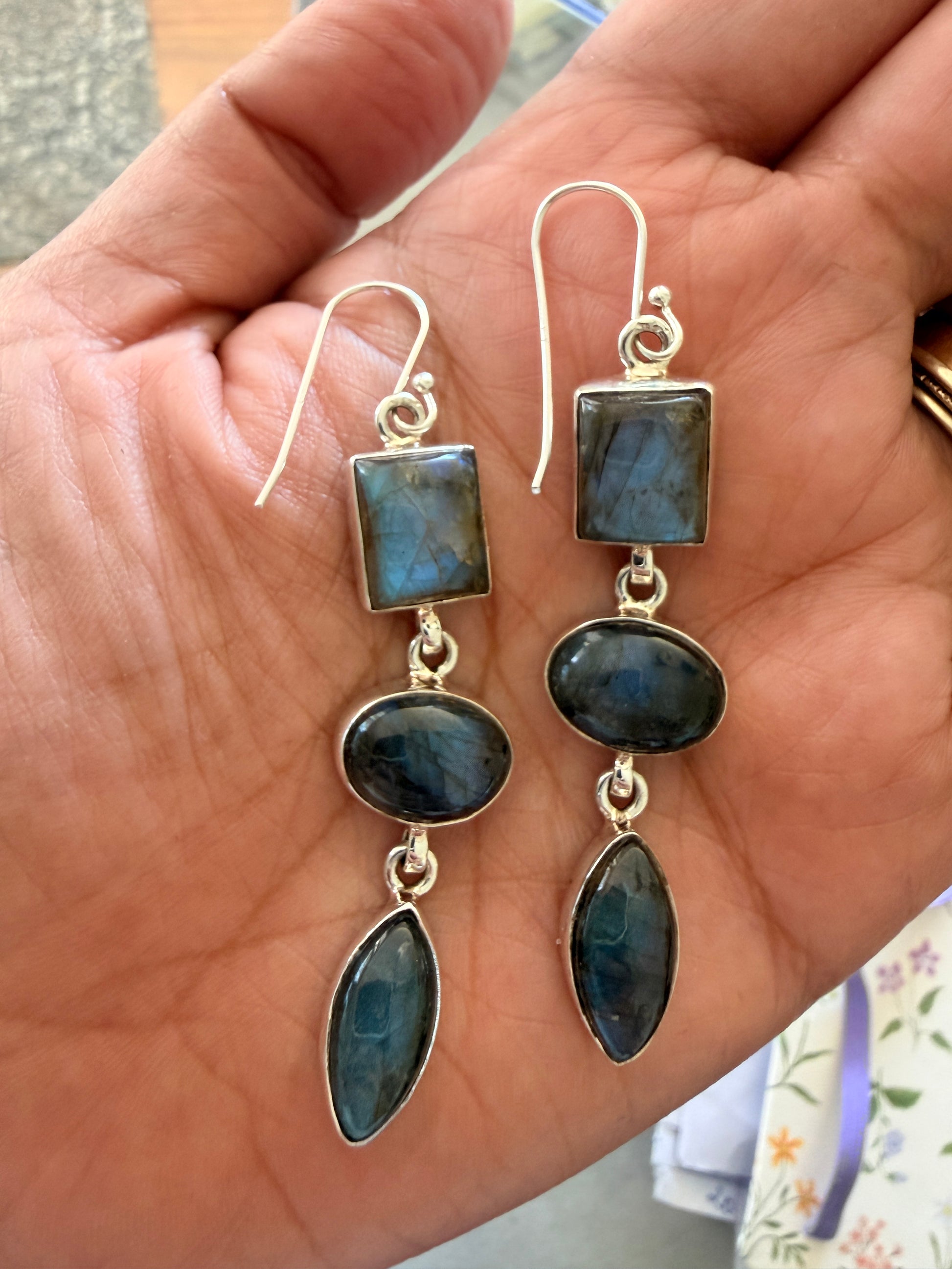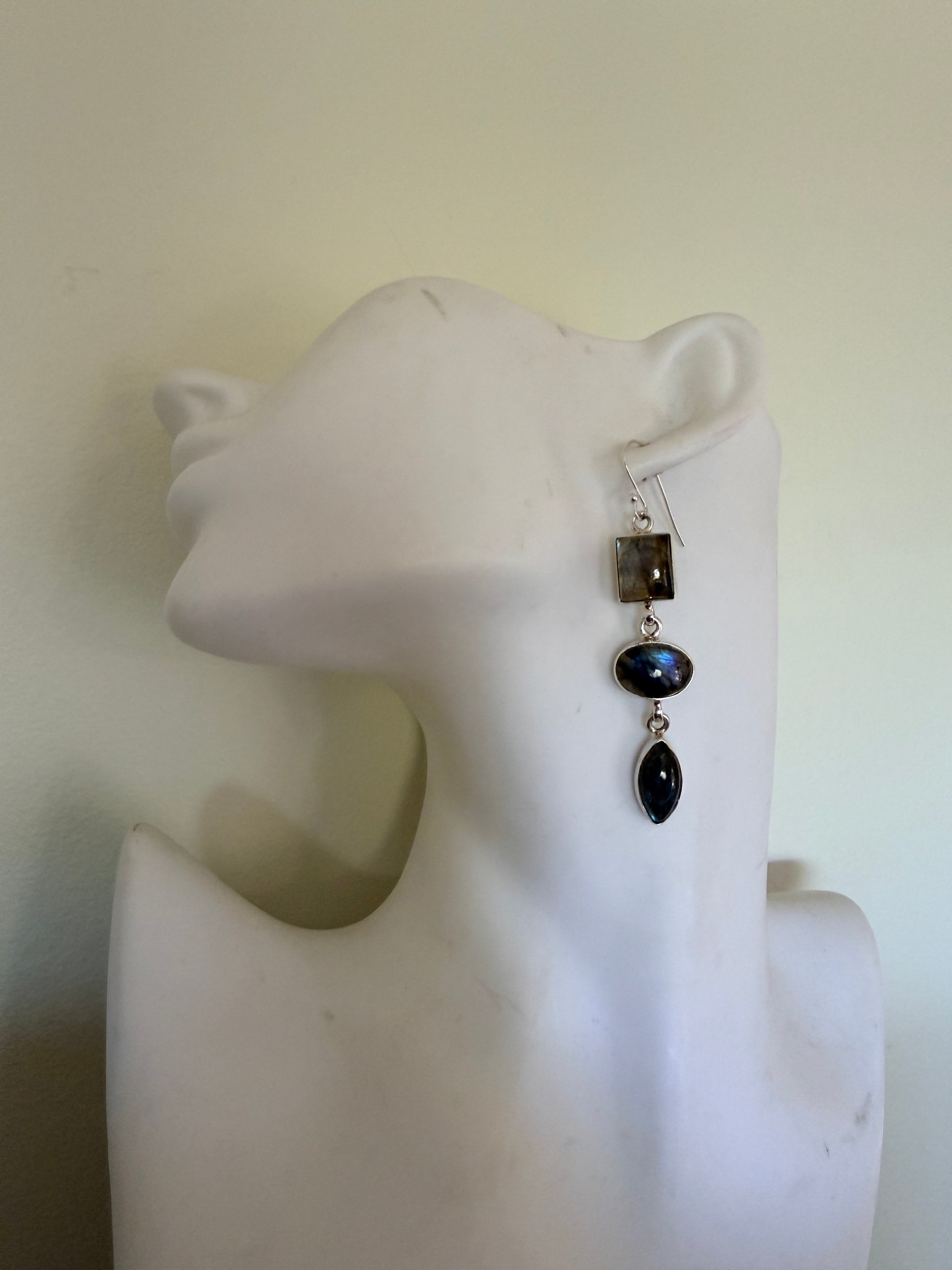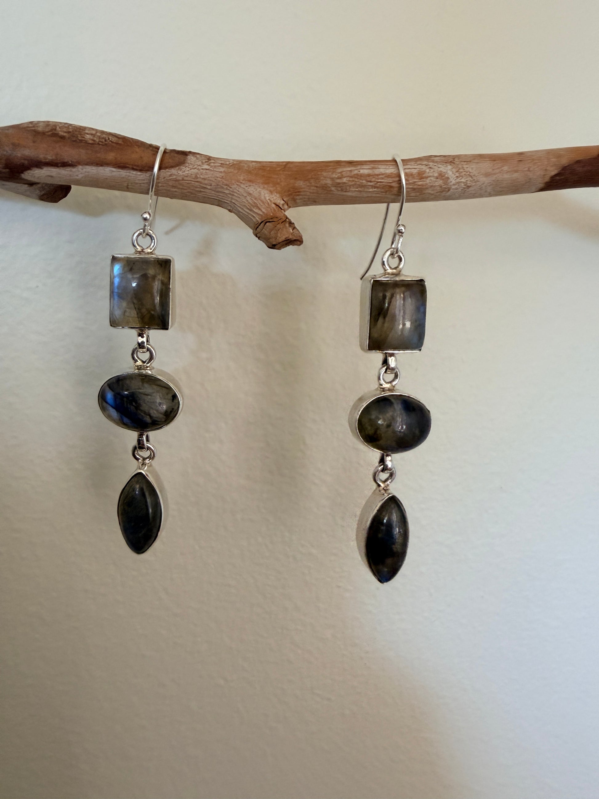 Labradorite Danglers showcase the mesmerizing play-of-color that makes this feldspar gemstone so prized by collectors. These sterling silver earrings feature labradorite in three distinct shapes—combining round, oval, and cushion cuts—to highlight the stone's characteristic labrescence from multiple angles. The cool grey-blue flash that dances across each stone creates an ever-changing visual effect as light catches the surface. Crafted in premium sterling silver with secure settings, these danglers offer sophisticated everyday elegance with a touch of natural mystique. Perfect for those who appreciate gemstone jewelry with genuine mineralogical character.