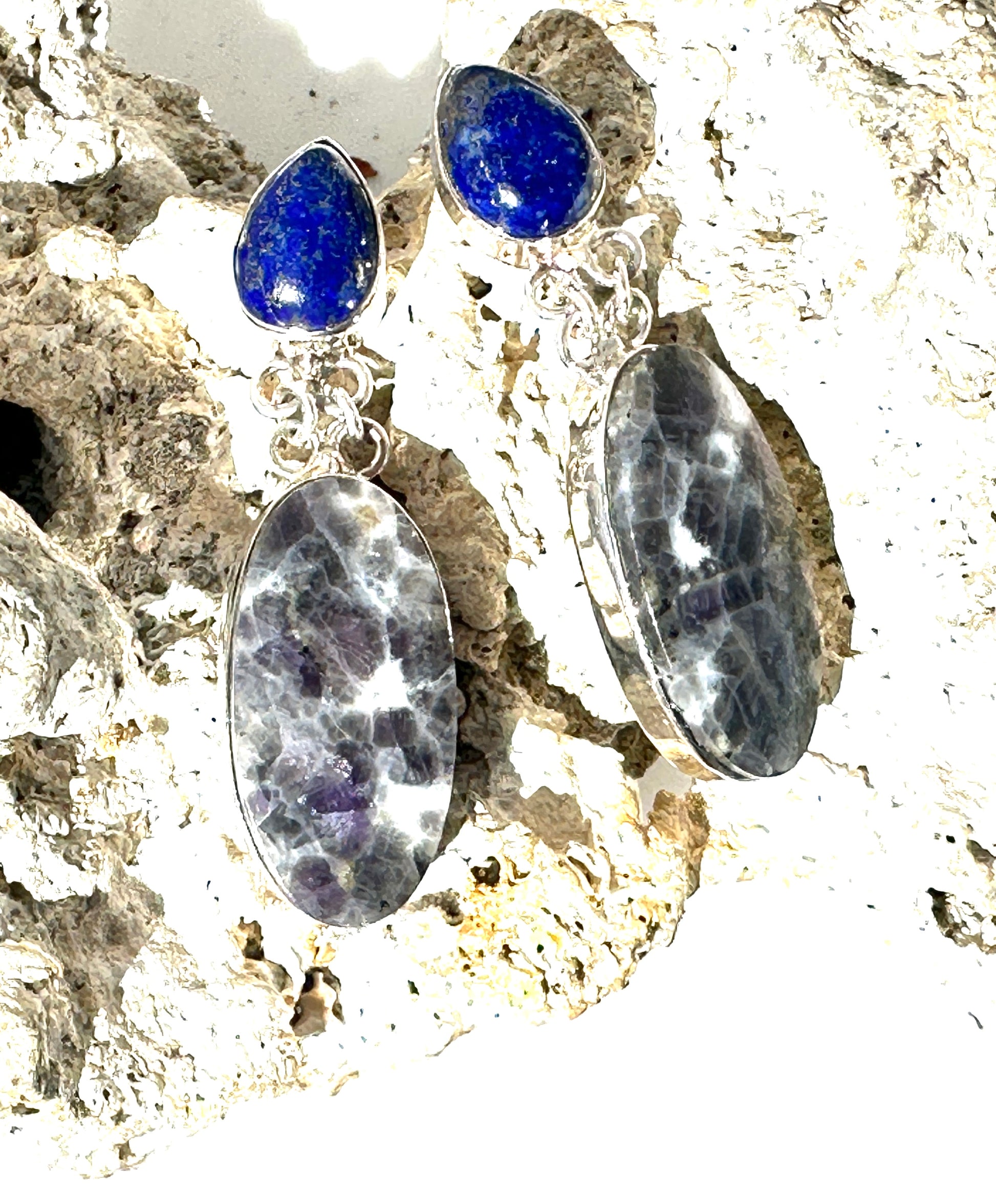 Crafted from high-quality 925 silver, these elegant earrings feature stunning Lapidolite and Lapis Lazuli stones. The unique link design effortlessly separates the two stones, adding a touch of sophistication to any outfit. With their calming properties and stylish design, these earrings are the perfect addition to any jewelry collection.