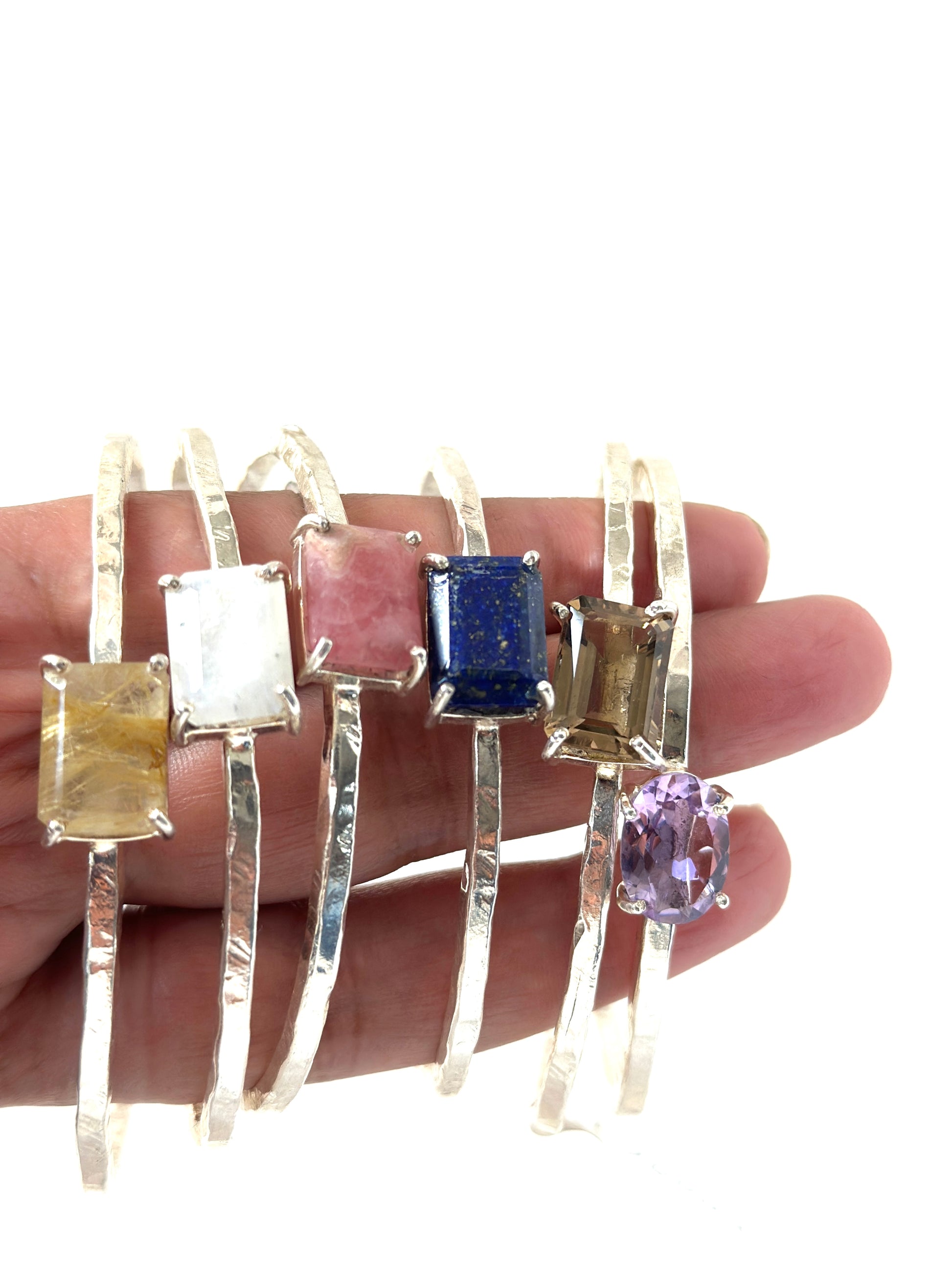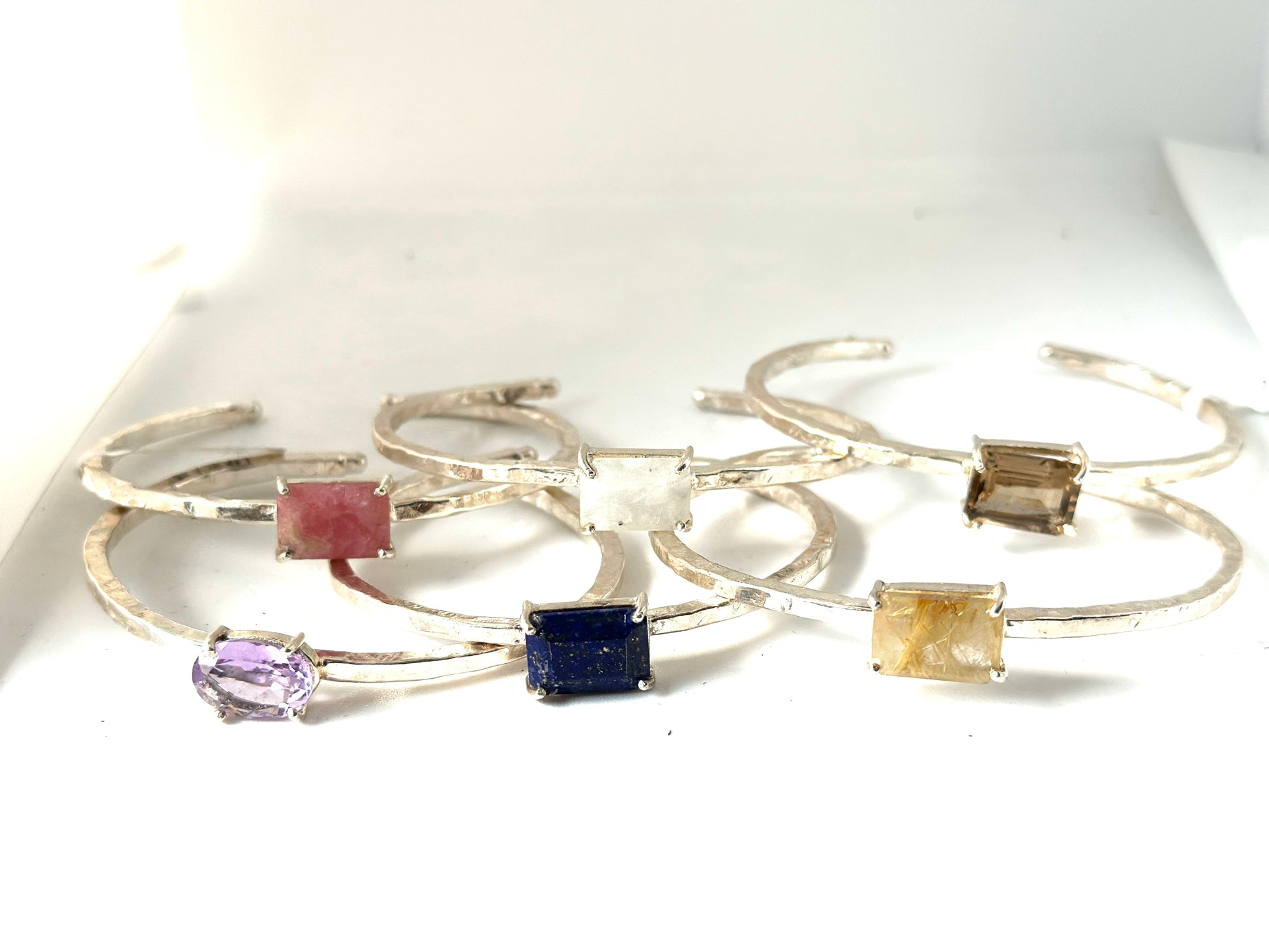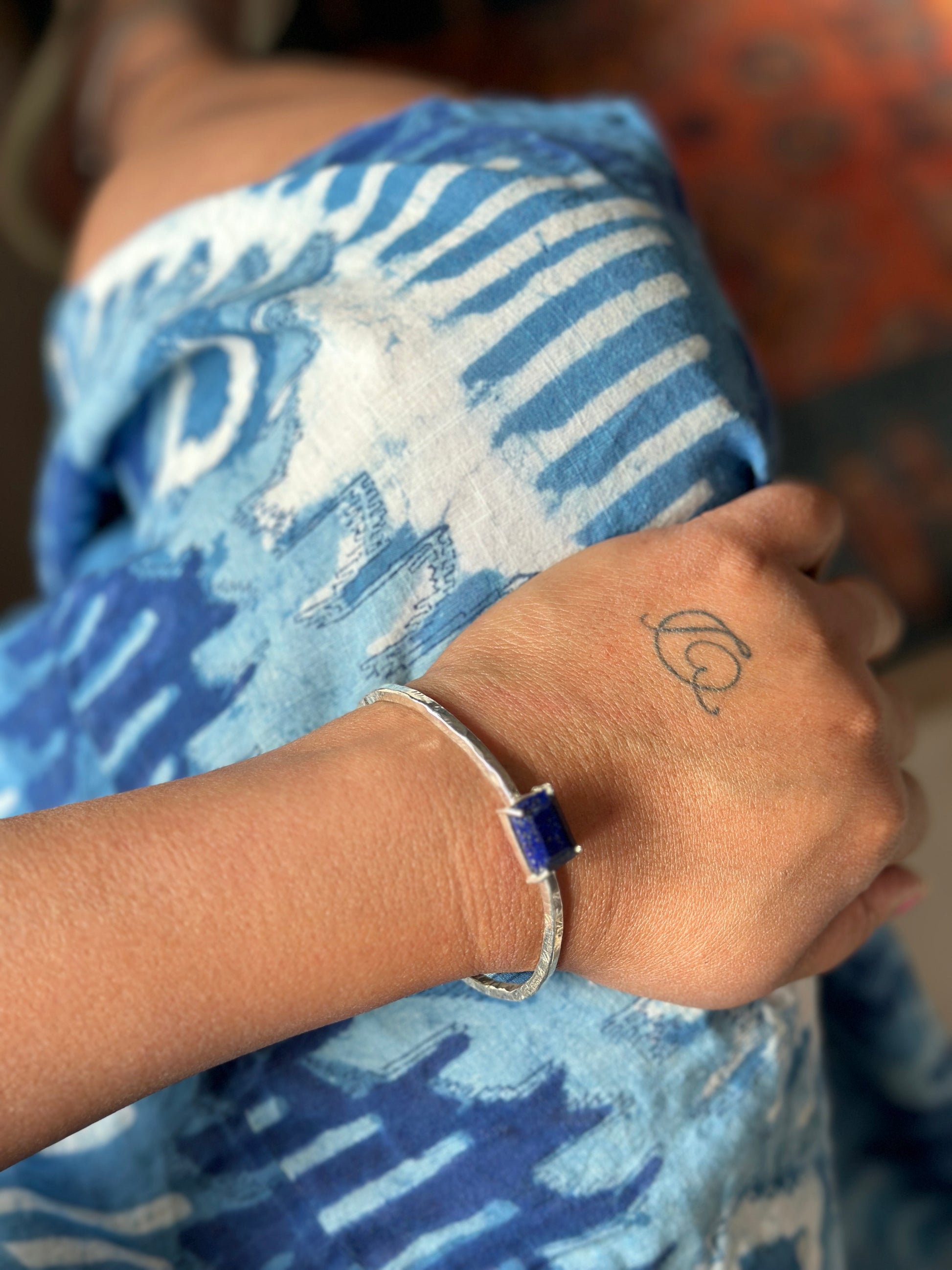 This 925 silver adjustable cuff is the perfect accessory for a minimalistic look. Featuring a single polished faceted Lapis Lazuli stone, this piece adds a touch of elegance to any outfit. The adjustable design ensures a comfortable fit for all.