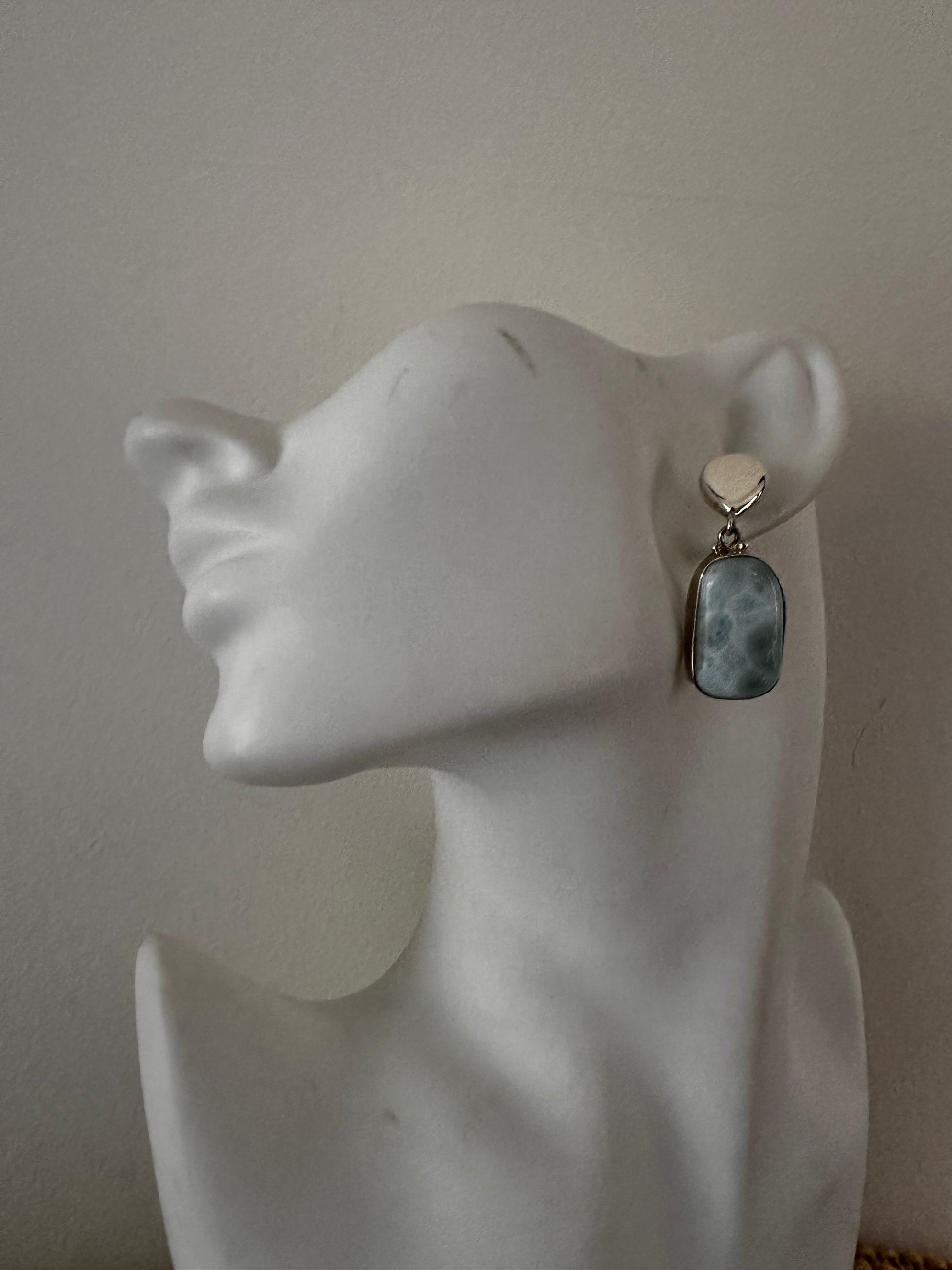 This elegant piece features a large larimar stone encased in a sleek sterling silver setting, hanging gracefully from sterling silver studs. The natural blue hues of the larimar are beautifully complemented by the polished silver, creating a sophisticated accessory that enhances any look with a touch of refined elegance. Ideal for those who appreciate expert craftsmanship and unique, timeless jewelry.