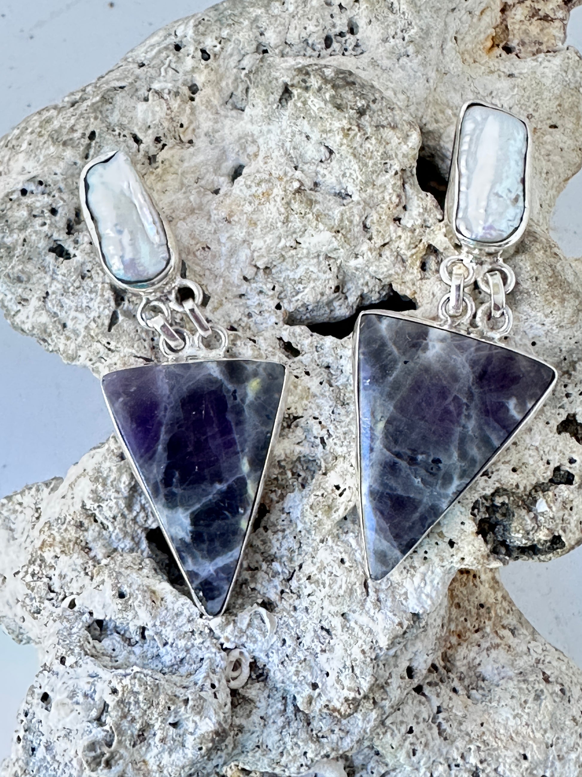 Expertly crafted 925 sterling silver earrings featuring striking purple-shaded Lepidolite triangles suspended from lustrous Biwa Pearl studs. The contrasting elements create a sophisticated visual tension, while the one-of-a-kind design ensures exclusivity. These unique statement pieces blend natural gemstone beauty with artisanal silversmithing techniques.