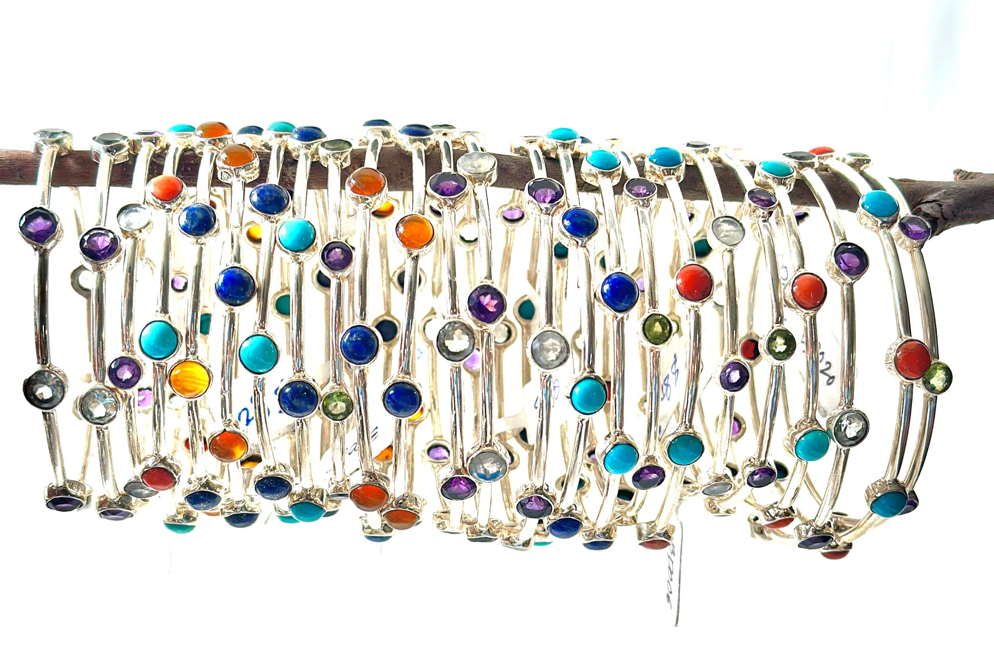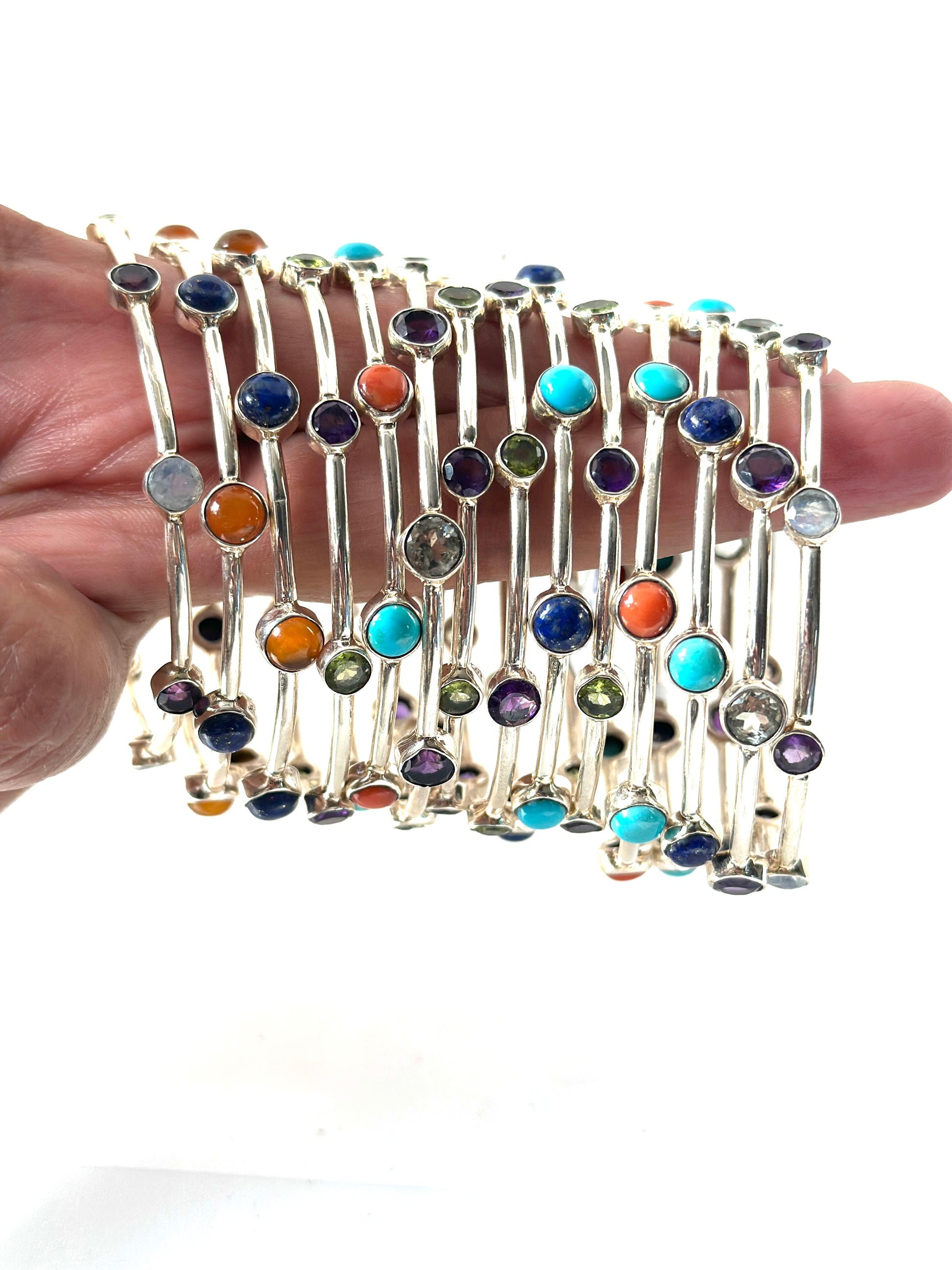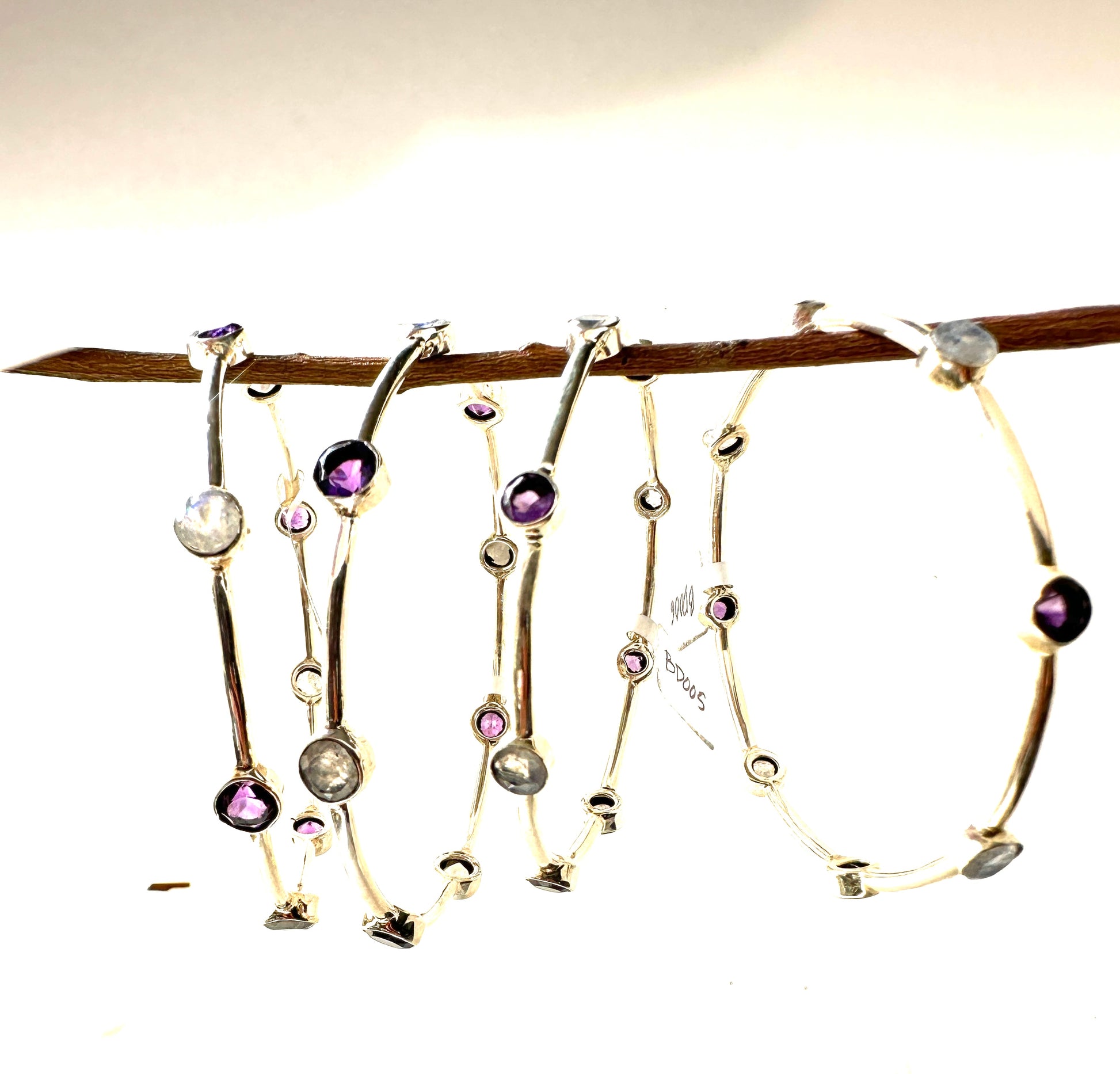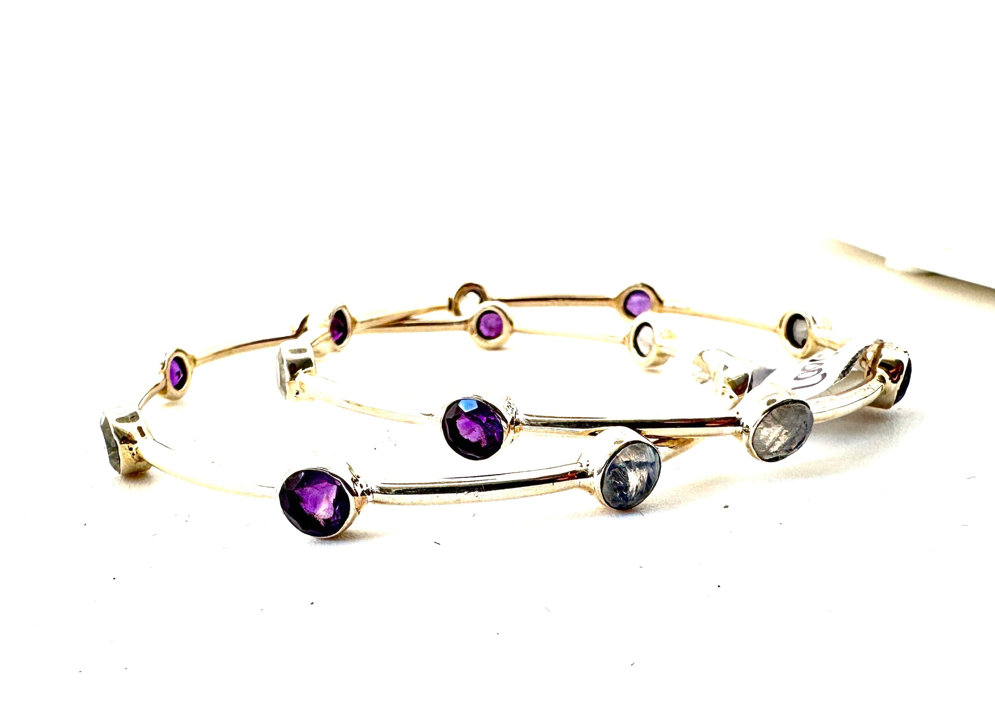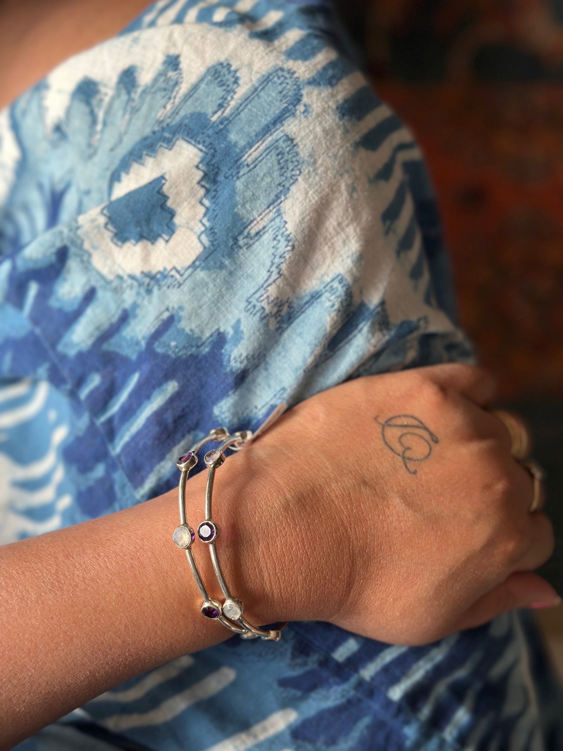 Discover the perfect balance of elegance and versatility with our Moonstone bangle. Crafted from a combination of rainbow moonstone and amethyst, this 925 silver bangle is a stunning addition to your daily wear. Wear it solo for a delicate daytime look, or stack it up for a glamorous night look.