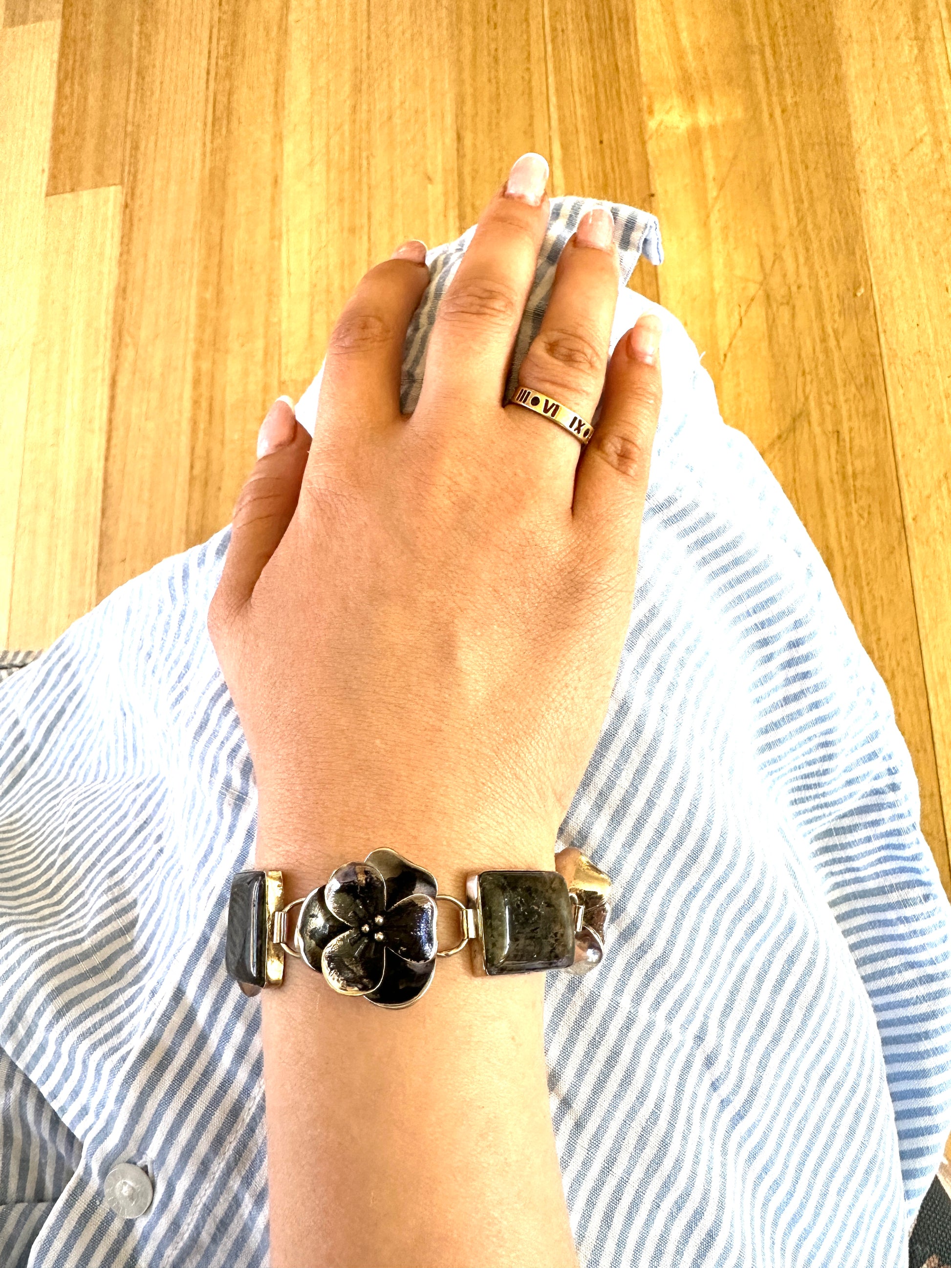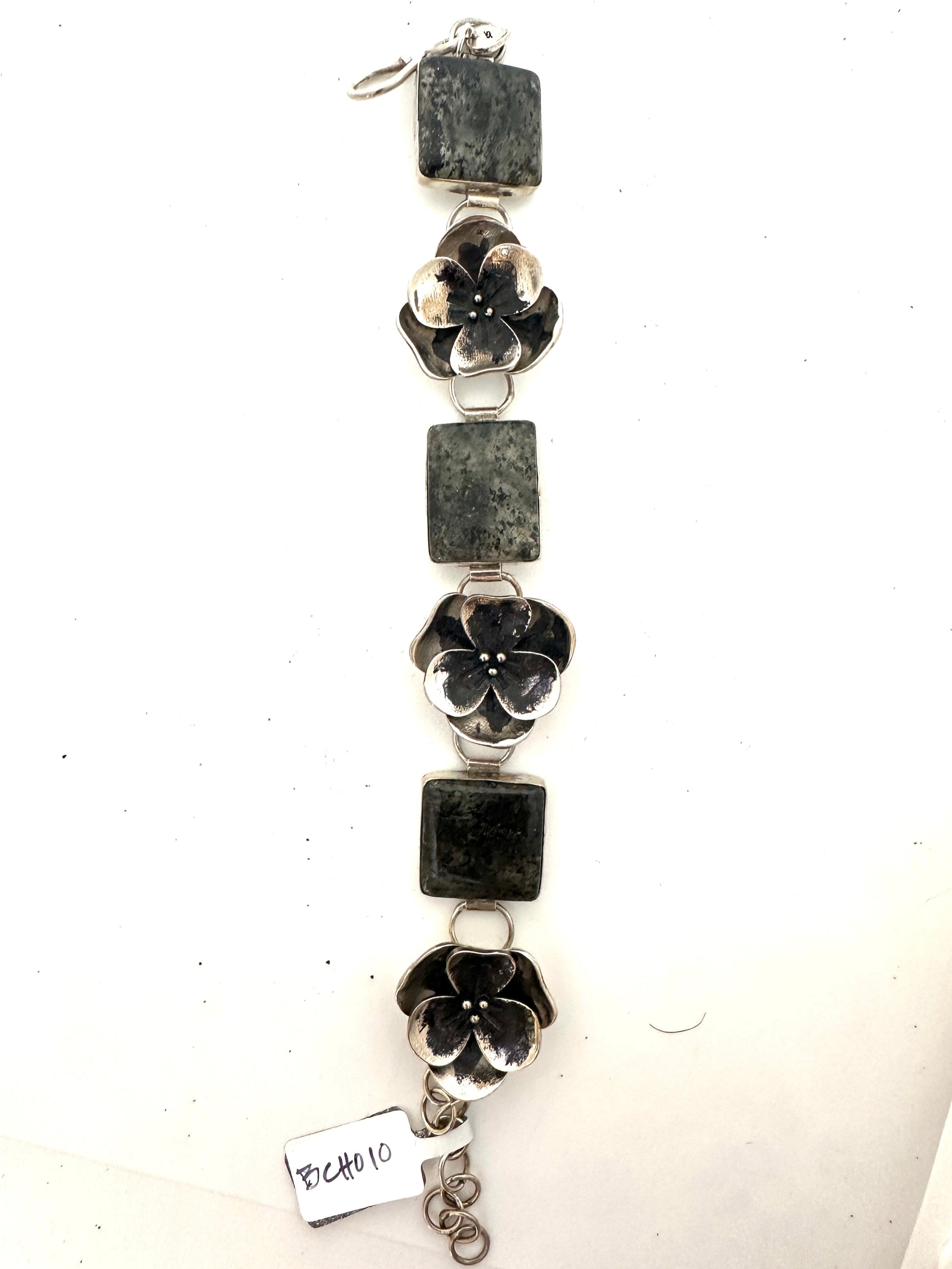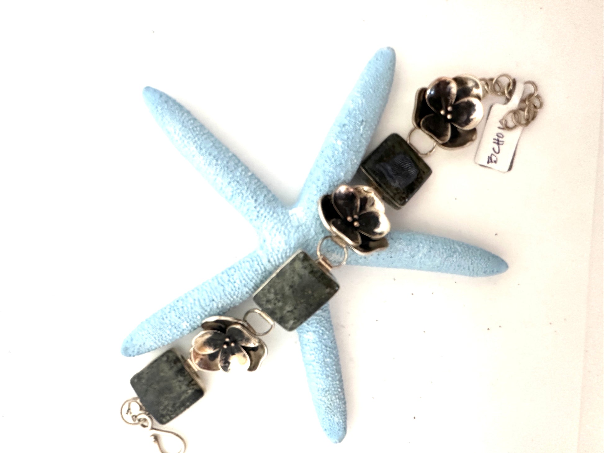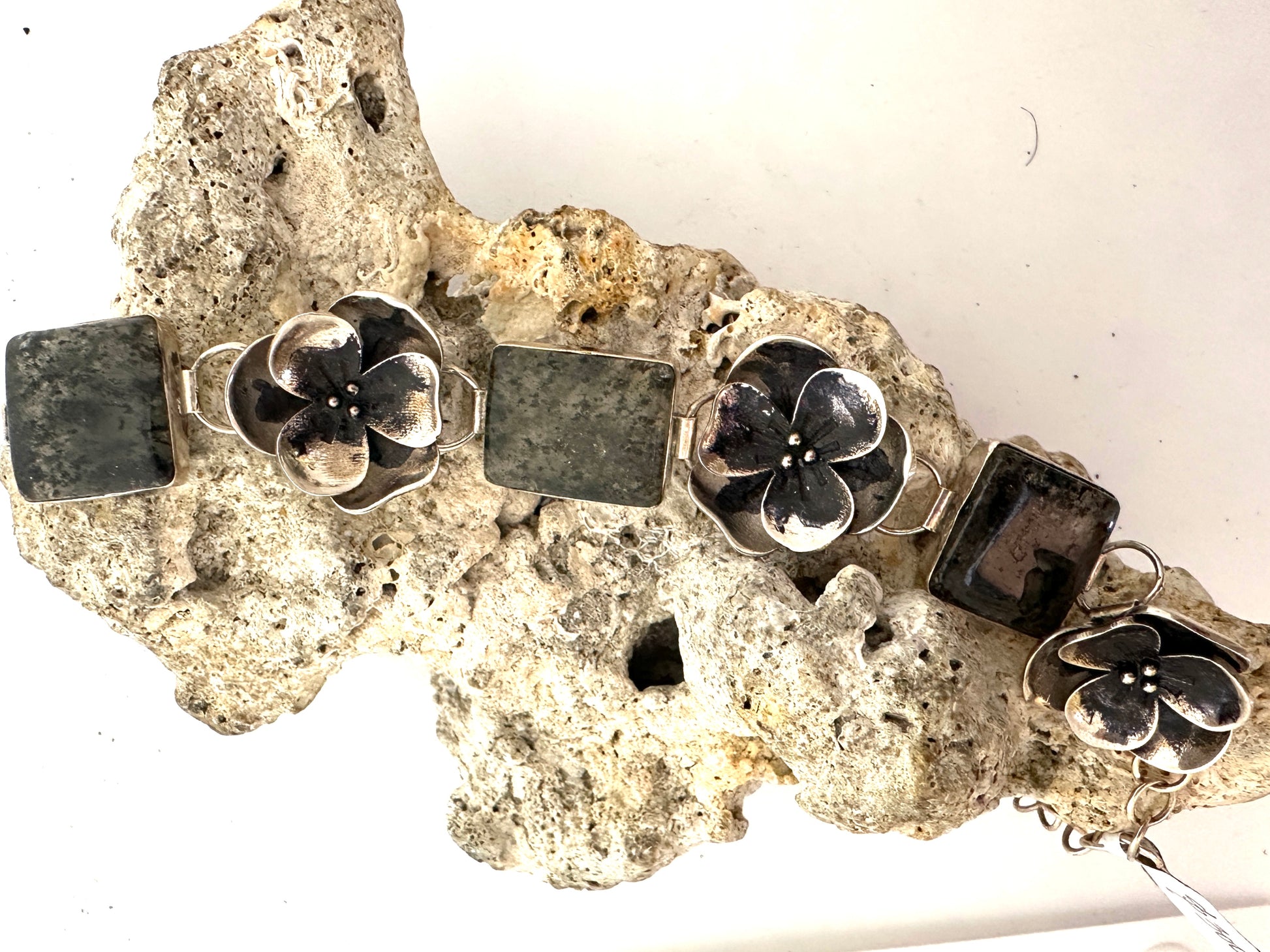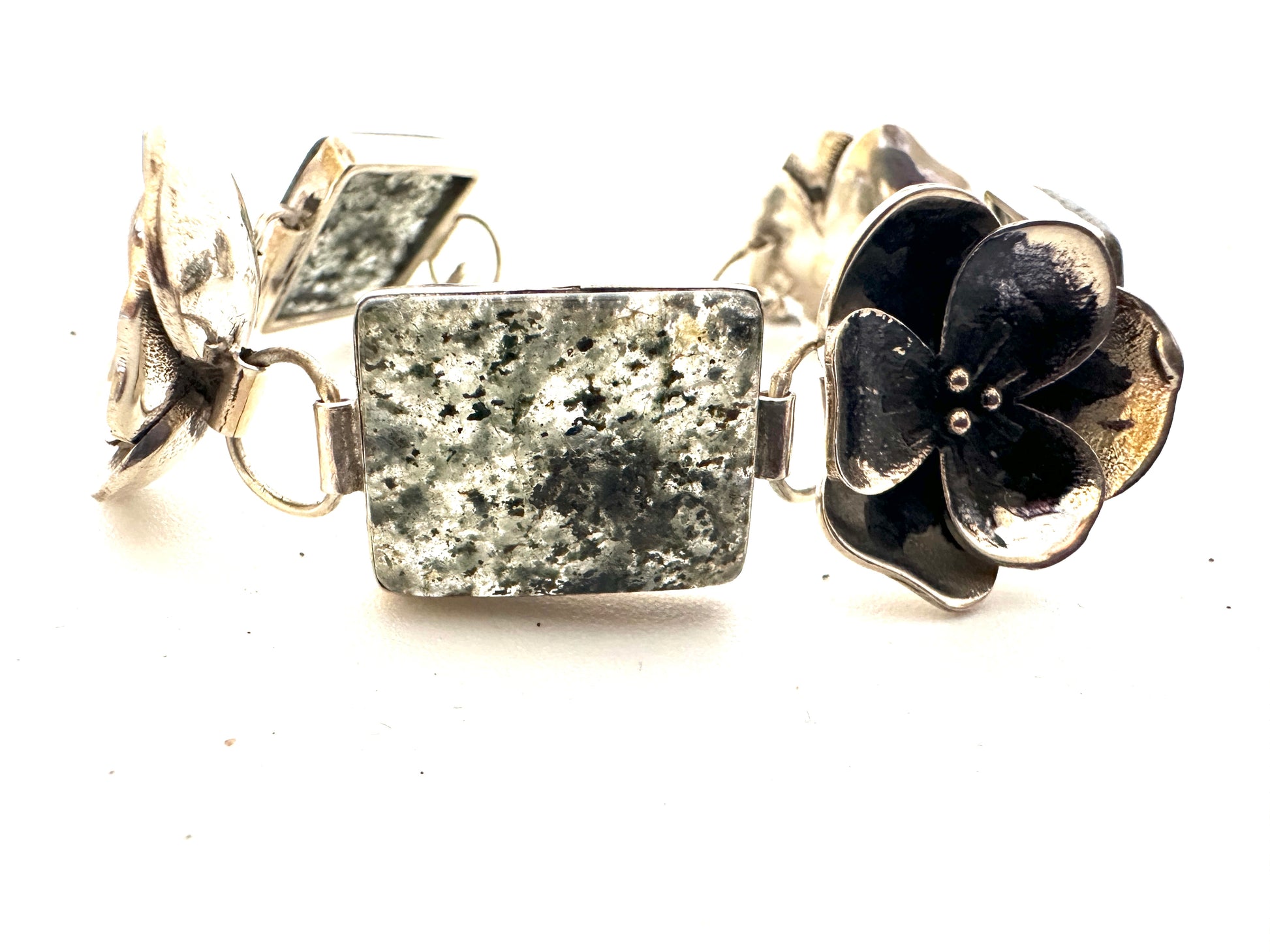 Expertly handcrafted and one-of-a-kind, the Moss Agate Pansy bracelet features square moss agate stones interspaced with handmade 925 sterling silver pansies. This unique piece combines the beauty of nature with the elegance of sterling silver for a truly striking accessory.
