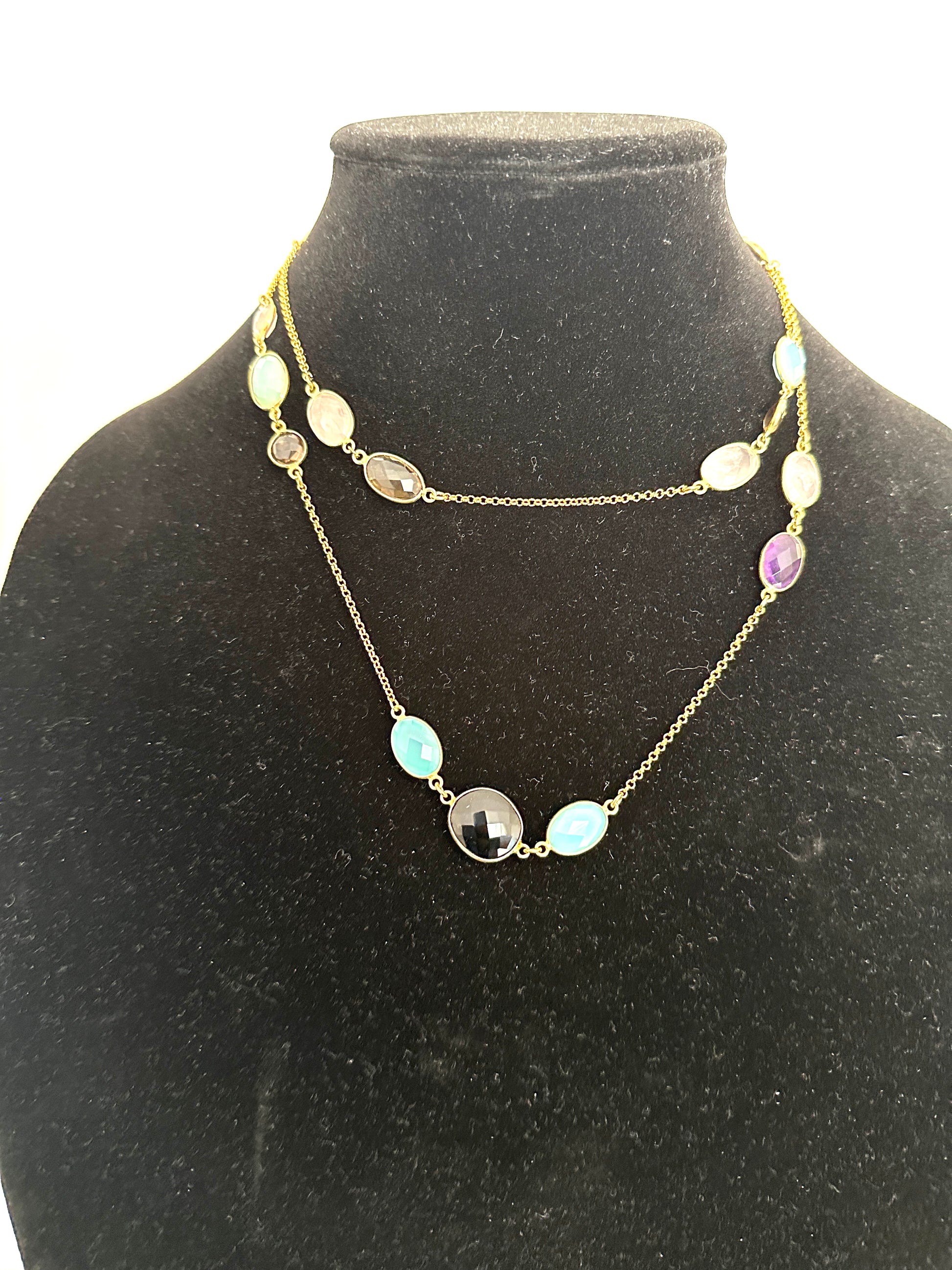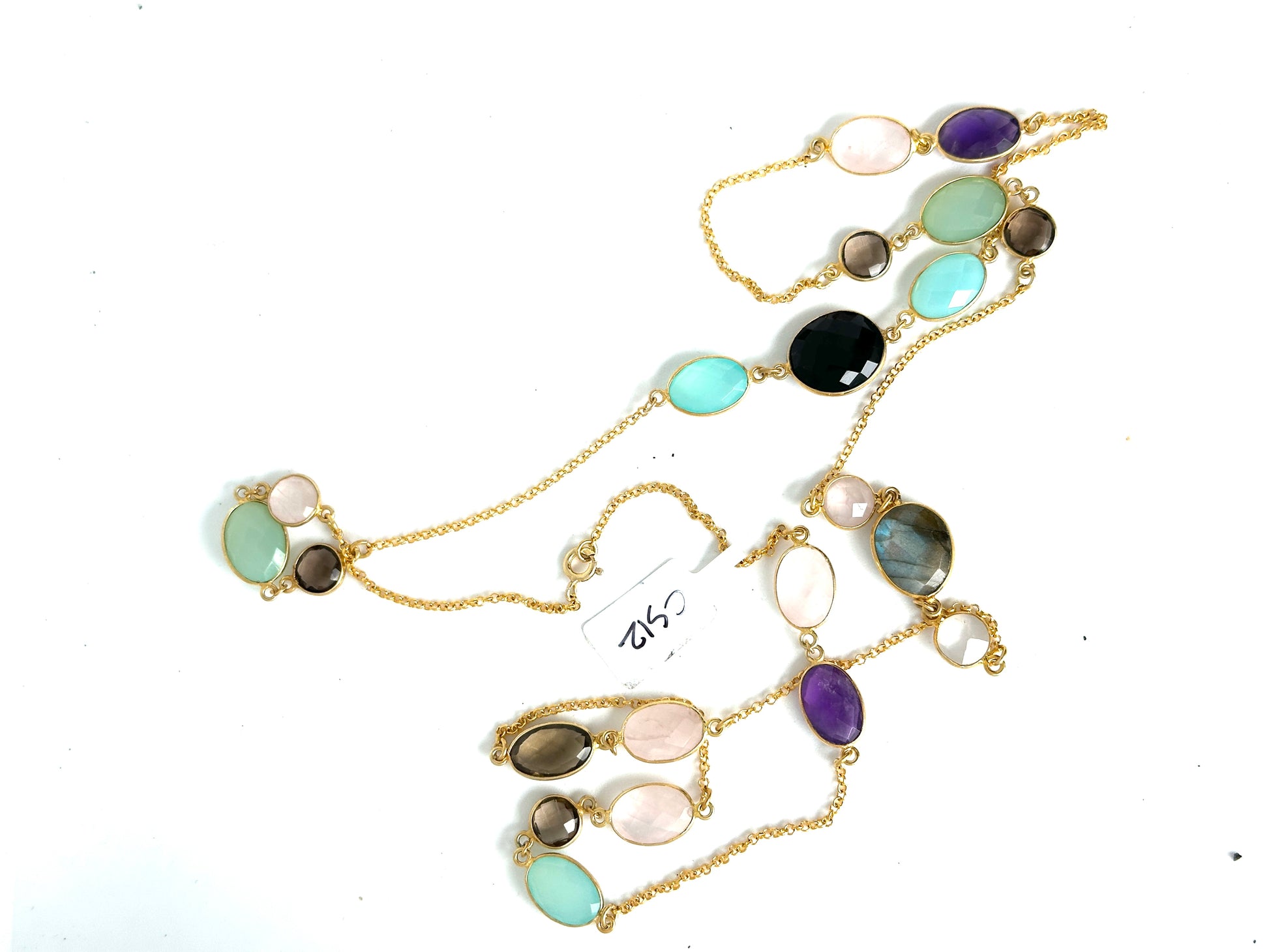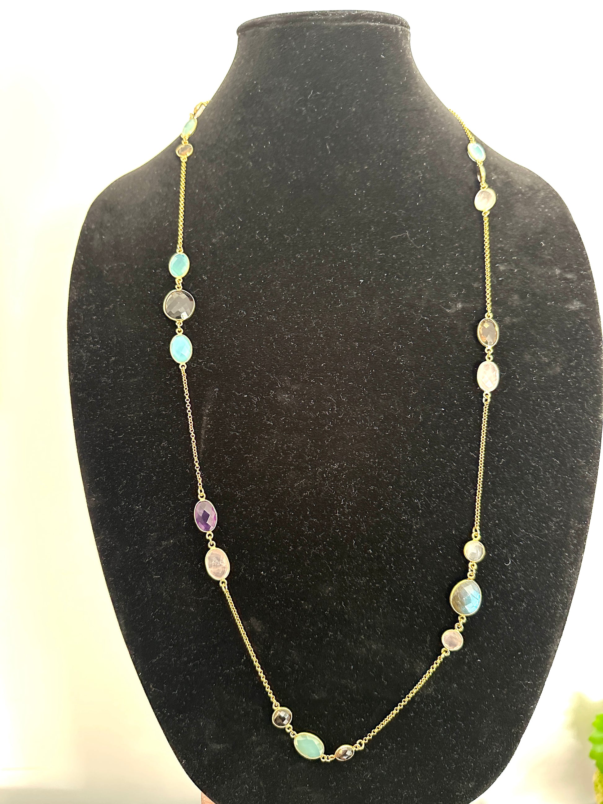 This elegant multistone necklace adds a pop of color with its beautiful interspaced stones of labradorite ,rose quartz,blue chancedony,amethyst and black onyx . The openable long silver chain with 18 carat gold polish can be worn in multiple ways for a versatile and layered look. Made with high-quality 925 silver, perfect for adding a touch of sophistication to any outfit