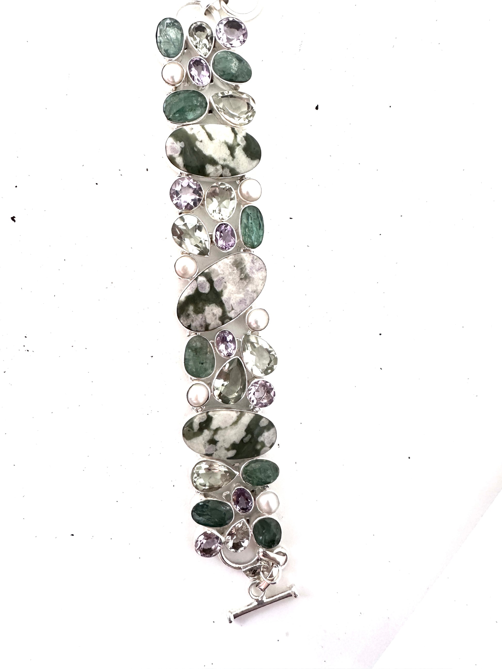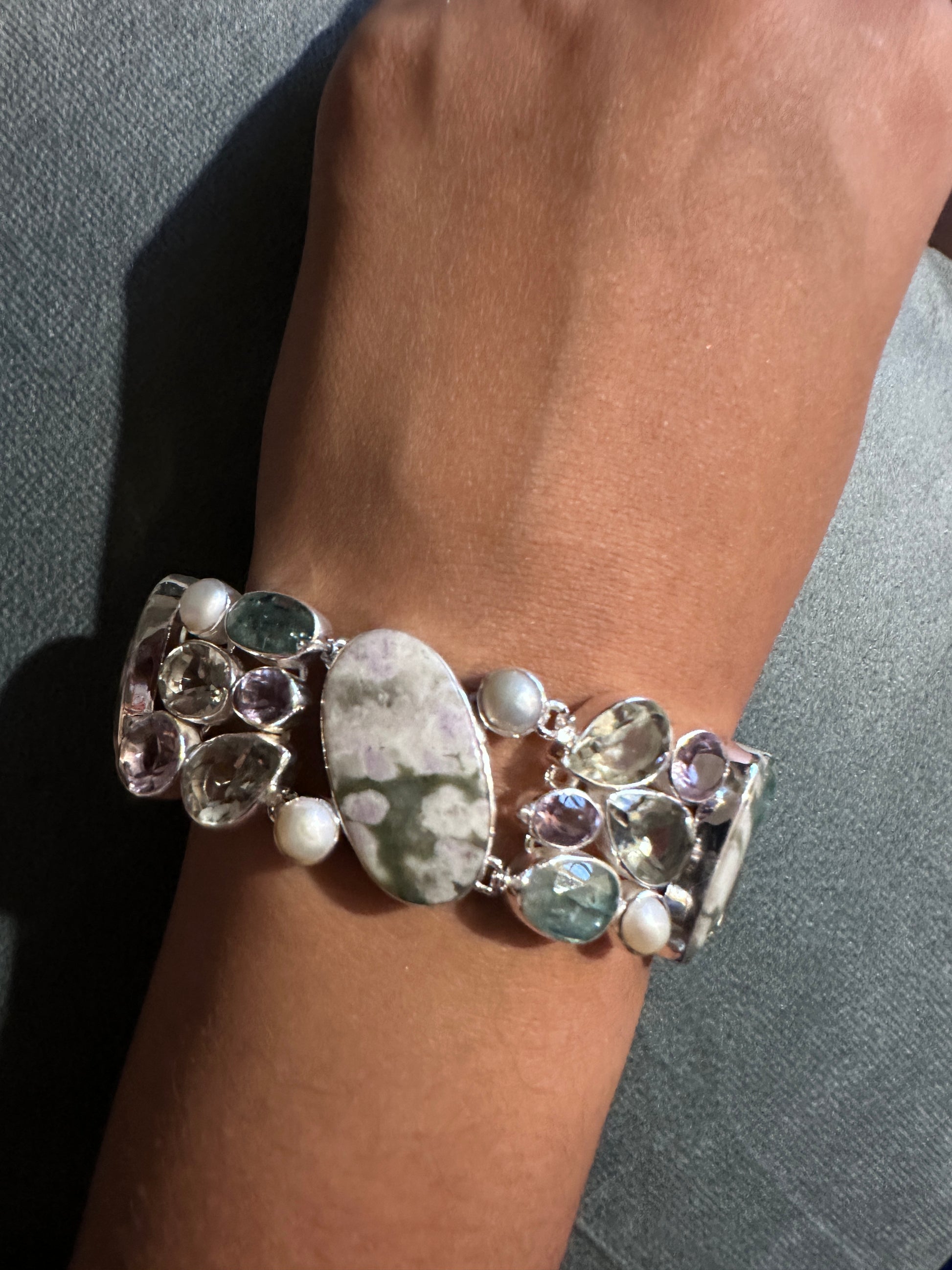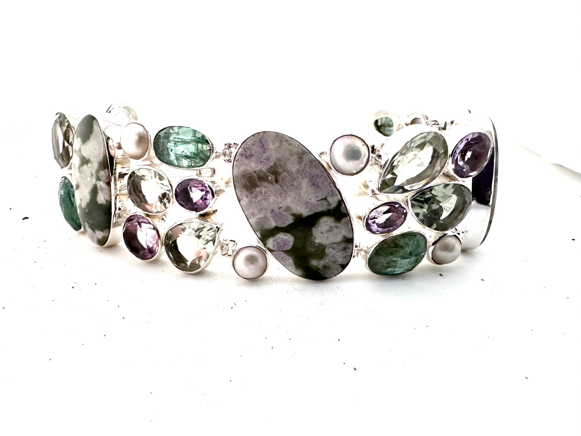 Featuring a stunning combination of Peace jade, amethyst, green amethyst, green kyanite, and freshwater pearls, this 925 silver statement bracelet showcases the delicate specks of purple within the Peace Jade brought out by the amethyst. Make a bold and unique statement with this one-of-a-kind piece.