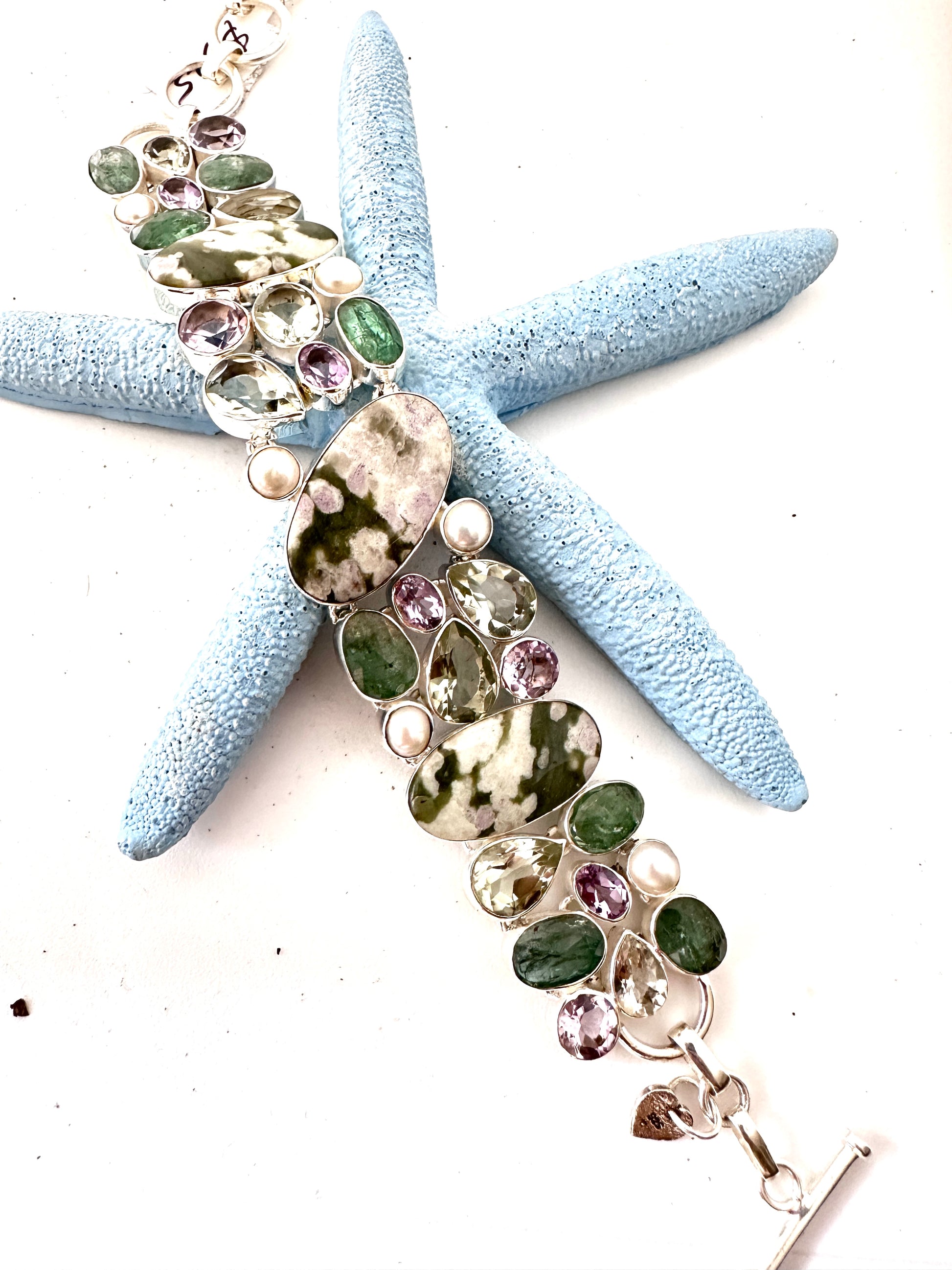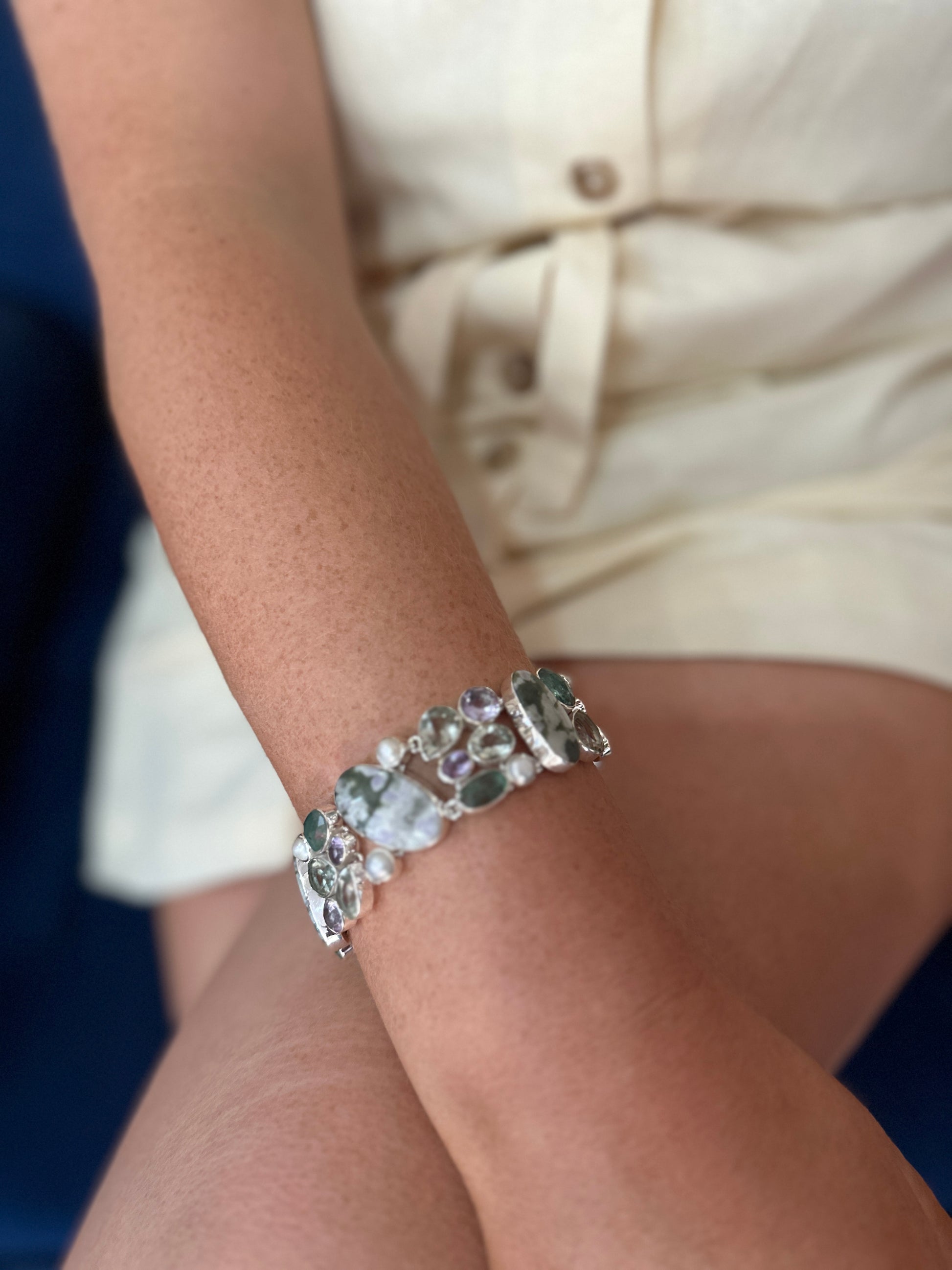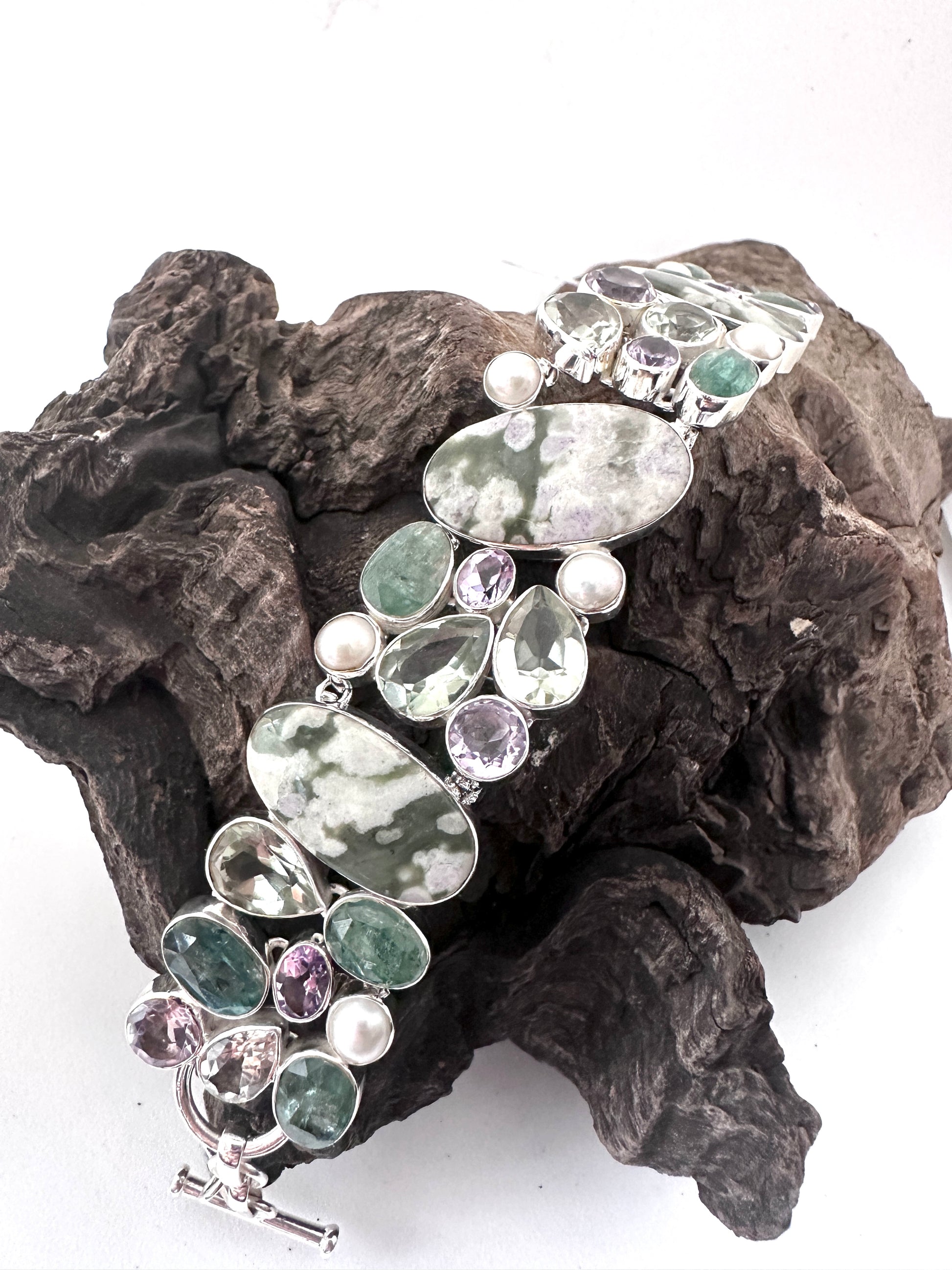 Featuring a stunning combination of Peace jade, amethyst, green amethyst, green kyanite, and freshwater pearls, this 925 silver statement bracelet showcases the delicate specks of purple within the Peace Jade brought out by the amethyst. Make a bold and unique statement with this one-of-a-kind piece.