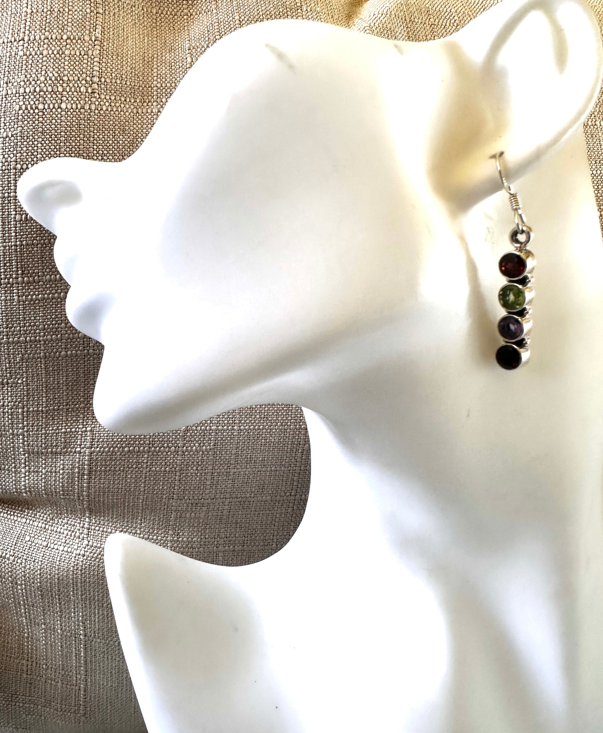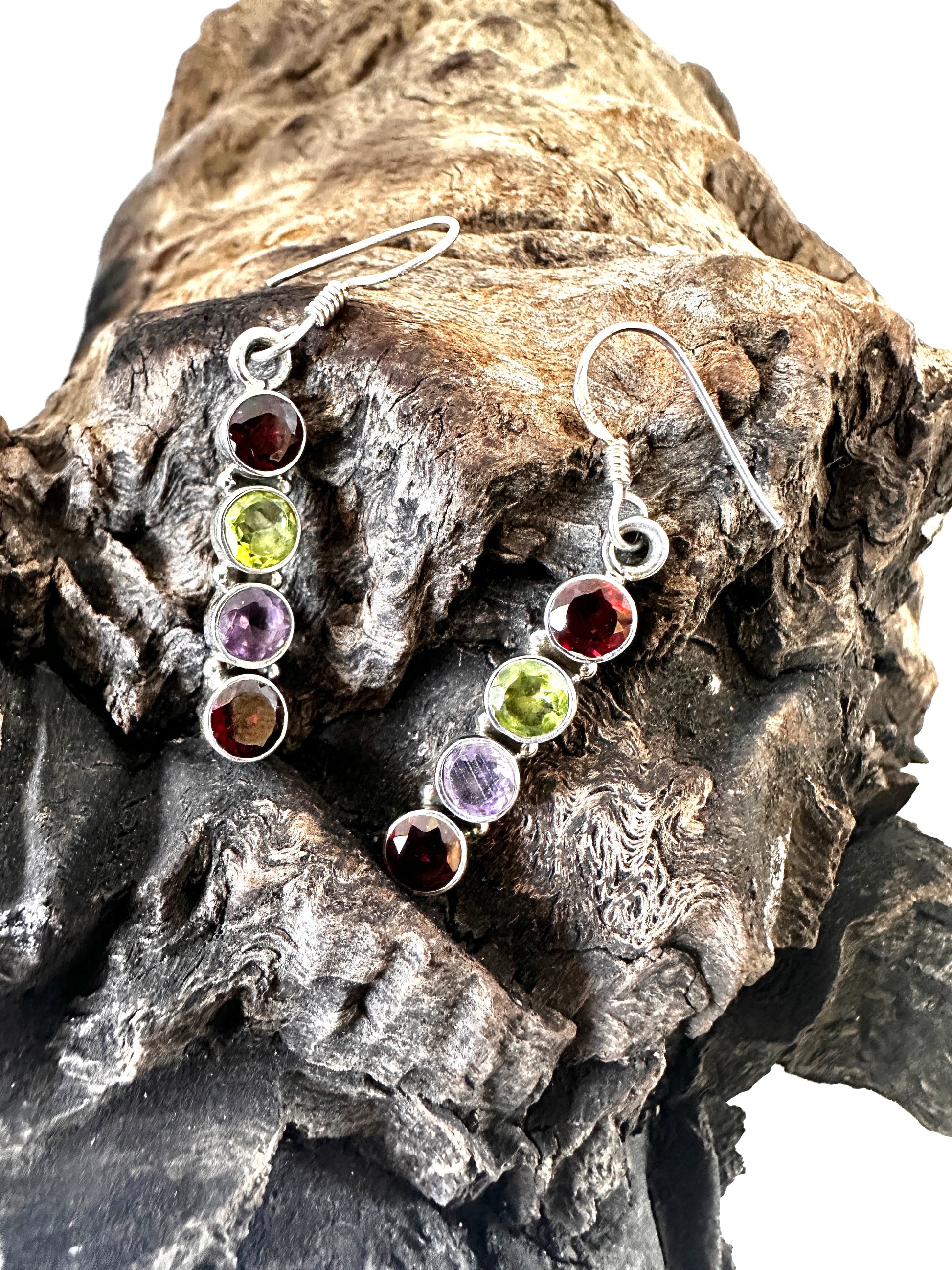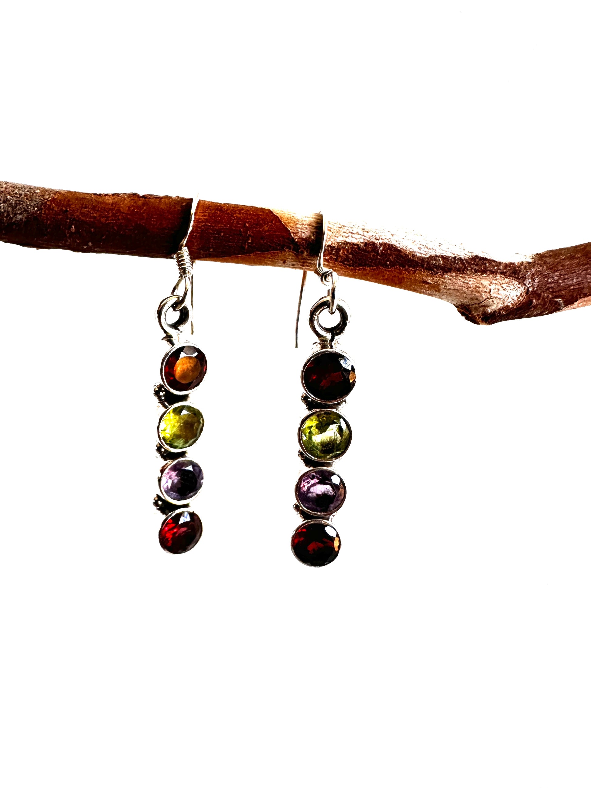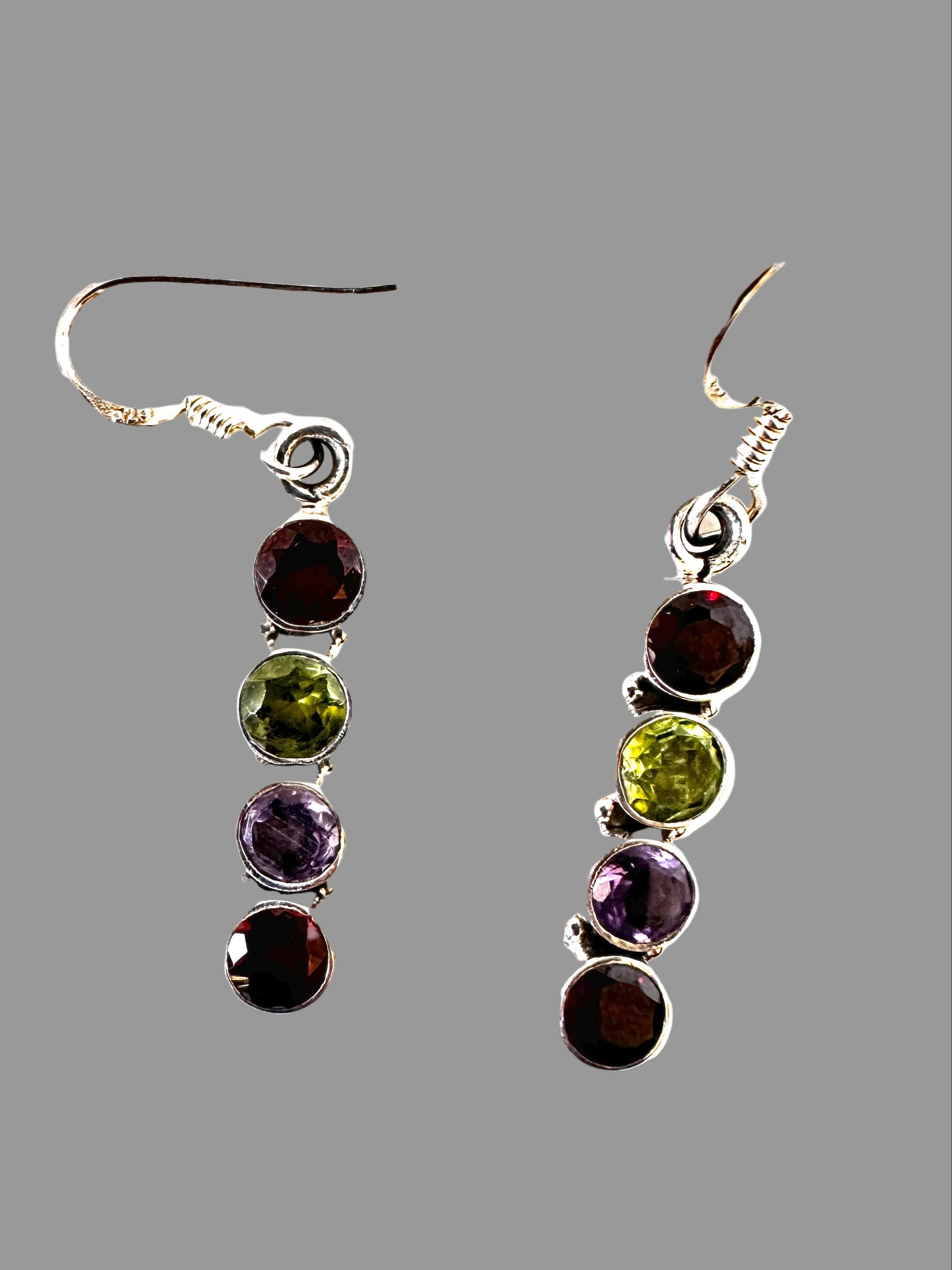 These exquisite long drop earrings showcase a harmonious blend of garnet, peridot, and amethyst stones set in sterling silver. Expertly crafted, each multistone piece captures the vibrant colors of the gemstones to create an elegant accessory that enhances any ensemble. The refined design highlights the natural beauty of each gem, while the sterling silver setting ensures lasting durability and a sophisticated finish. Perfect for those seeking a statement piece with a timeless appeal.