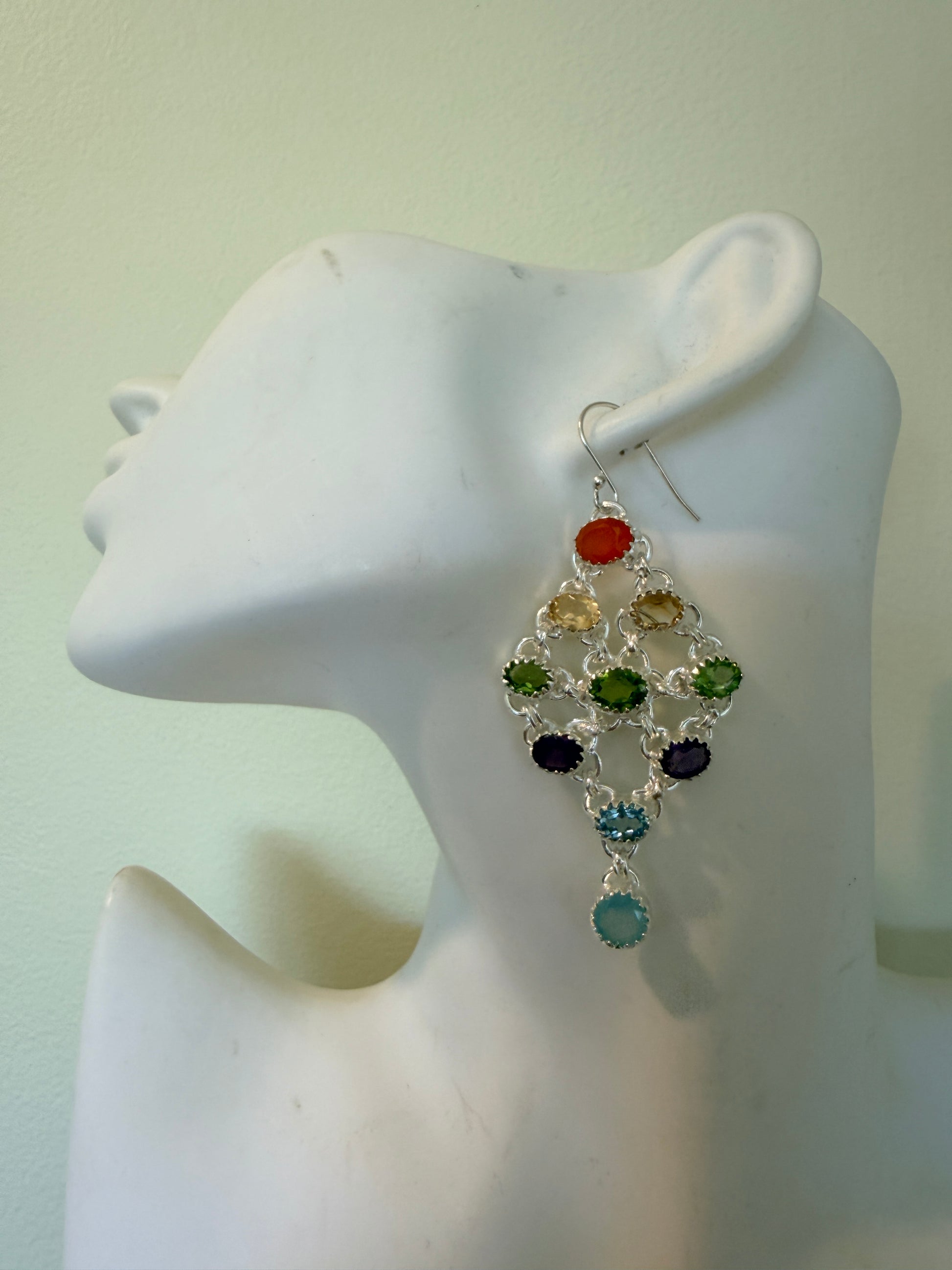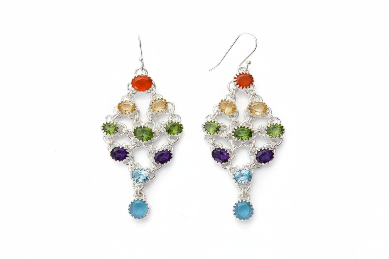 Illuminate your space with this stunning rainbow chandelier, a harmonious blend of natural gemstones and timeless elegance. Featuring vibrant carnelian, sunny citrine, fresh peridot, serene amethyst, cool blue topaz, and soothing chalcedony, each stone is carefully set in lustrous sterling silver. This piece celebrates the full spectrum of colour, bringing warmth, positive energy, and sophisticated style to any room. Perfect for those who appreciate both the beauty of gemstones and the artistry of fine jewellery design.