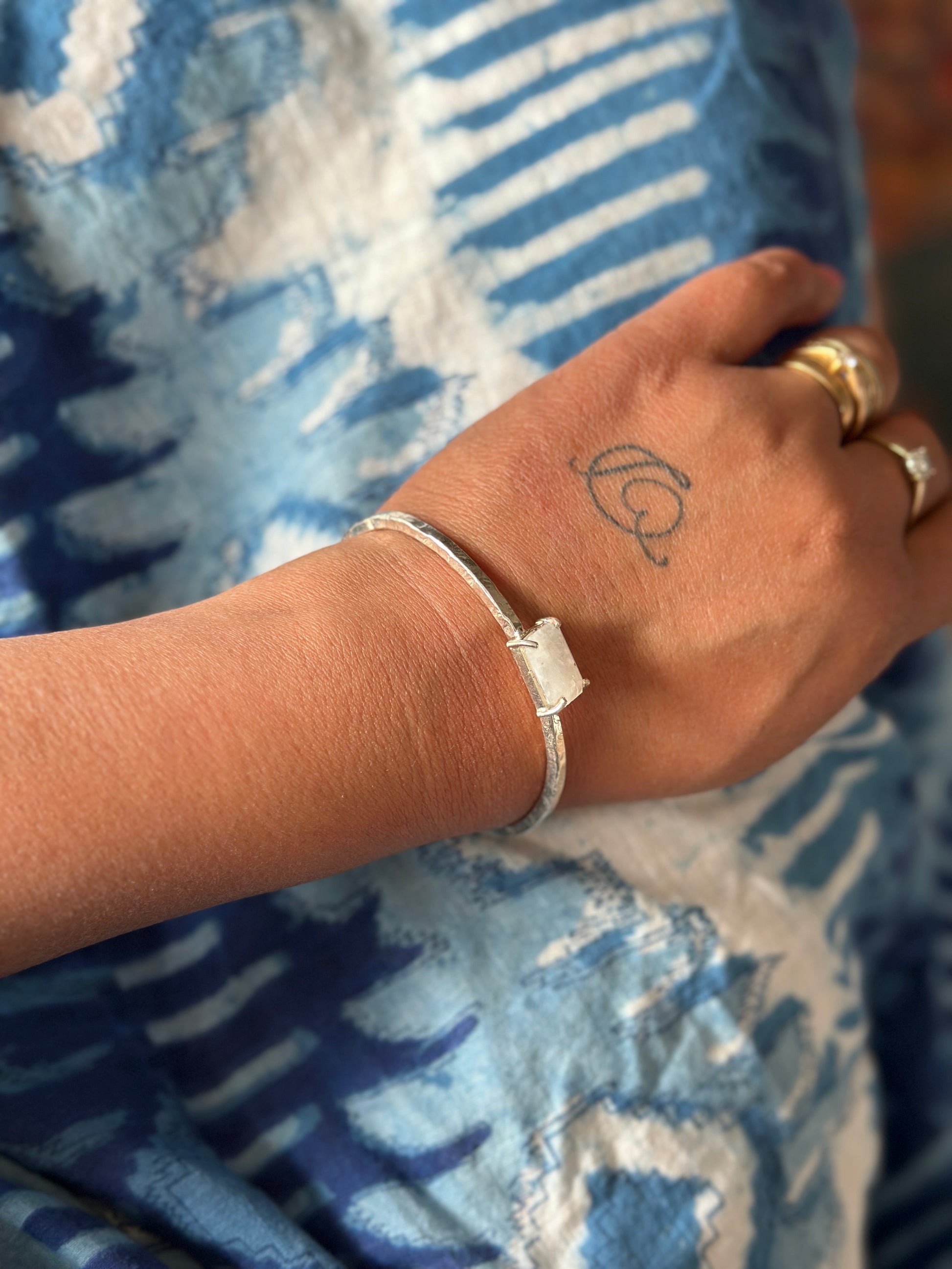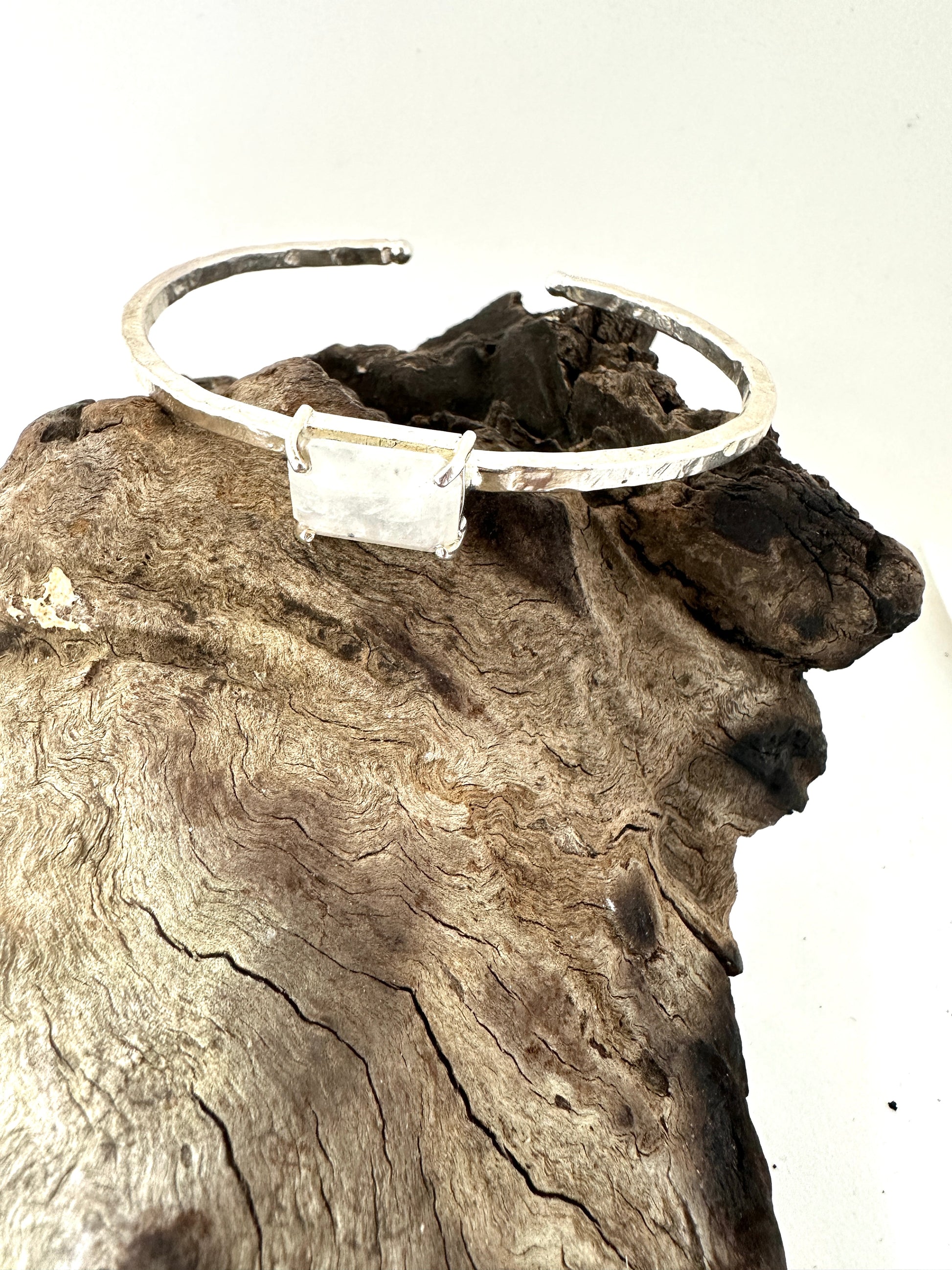 This 925 silver adjustable cuff is the perfect accessory for a minimalistic look. Featuring a single polished faceted Rainbow moonstone, this piece adds a touch of elegance to any outfit. The adjustable design ensures a comfortable fit for all. Upgrade your style with the timeless beauty of Rainbow Moonstone.