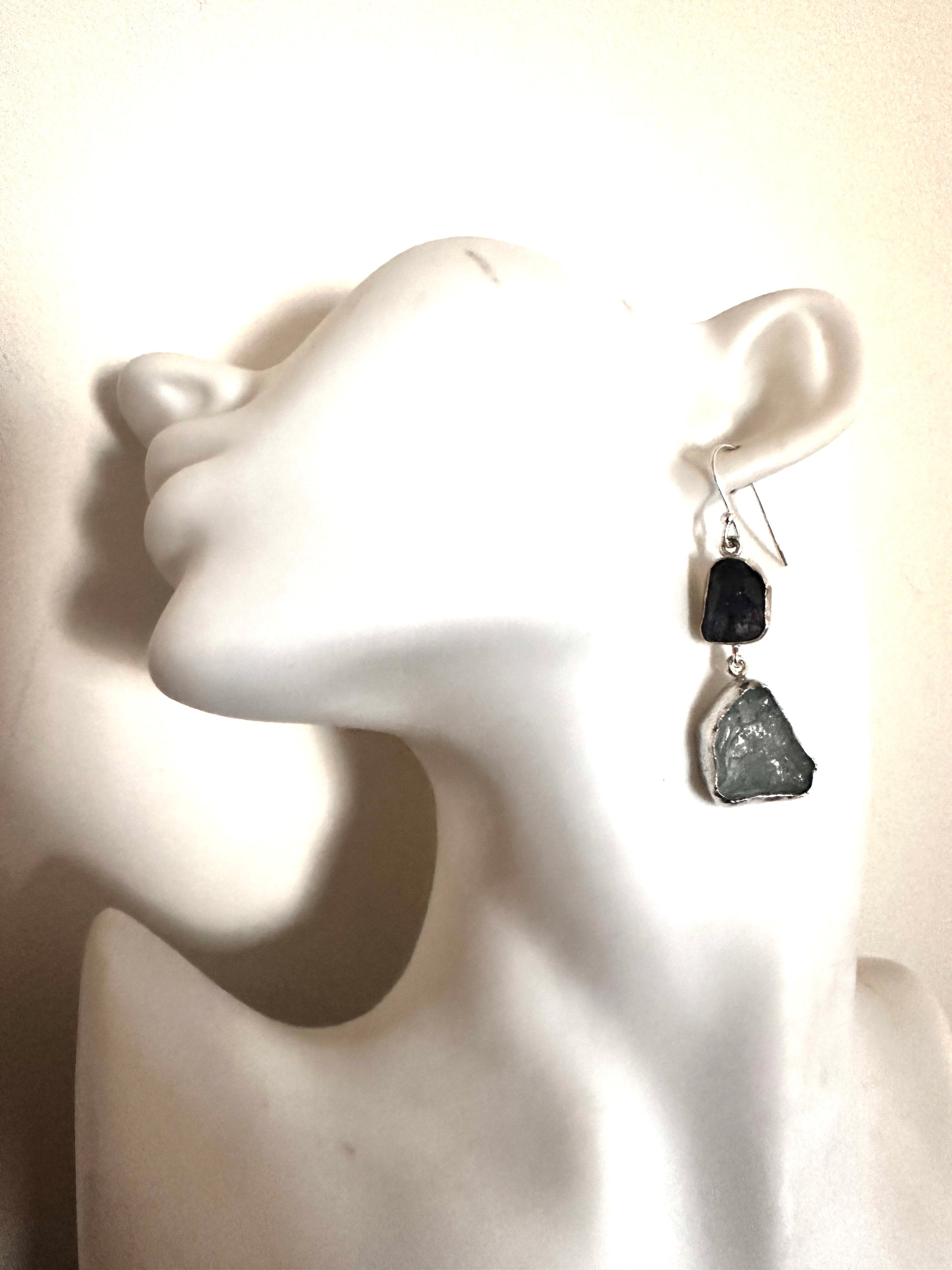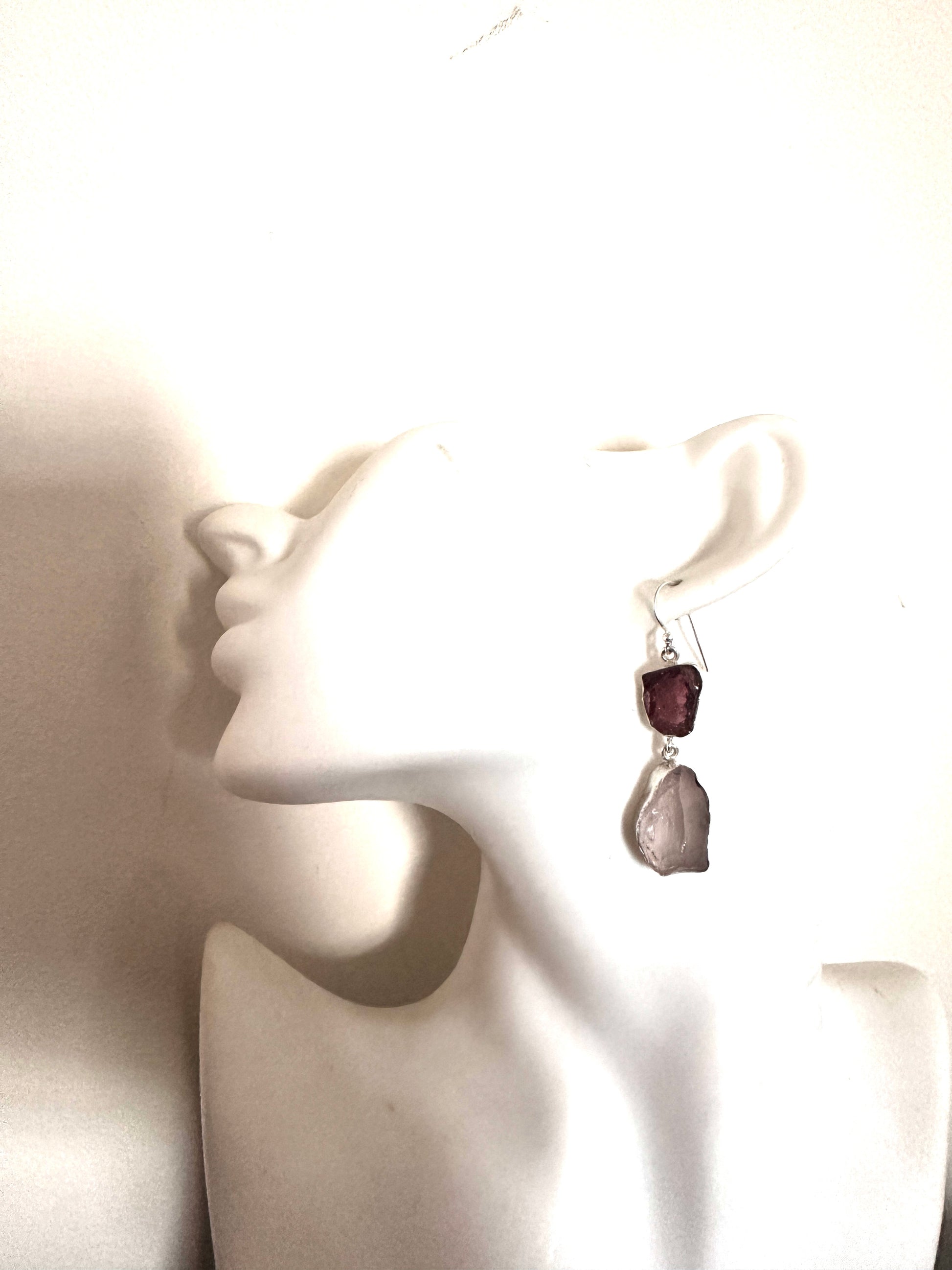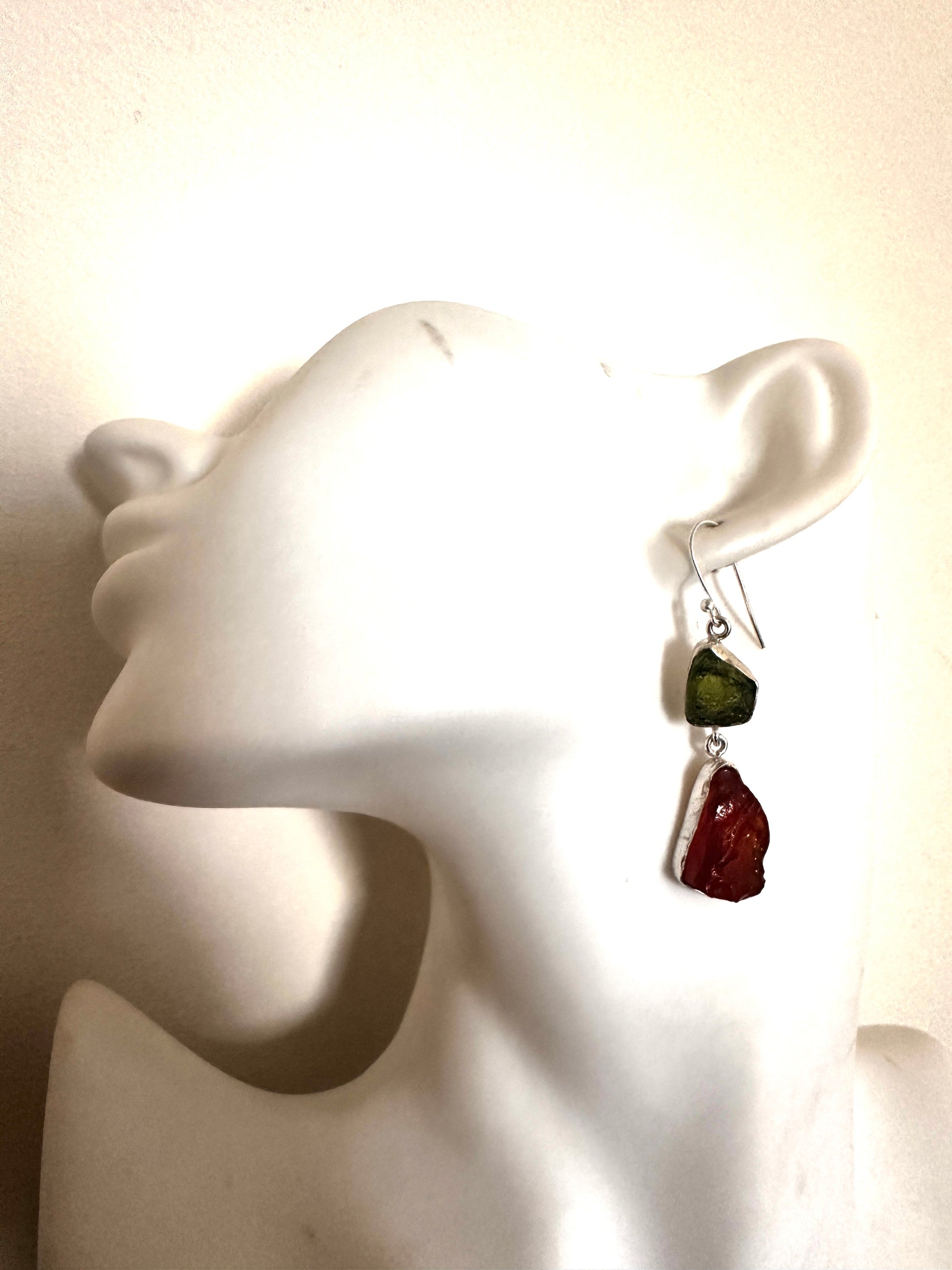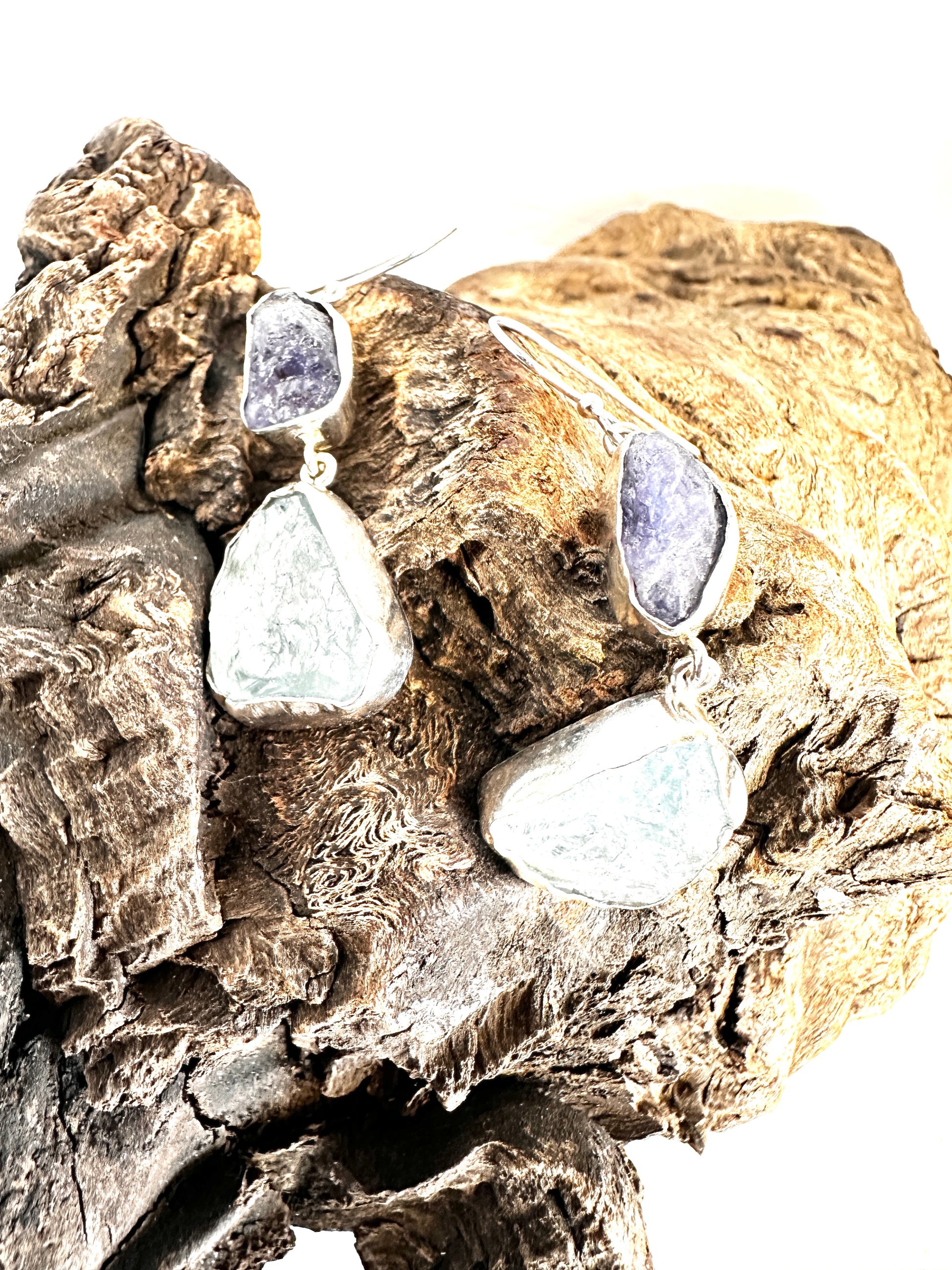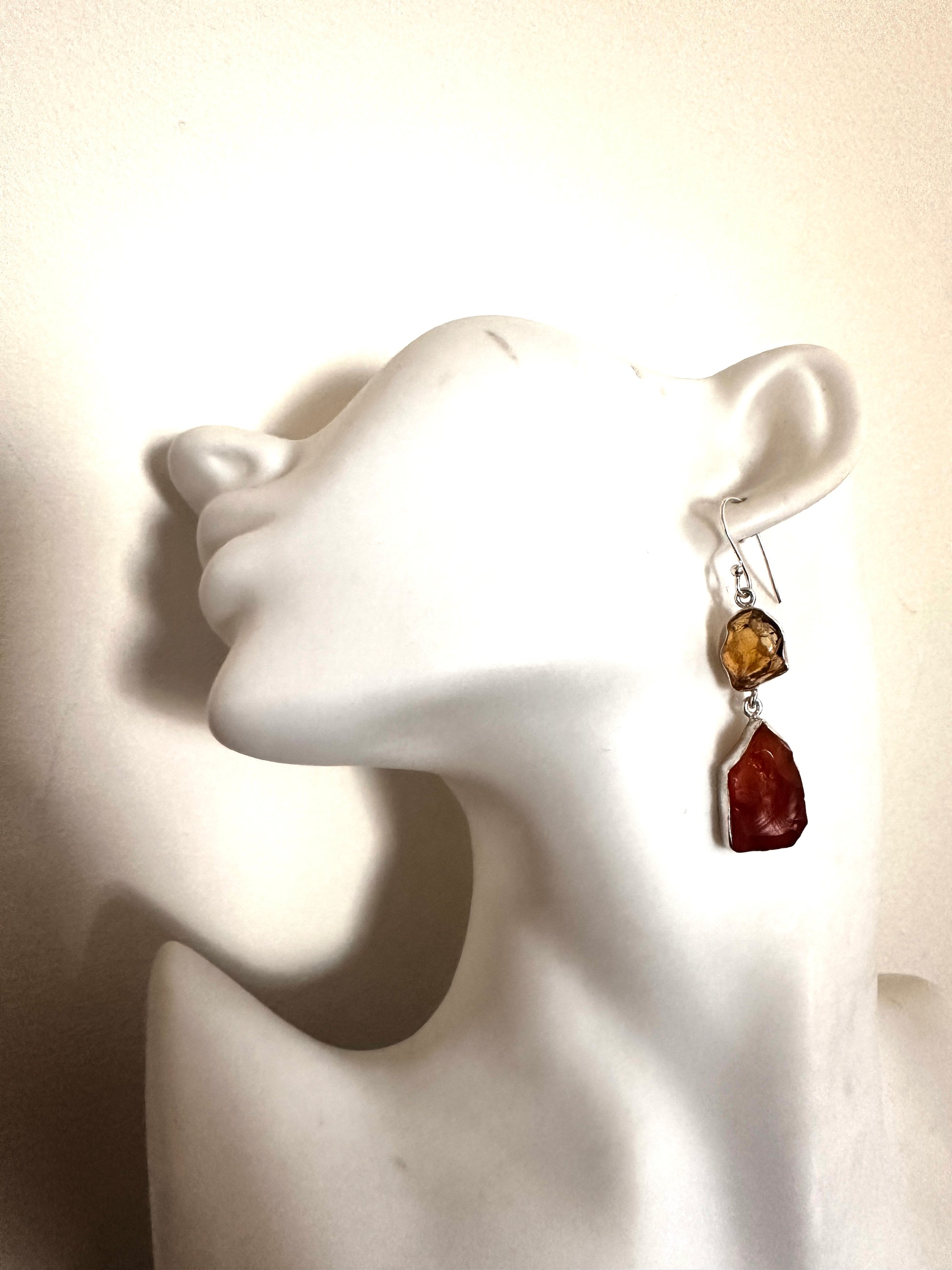 Raw Candy earrings showcase striking raw natural stones set in sterling silver, designed as elegant double drops. The naturally contrasting textures and hues highlight the organic beauty of each stone, while the sterling silver setting provides a refined, durable framework. These earrings offer a sophisticated yet earthy aesthetic, perfect for those who appreciate unique, expert-crafted jewelry that emphasizes natural individuality.