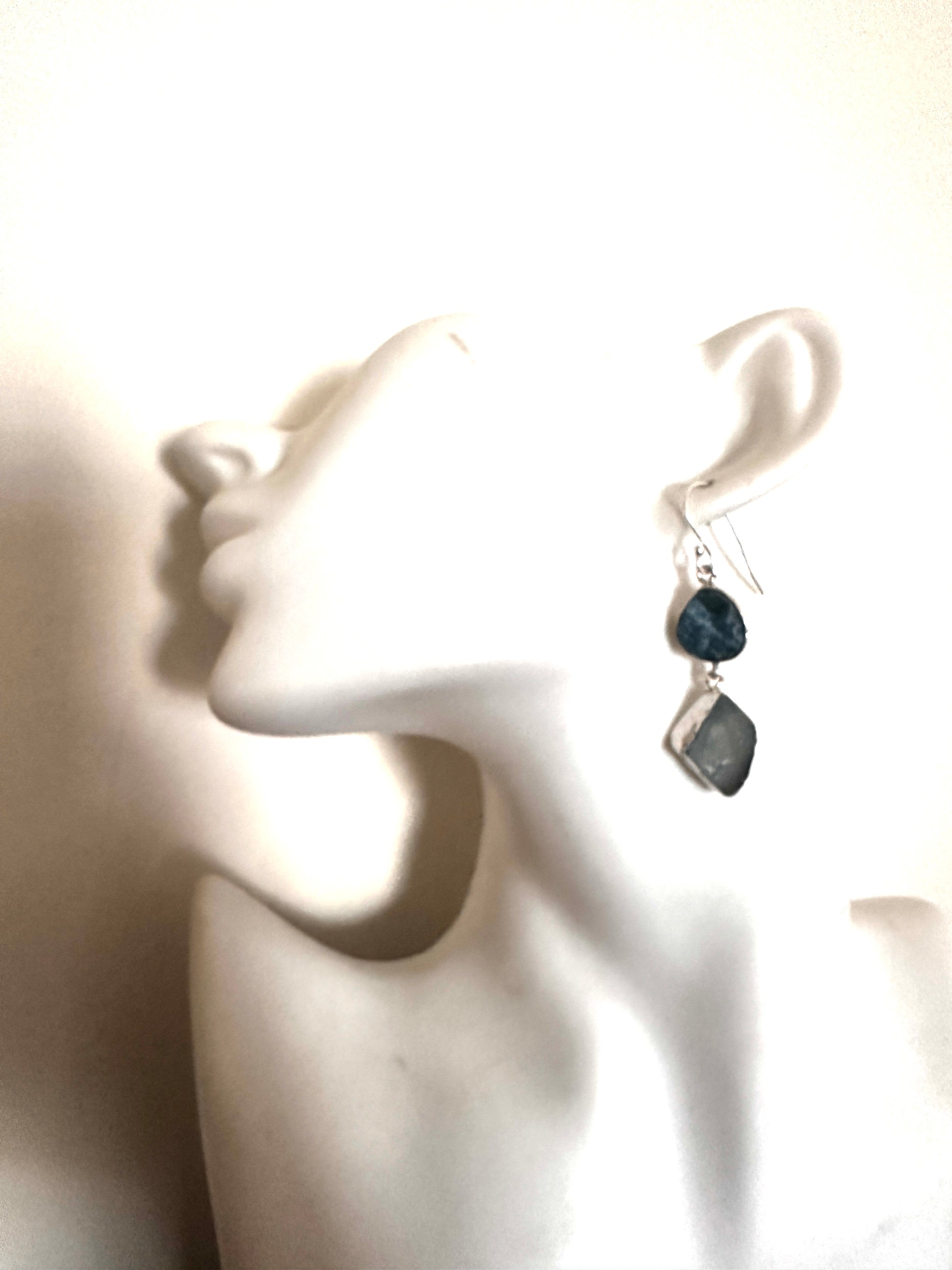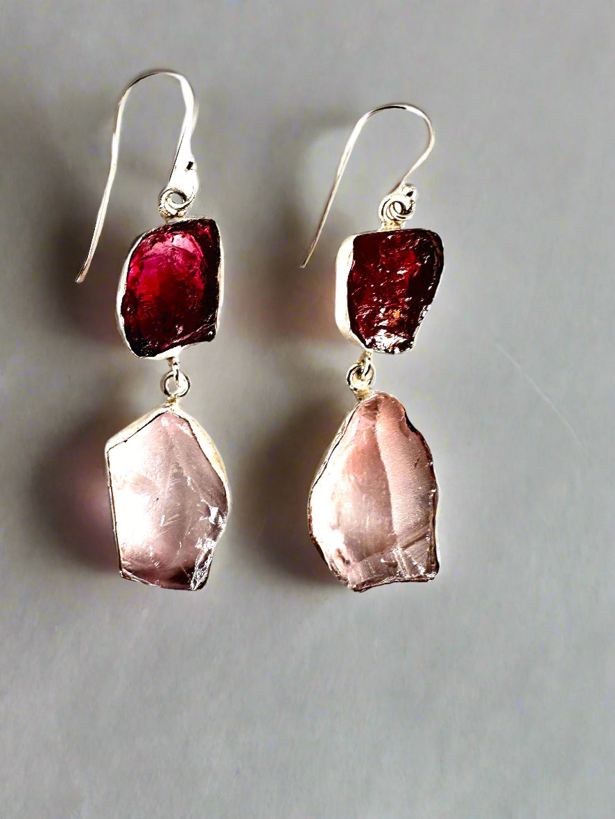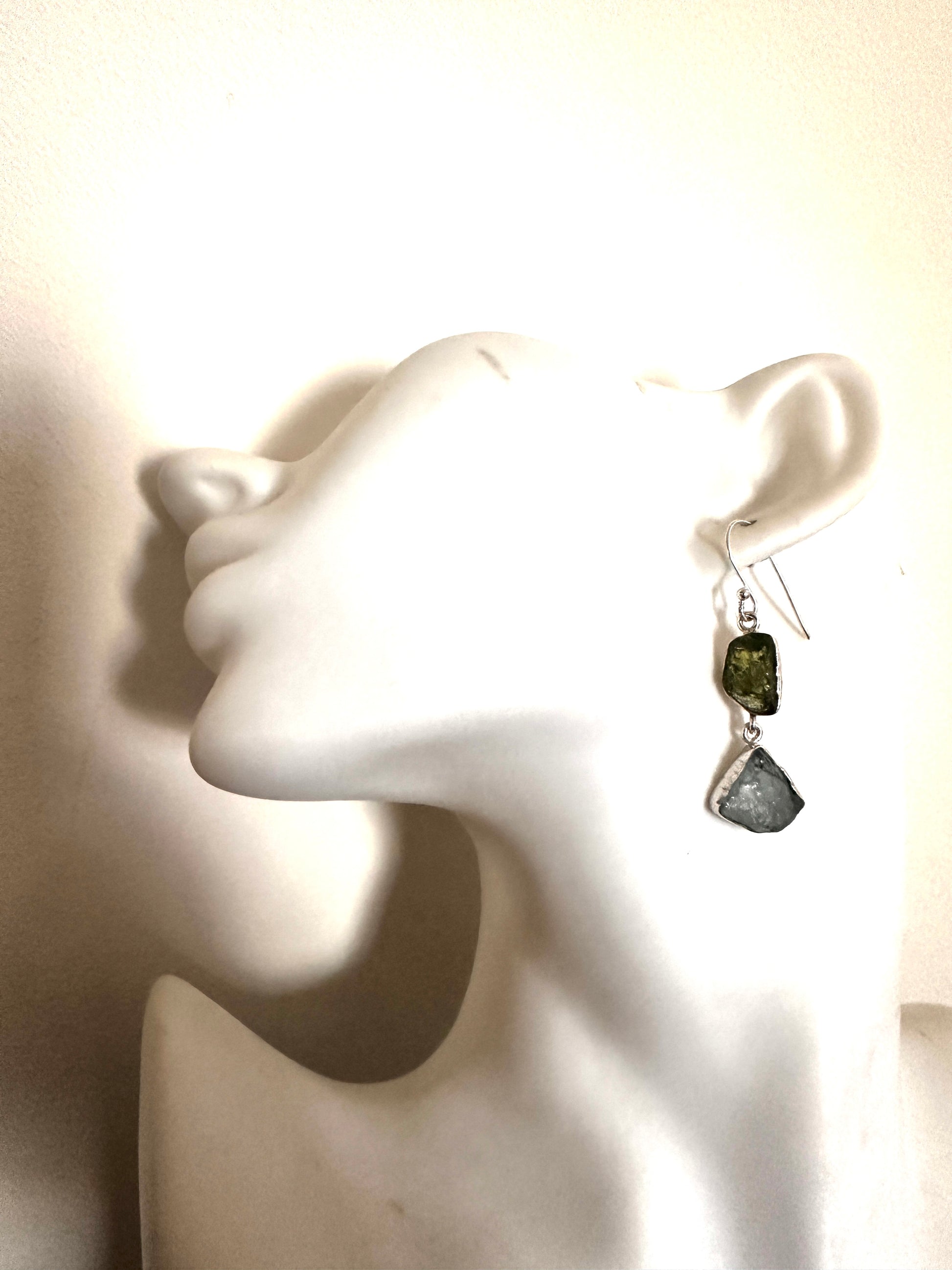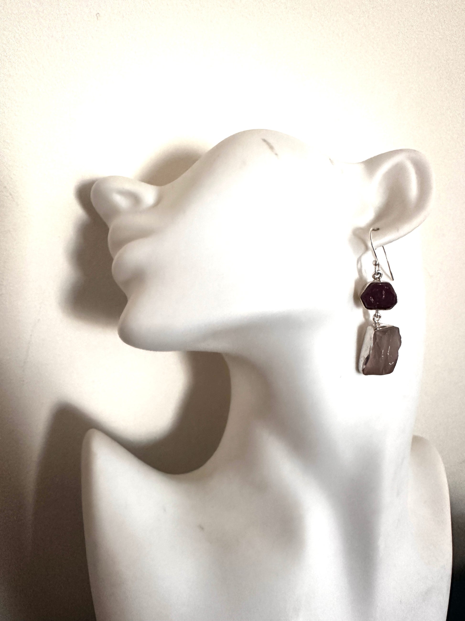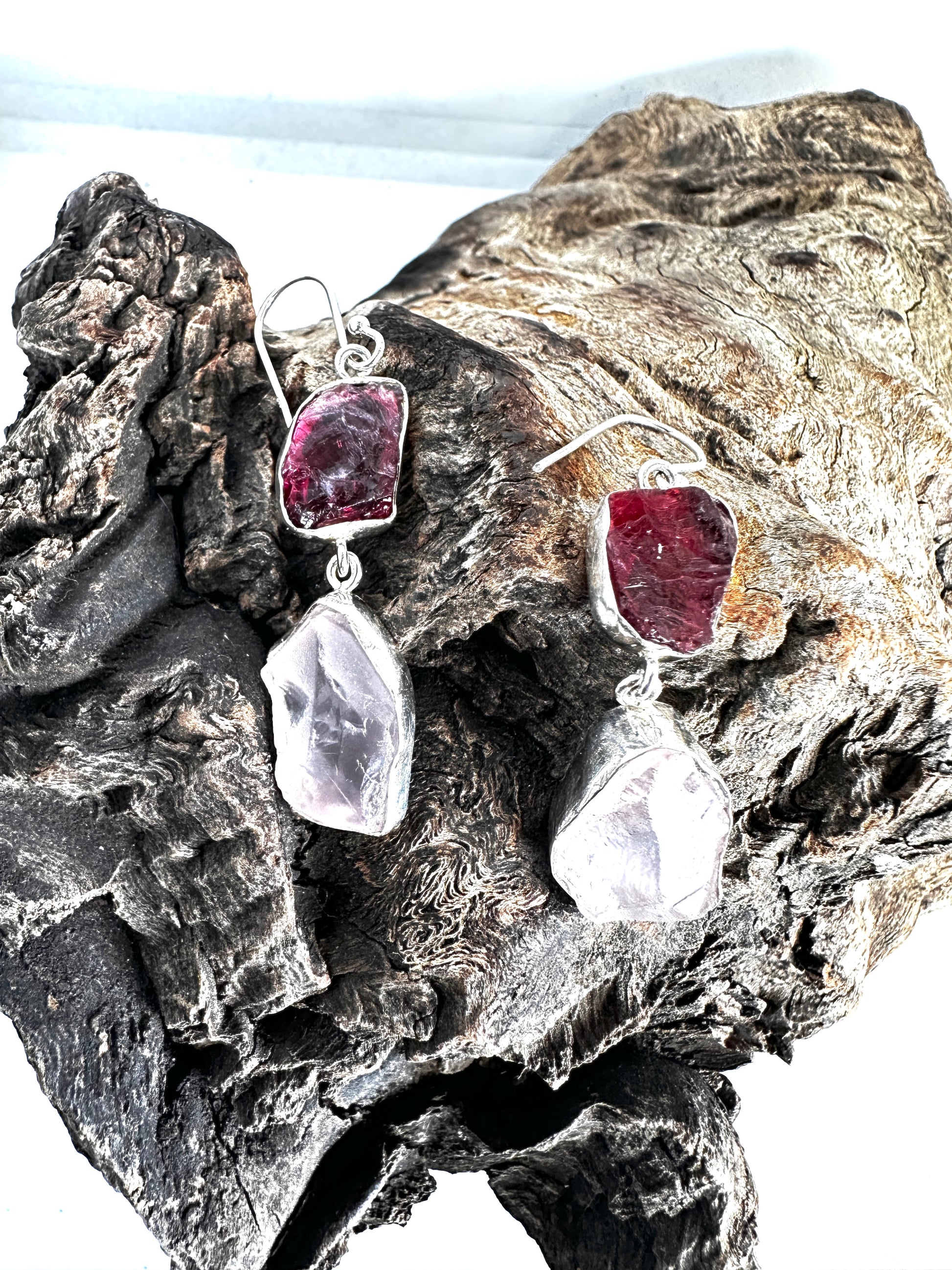 Raw Candy earrings showcase striking raw natural stones set in sterling silver, designed as elegant double drops. The naturally contrasting textures and hues highlight the organic beauty of each stone, while the sterling silver setting provides a refined, durable framework. These earrings offer a sophisticated yet earthy aesthetic, perfect for those who appreciate unique, expert-crafted jewelry that emphasizes natural individuality.