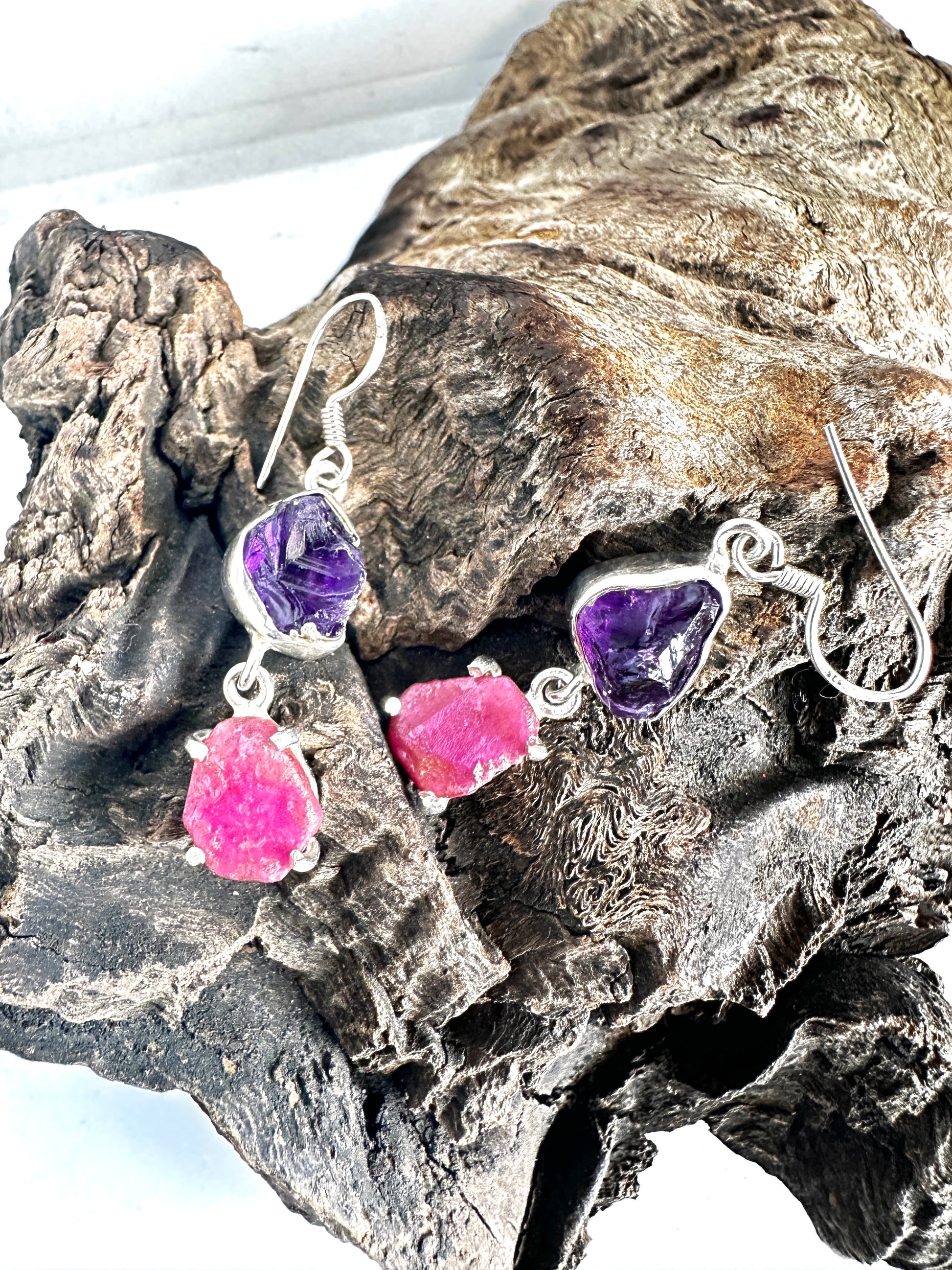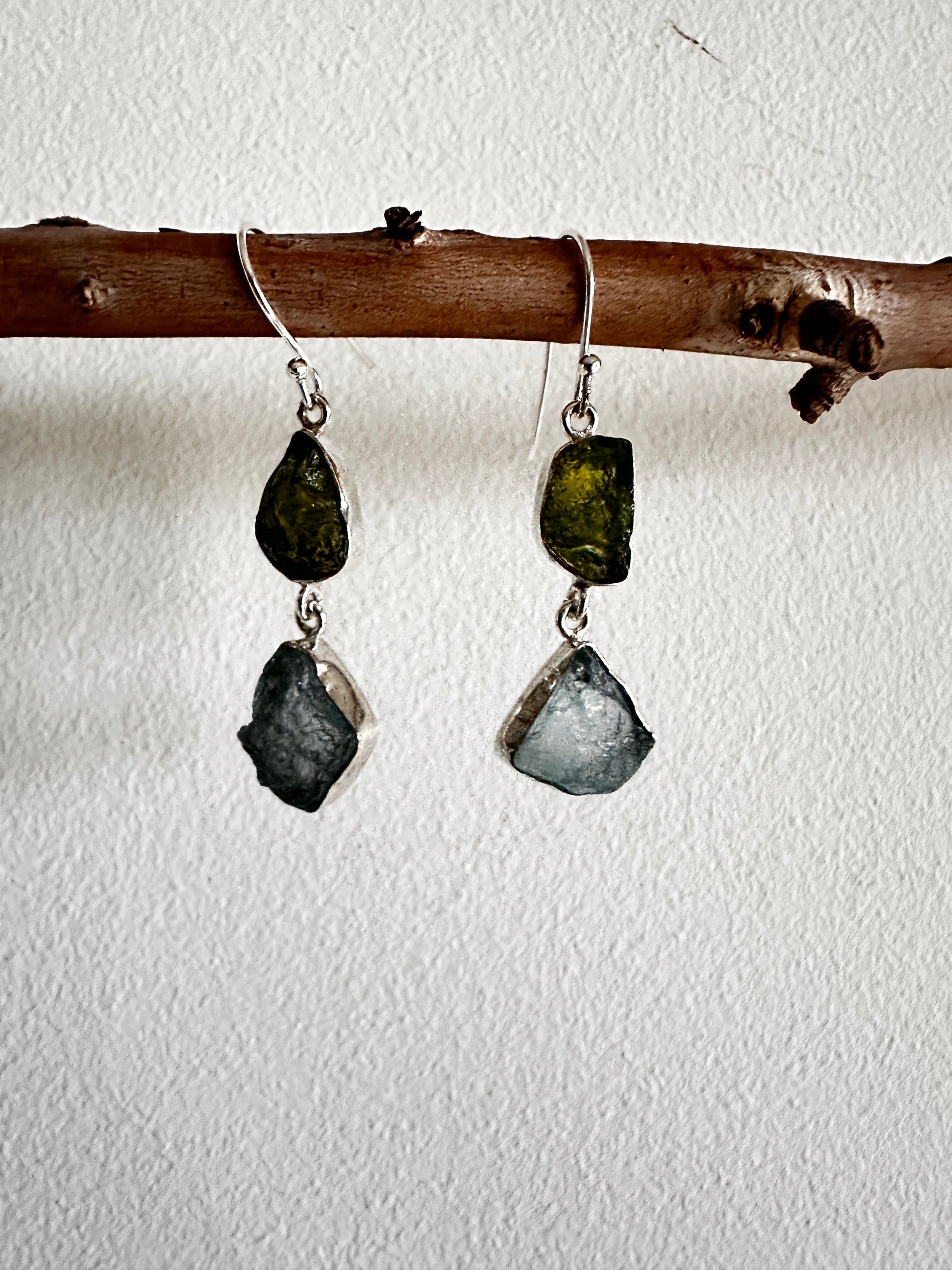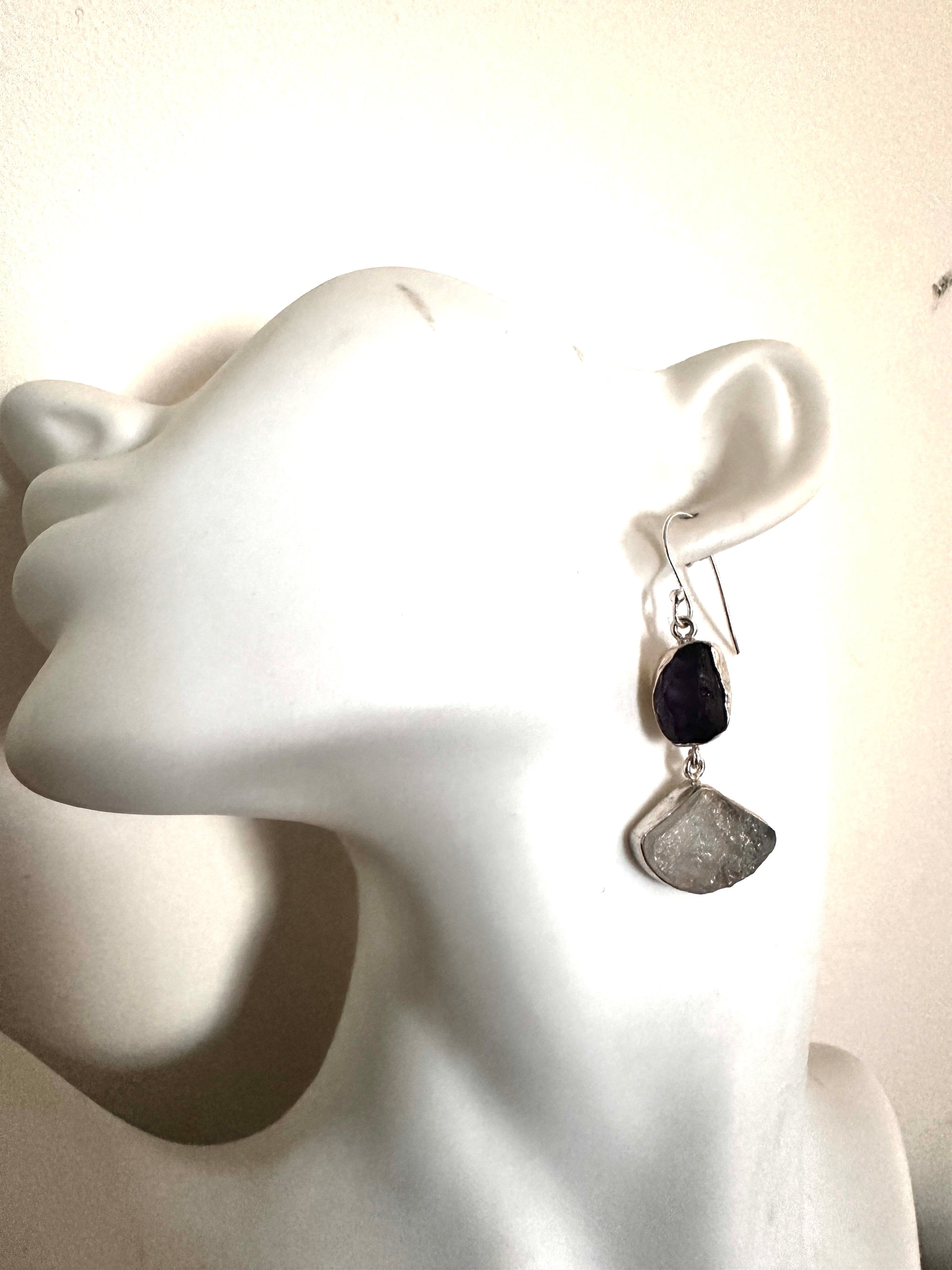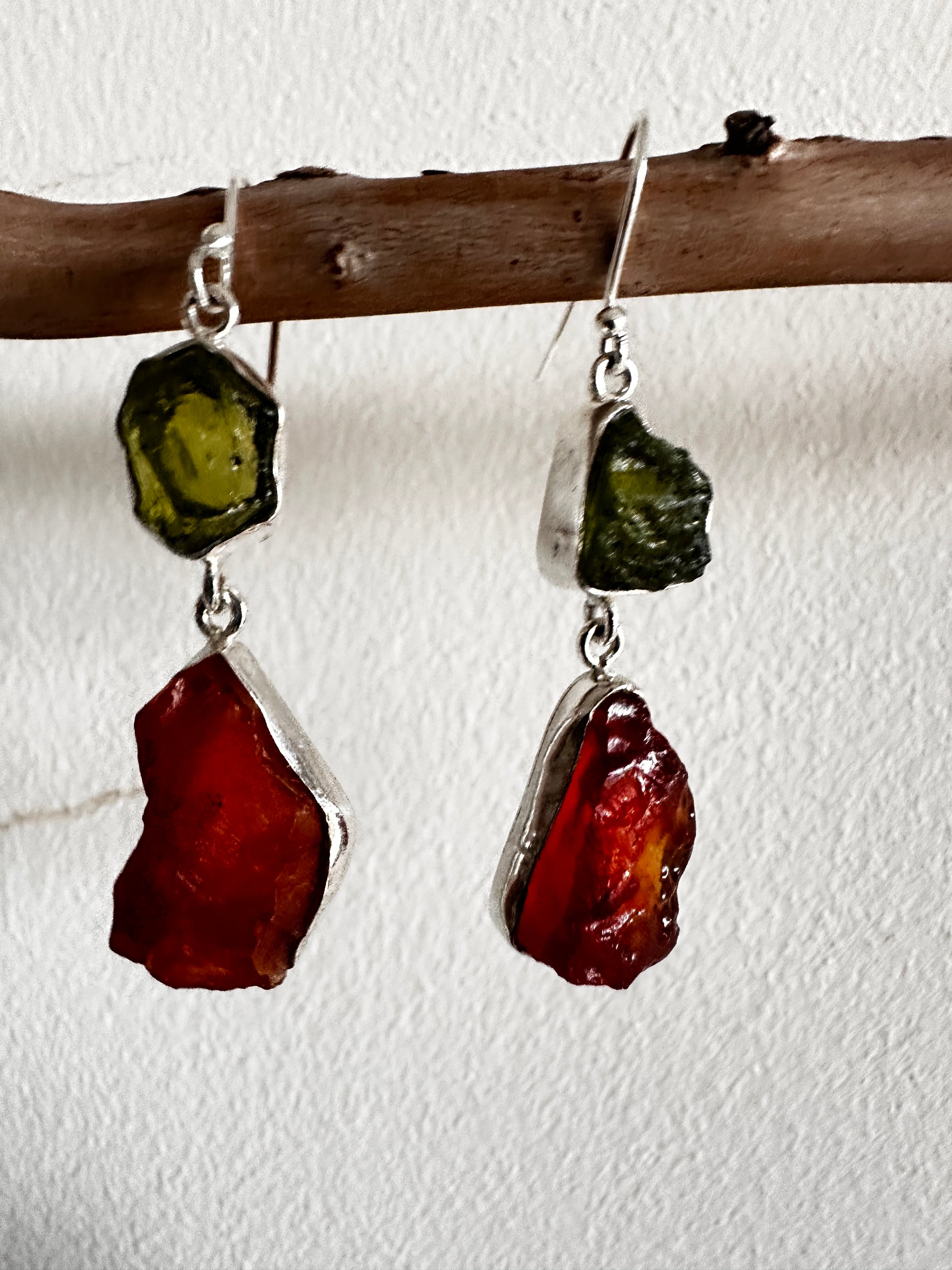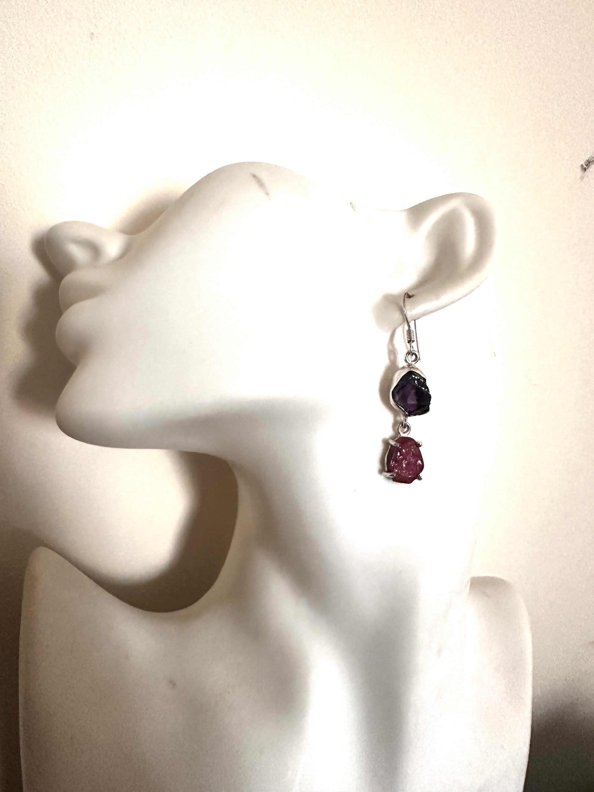 Raw Candy earrings showcase striking raw natural stones set in sterling silver, designed as elegant double drops. The naturally contrasting textures and hues highlight the organic beauty of each stone, while the sterling silver setting provides a refined, durable framework. These earrings offer a sophisticated yet earthy aesthetic, perfect for those who appreciate unique, expert-crafted jewelry that emphasizes natural individuality.