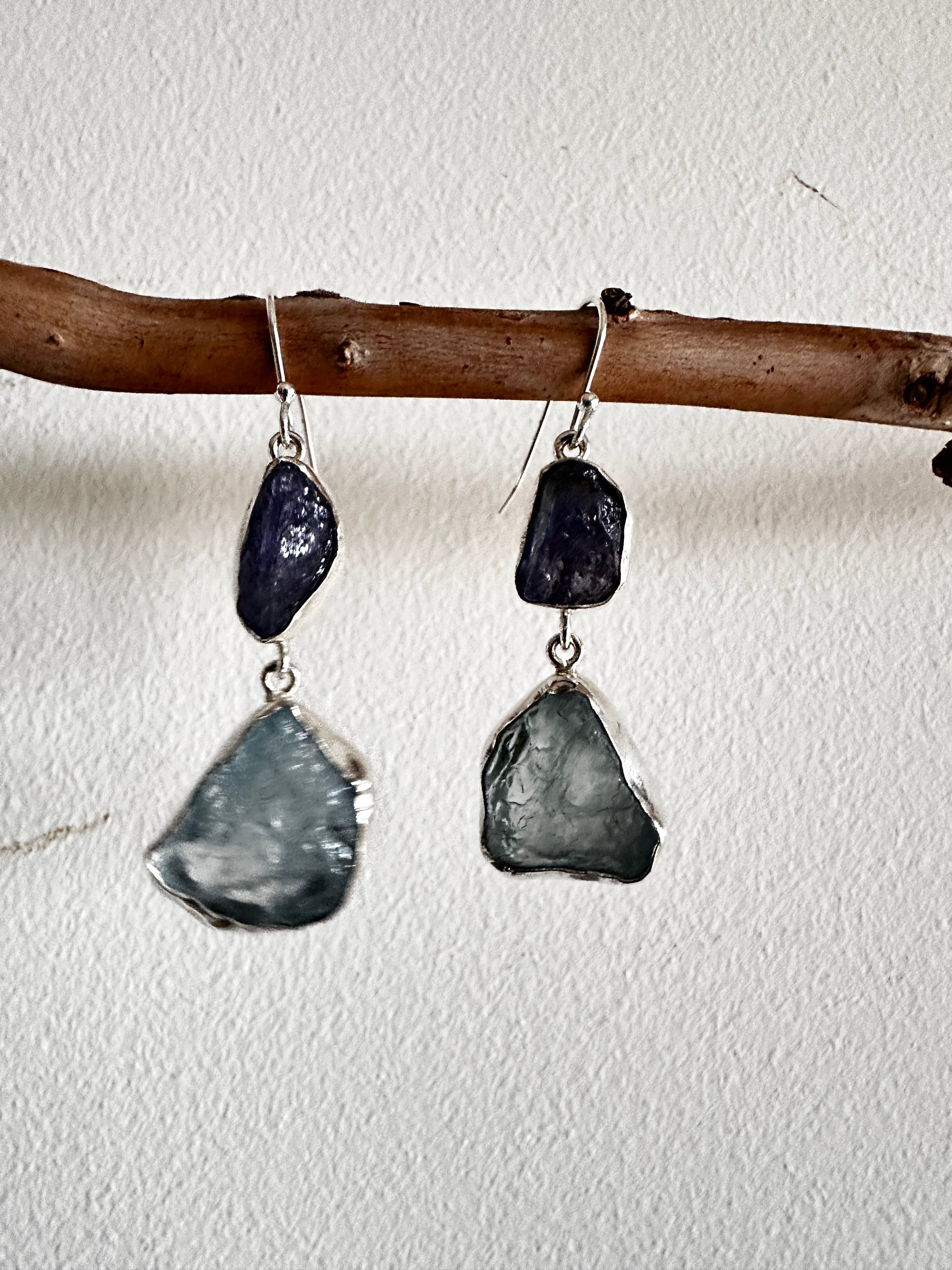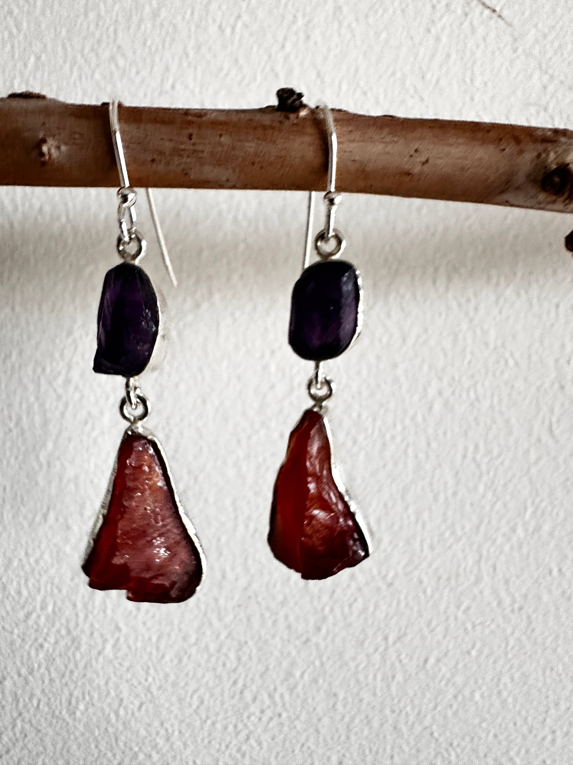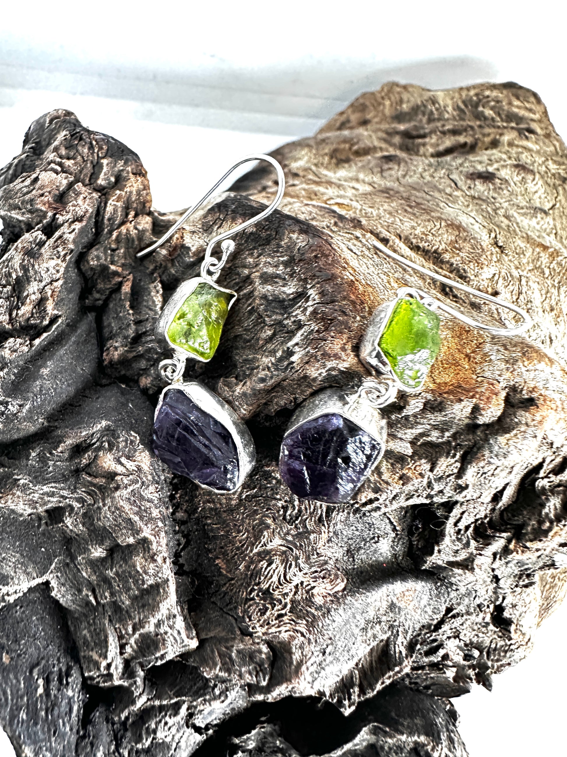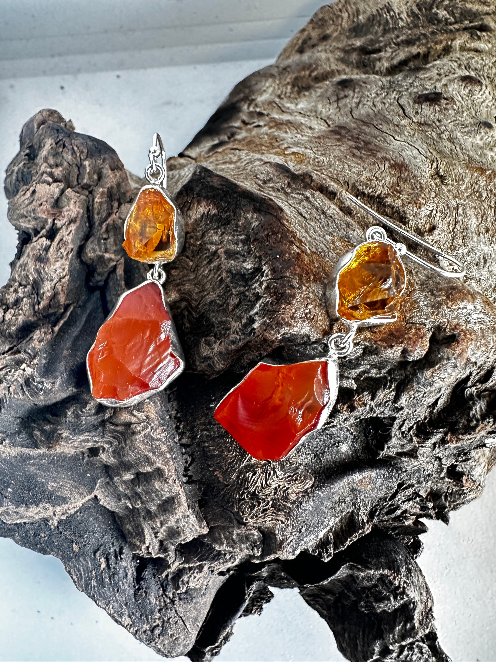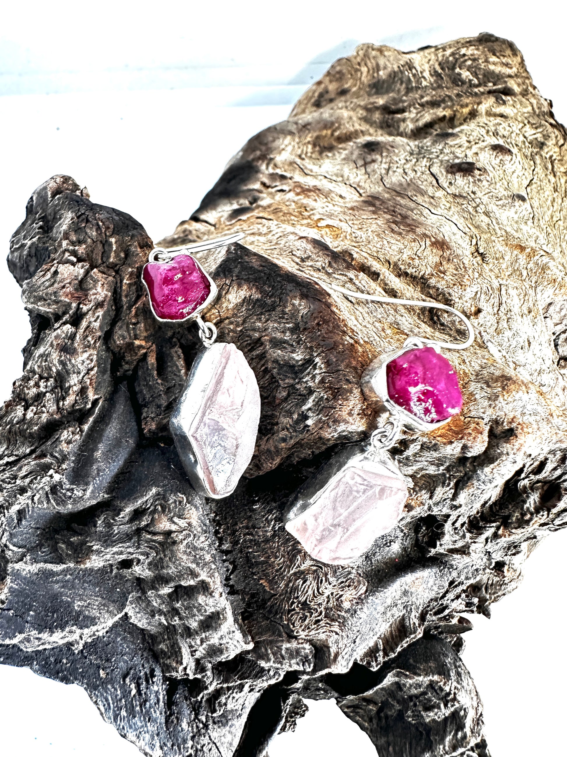 Raw Candy earrings showcase striking raw natural stones set in sterling silver, designed as elegant double drops. The naturally contrasting textures and hues highlight the organic beauty of each stone, while the sterling silver setting provides a refined, durable framework. These earrings offer a sophisticated yet earthy aesthetic, perfect for those who appreciate unique, expert-crafted jewelry that emphasizes natural individuality.