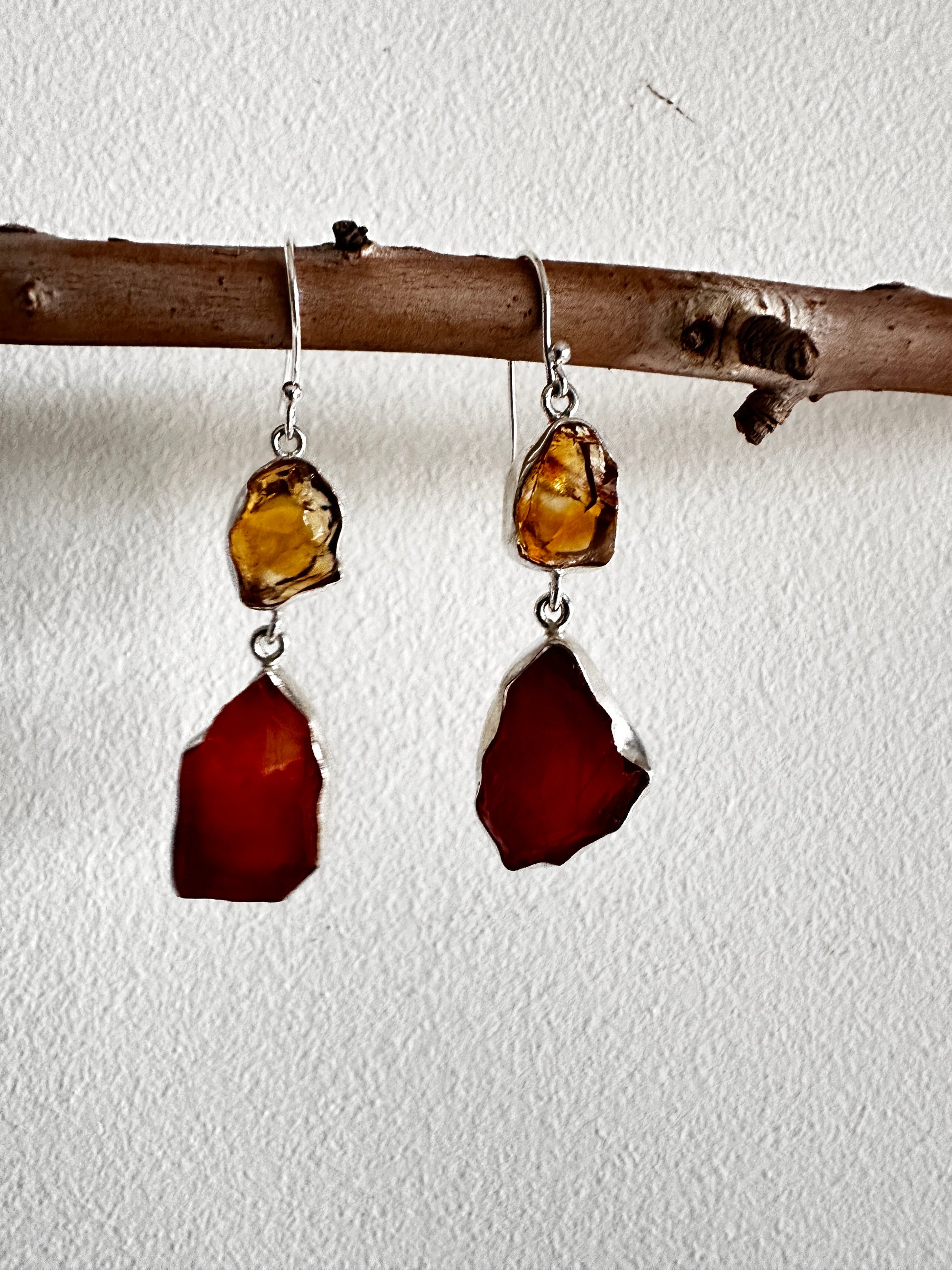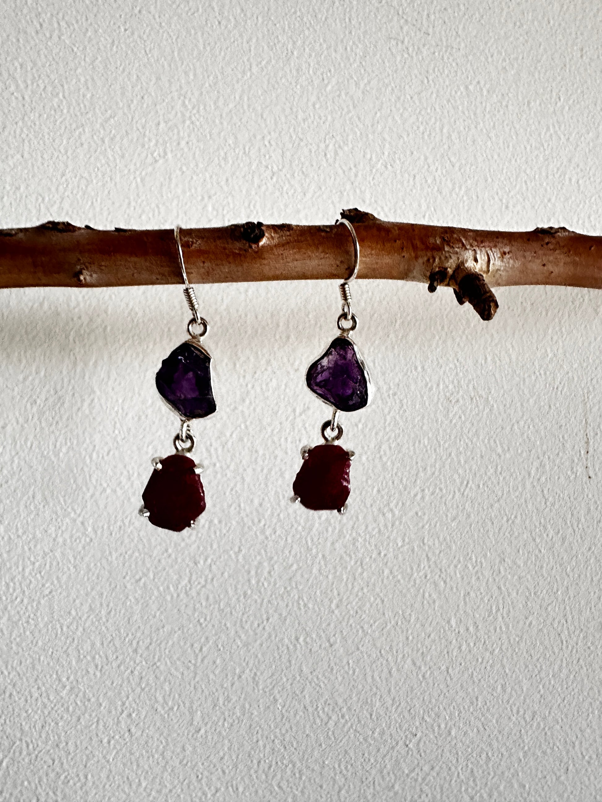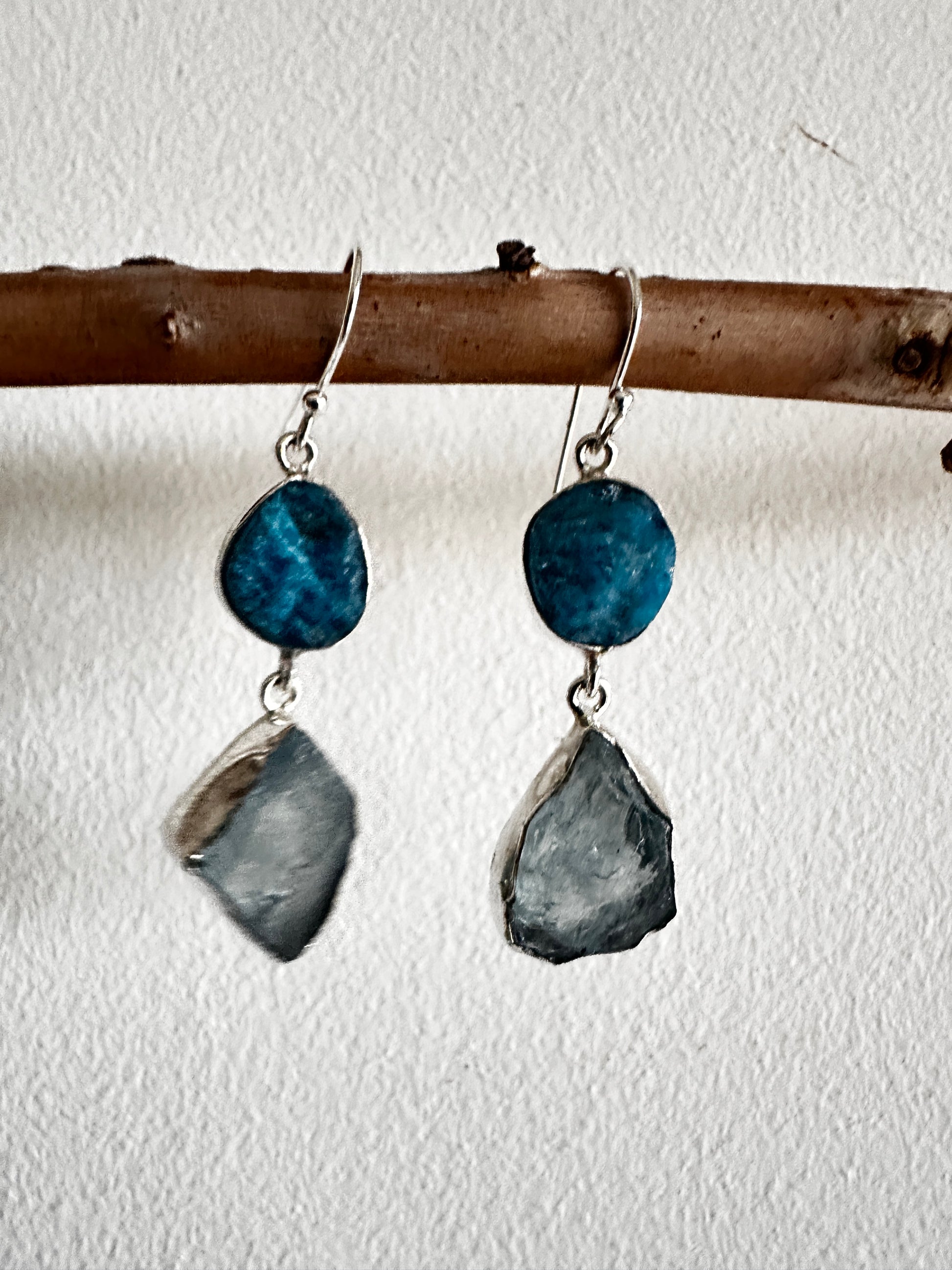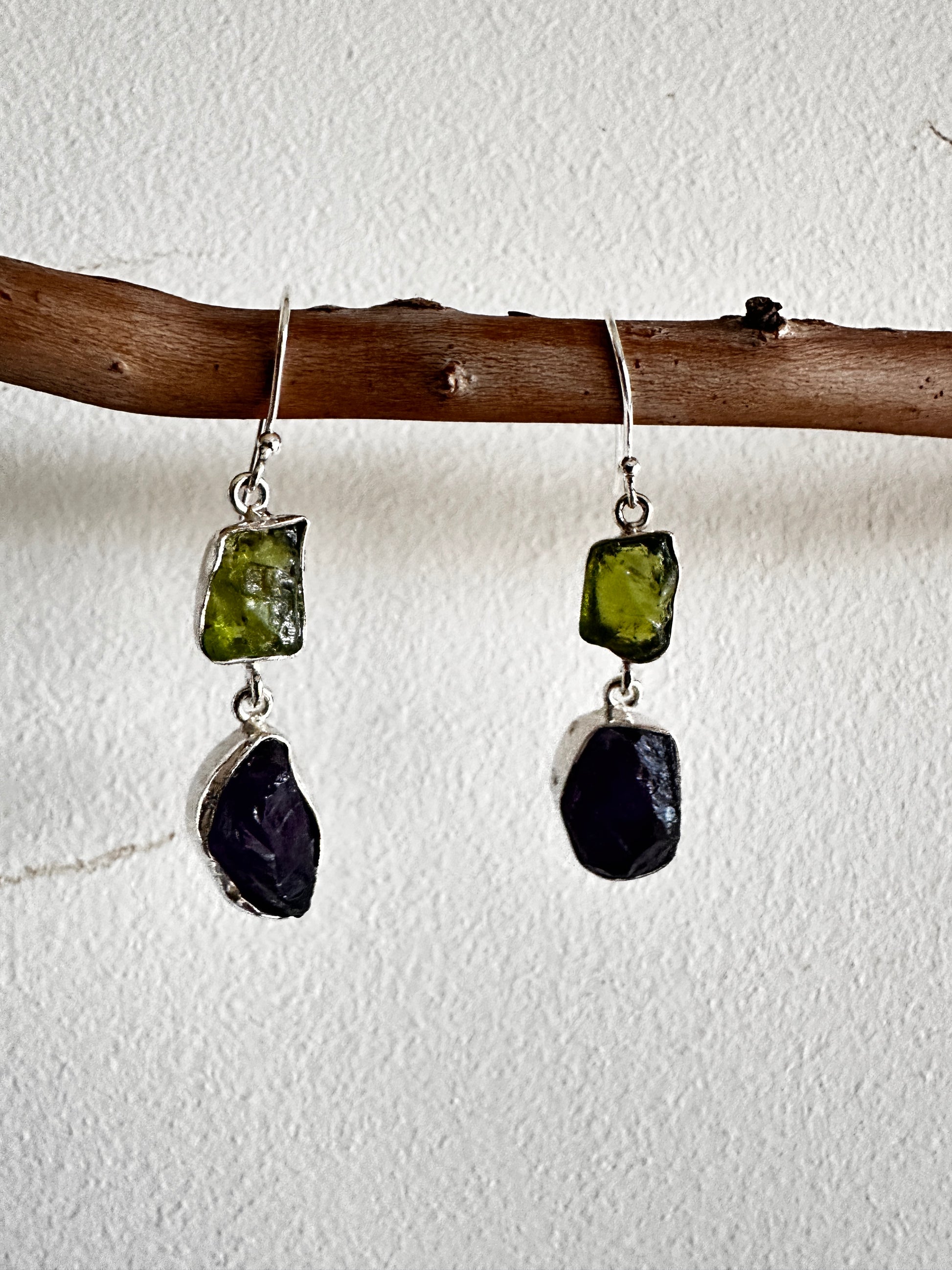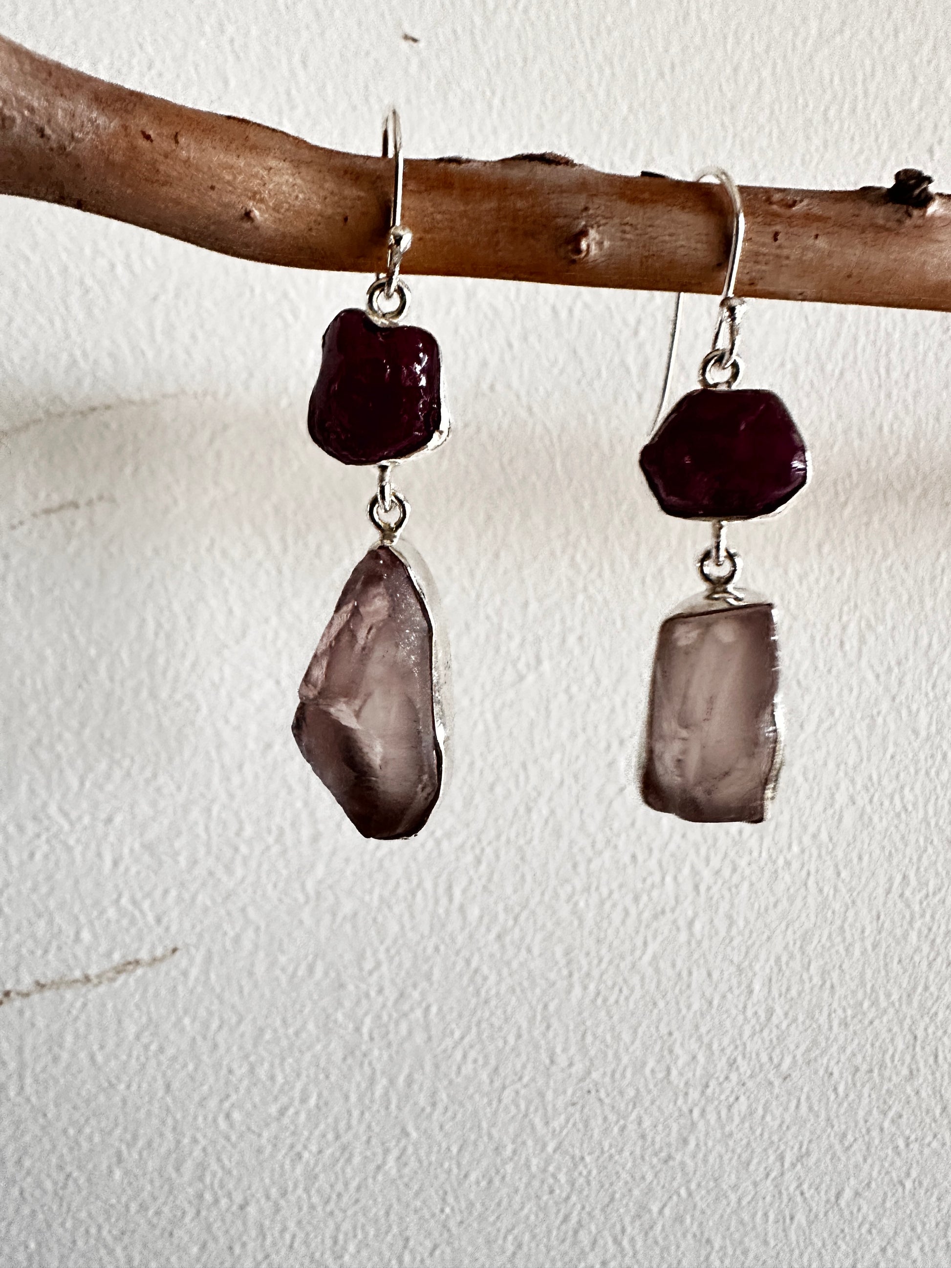 Raw Candy earrings showcase striking raw natural stones set in sterling silver, designed as elegant double drops. The naturally contrasting textures and hues highlight the organic beauty of each stone, while the sterling silver setting provides a refined, durable framework. These earrings offer a sophisticated yet earthy aesthetic, perfect for those who appreciate unique, expert-crafted jewelry that emphasizes natural individuality.